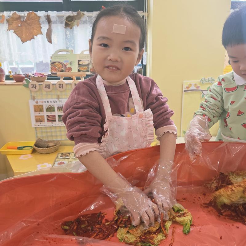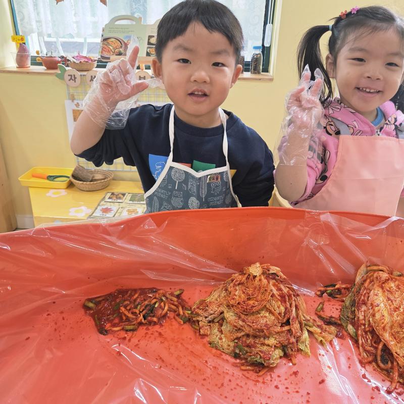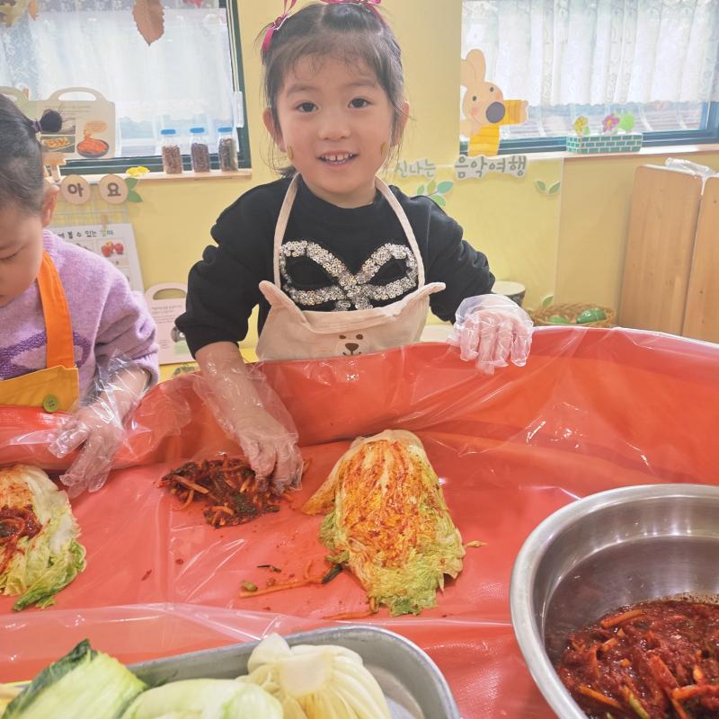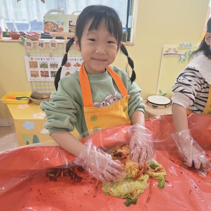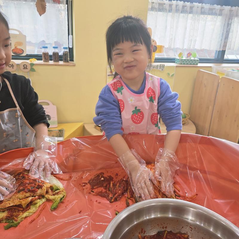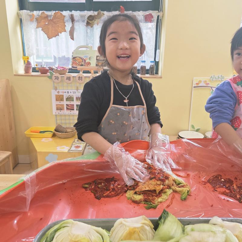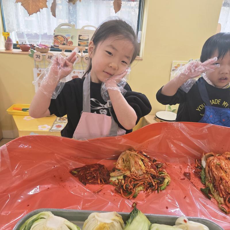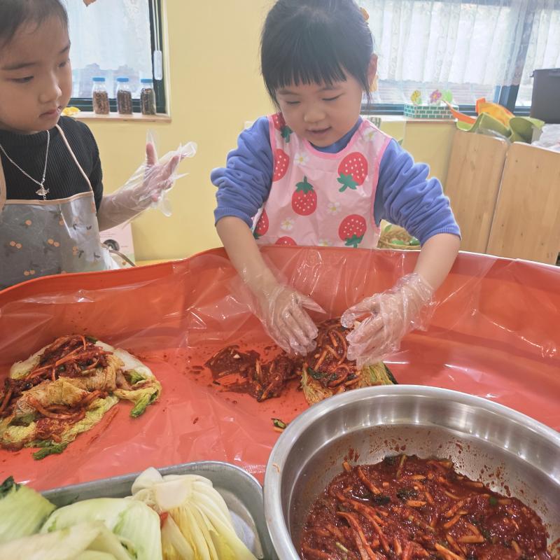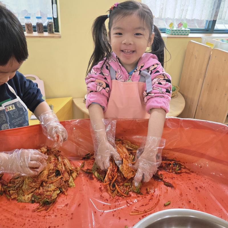 추운 겨울이 오기 전 다함께 도란도란 모여 겨울동안 먹을 수 있는 김장을 하며 따뜻한 마음을 나누는 축제의 날❄️☃️ 고사리 같은 귀여운 손으로 배춧잎을 마치 책장 넘기듯이 배추소를 쏘오옥 넣으며엄마 아빠가 된 든 정성껏 김장 담그는 모습에진지함이 느껴졌답니다. 평소 김치가 매워서 먹기 어려워했던 친구들도오늘은 용기를 내어 우리가 담근 김장 김치를 맛보며“맛있어요, 더 주세요” 하며 활짝 웃는 모습에 사랑스러움이 뿜뿜*^^*🌶️🧅🧄
