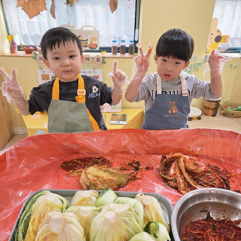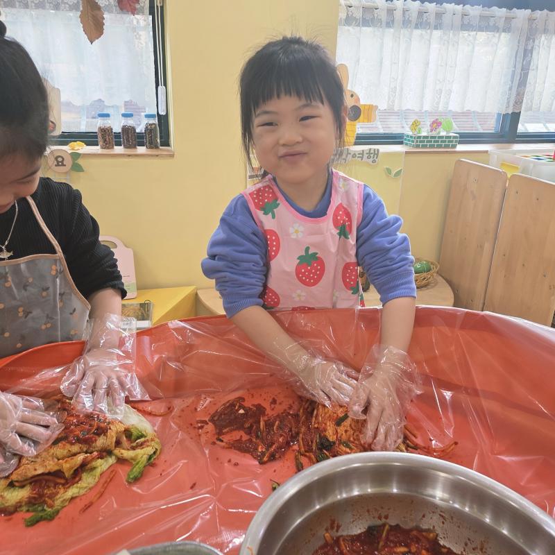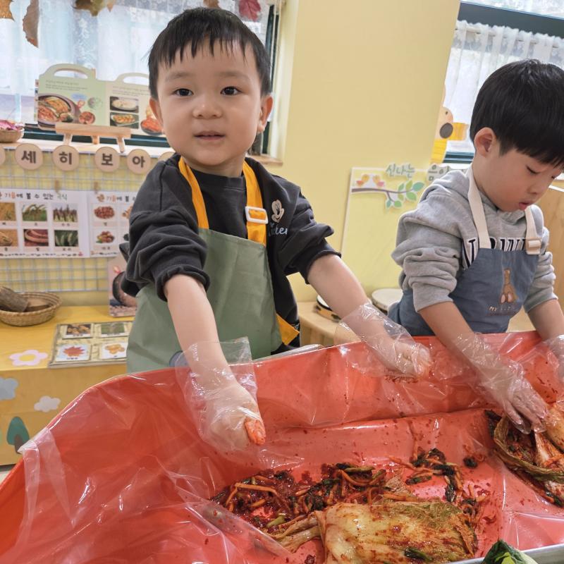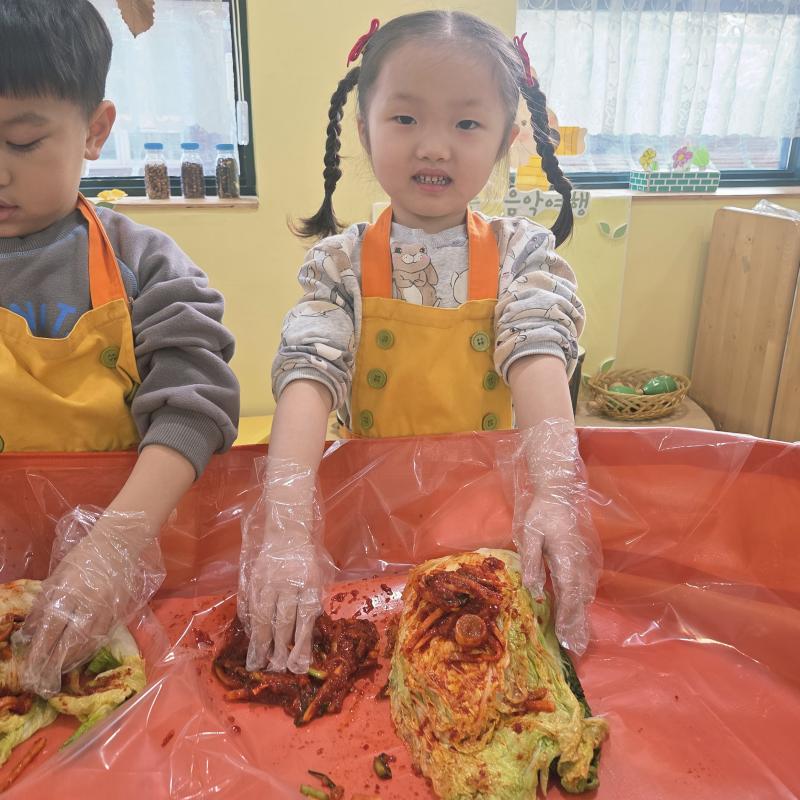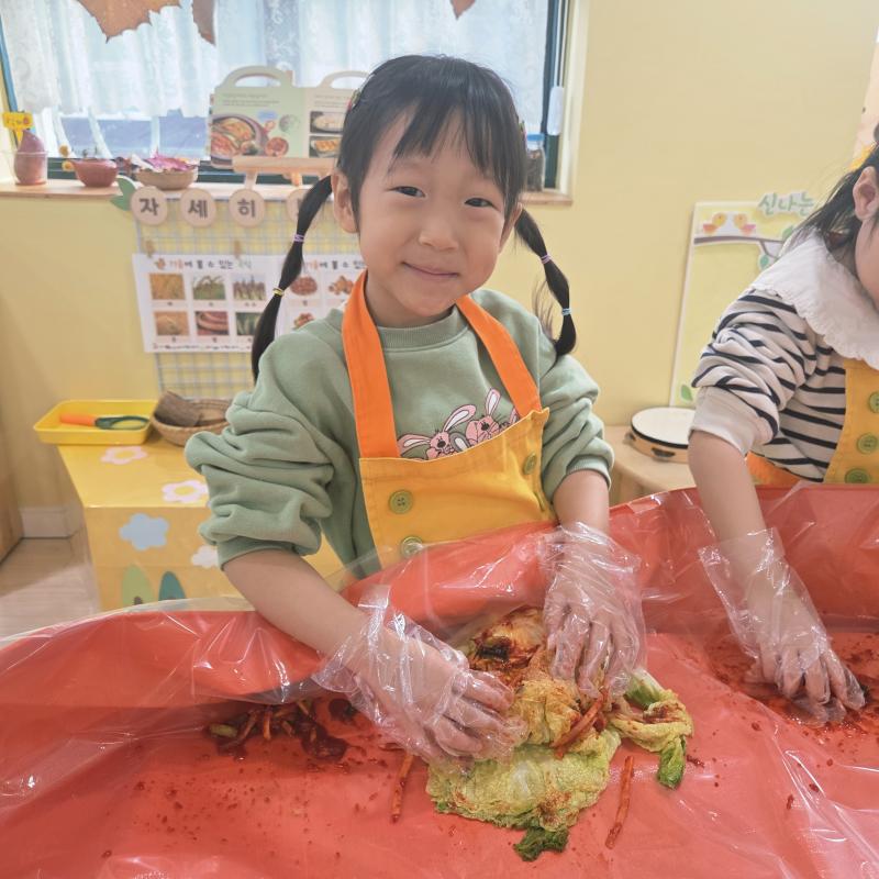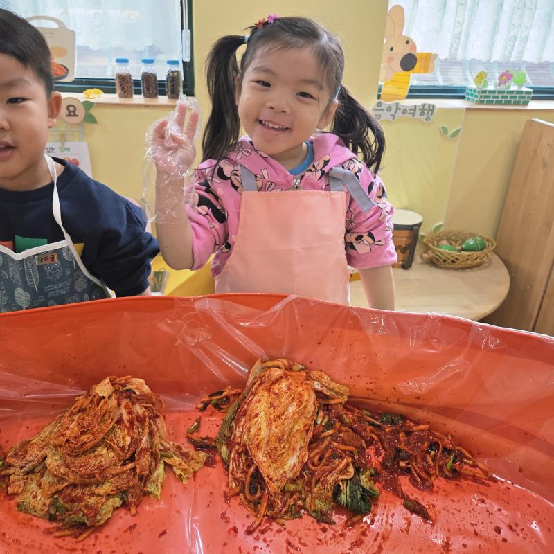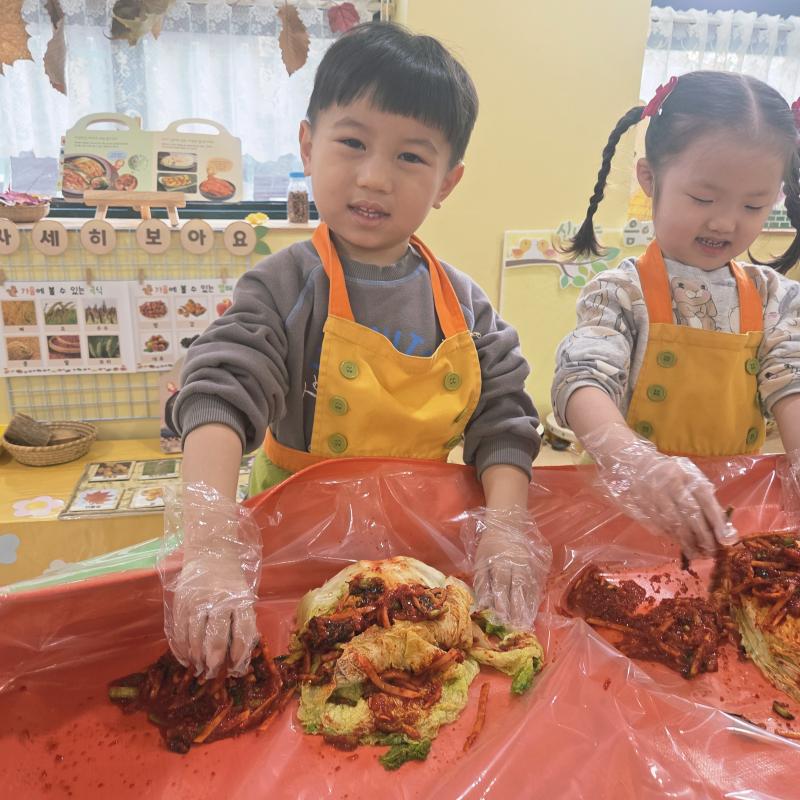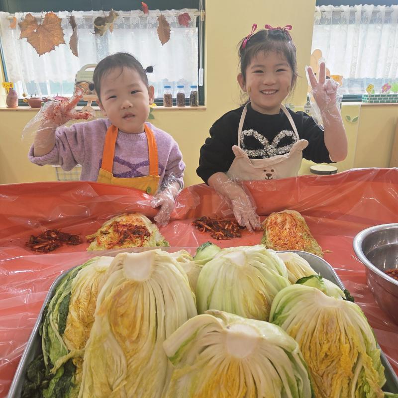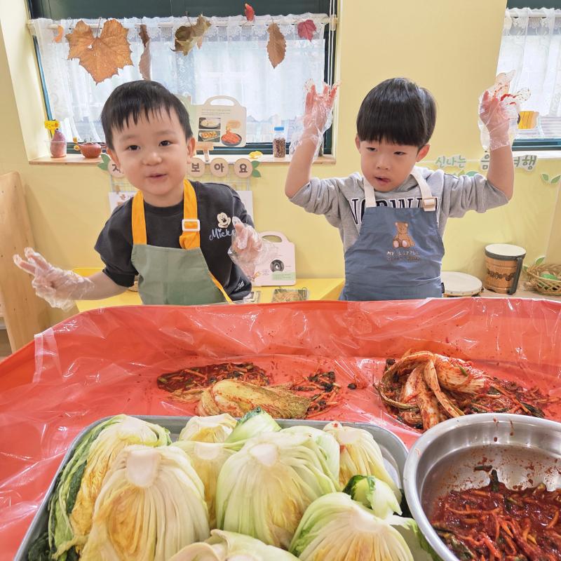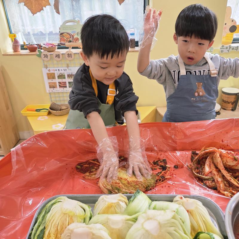 추운 겨울이 오기 전 다함께 도란도란 모여 겨울동안 먹을 수 있는 김장을 하며 따뜻한 마음을 나누는 축제의 날❄️☃️ 고사리 같은 귀여운 손으로 배춧잎을 마치 책장 넘기듯이 배추소를 쏘오옥 넣으며엄마 아빠가 된 든 정성껏 김장 담그는 모습에진지함이 느껴졌답니다. 평소 김치가 매워서 먹기 어려워했던 친구들도오늘은 용기를 내어 우리가 담근 김장 김치를 맛보며“맛있어요, 더 주세요” 하며 활짝 웃는 모습에 사랑스러움이 뿜뿜*^^*🌶️🧅🧄