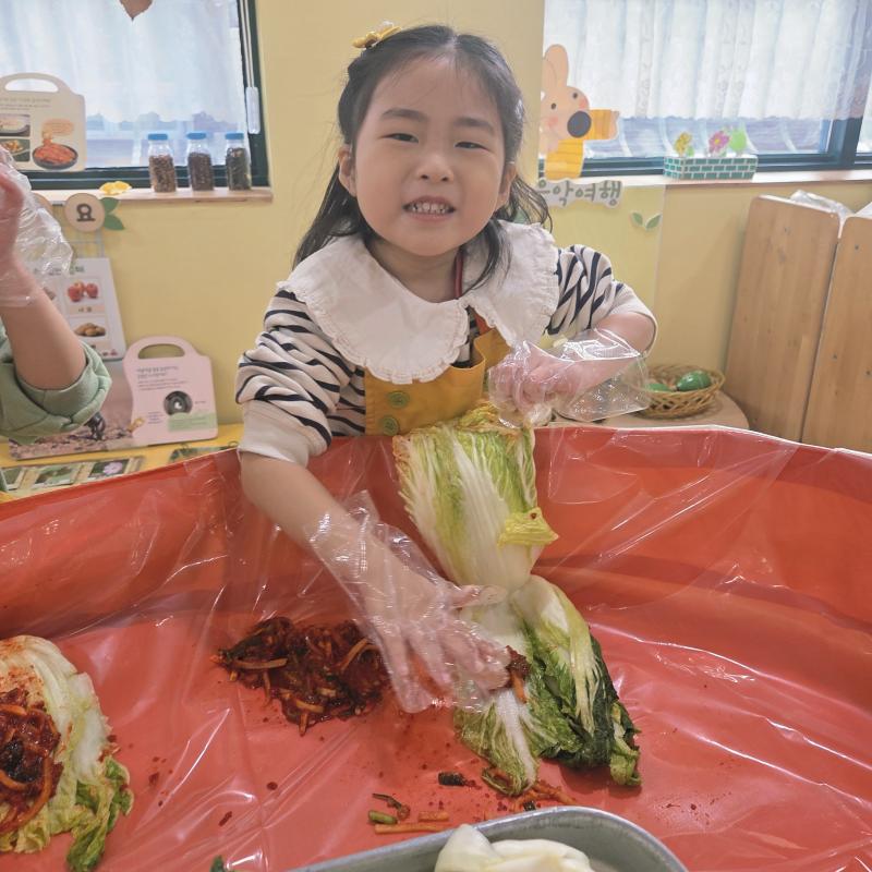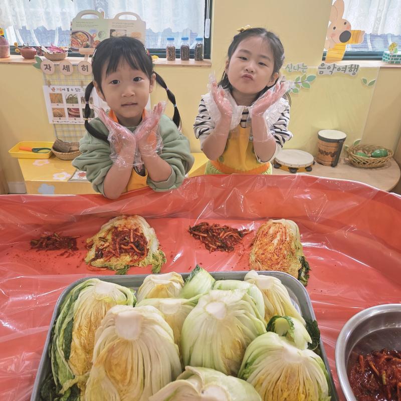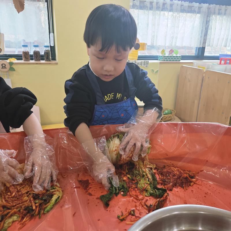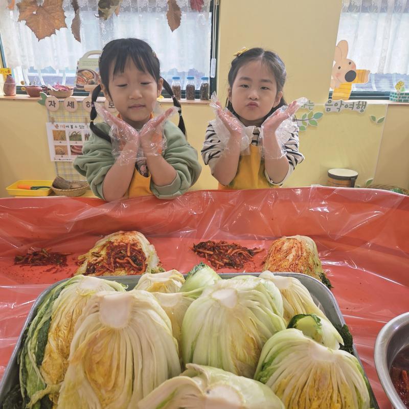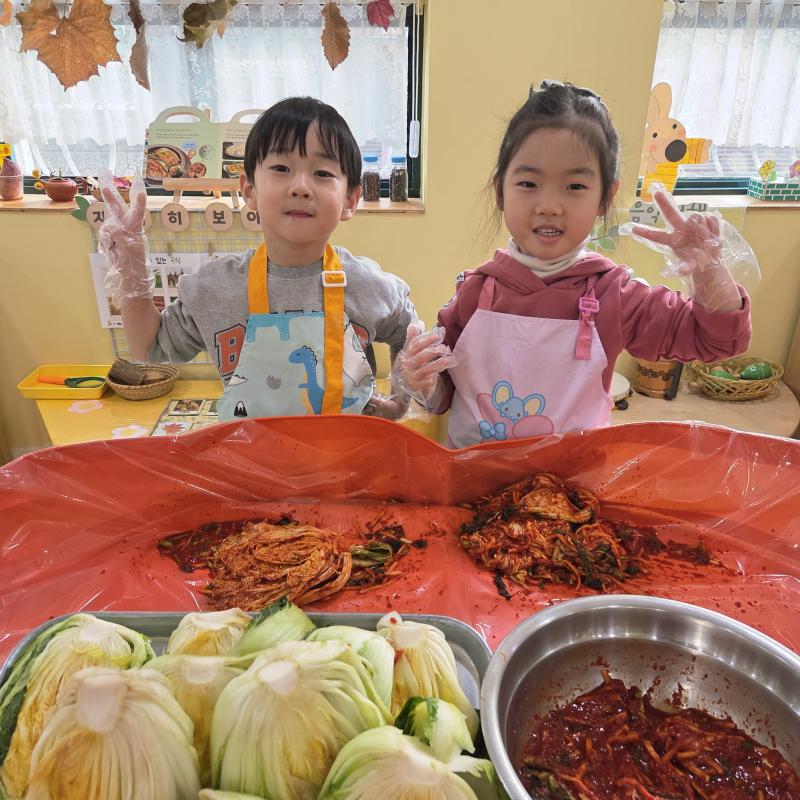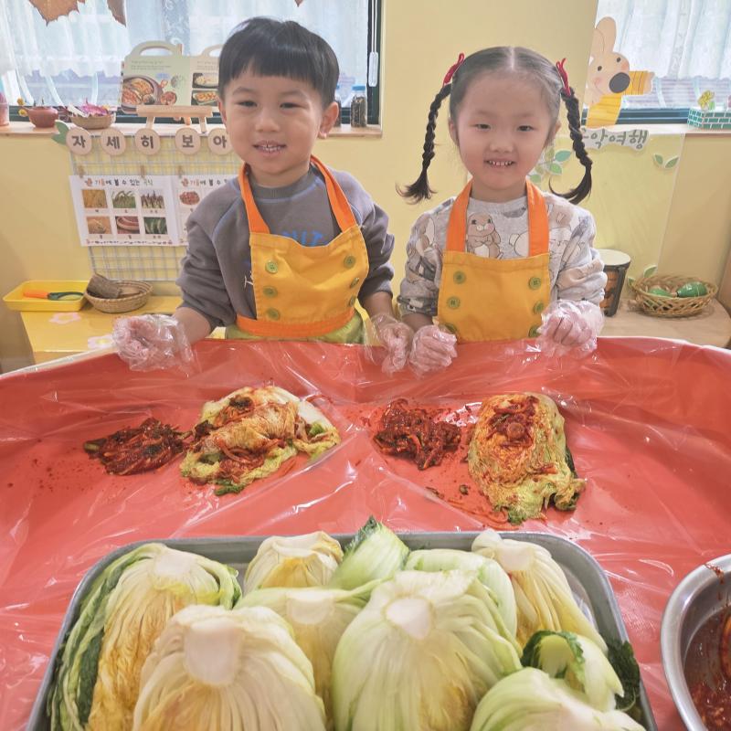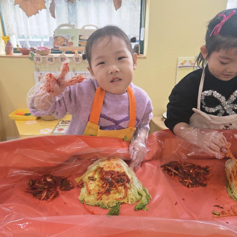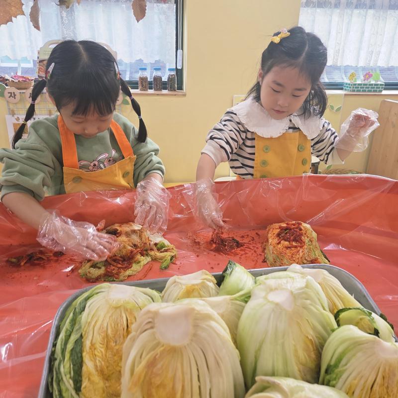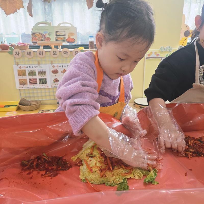 추운 겨울이 오기 전 다함께 도란도란 모여 겨울동안 먹을 수 있는 김장을 하며 따뜻한 마음을 나누는 축제의 날❄️☃️ 고사리 같은 귀여운 손으로 배춧잎을 마치 책장 넘기듯이 배추소를 쏘오옥 넣으며엄마 아빠가 된 든 정성껏 김장 담그는 모습에진지함이 느껴졌답니다. 평소 김치가 매워서 먹기 어려워했던 친구들도오늘은 용기를 내어 우리가 담근 김장 김치를 맛보며“맛있어요, 더 주세요” 하며 활짝 웃는 모습에 사랑스러움이 뿜뿜*^^*🌶️🧅🧄