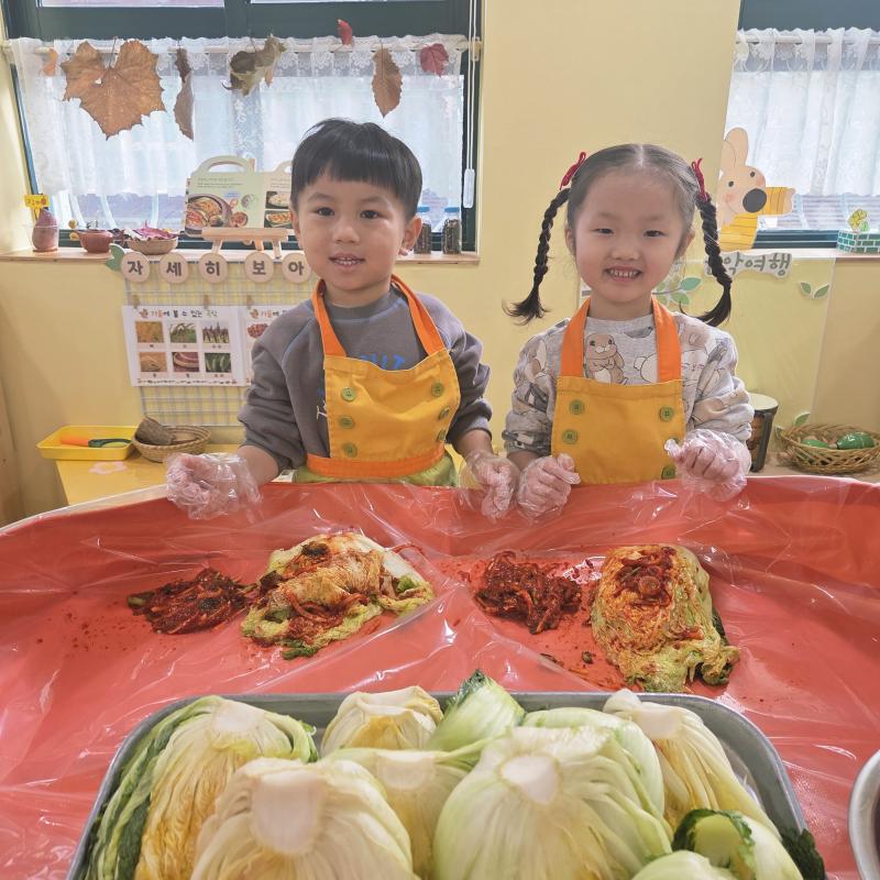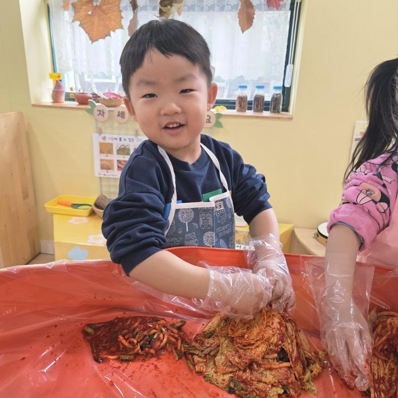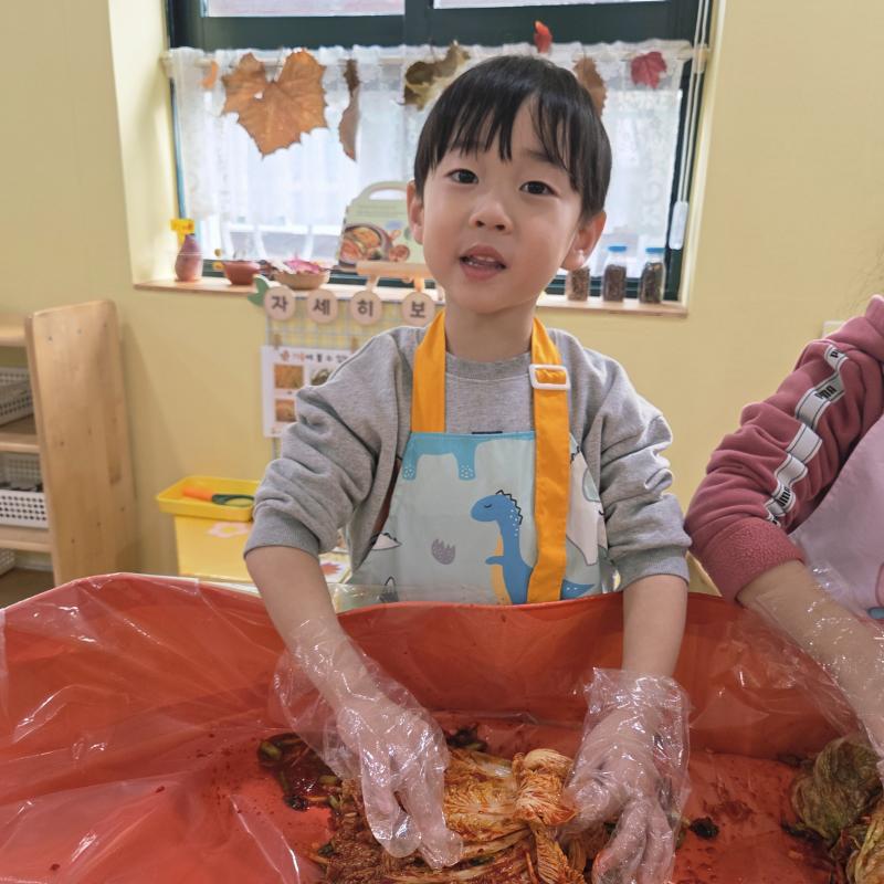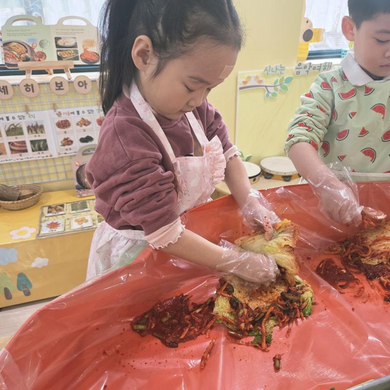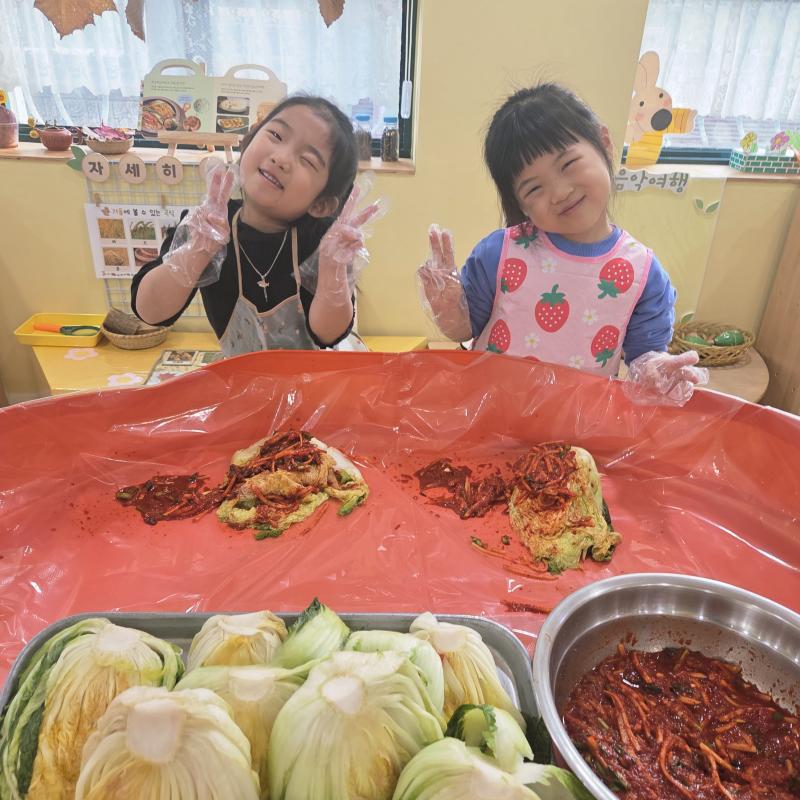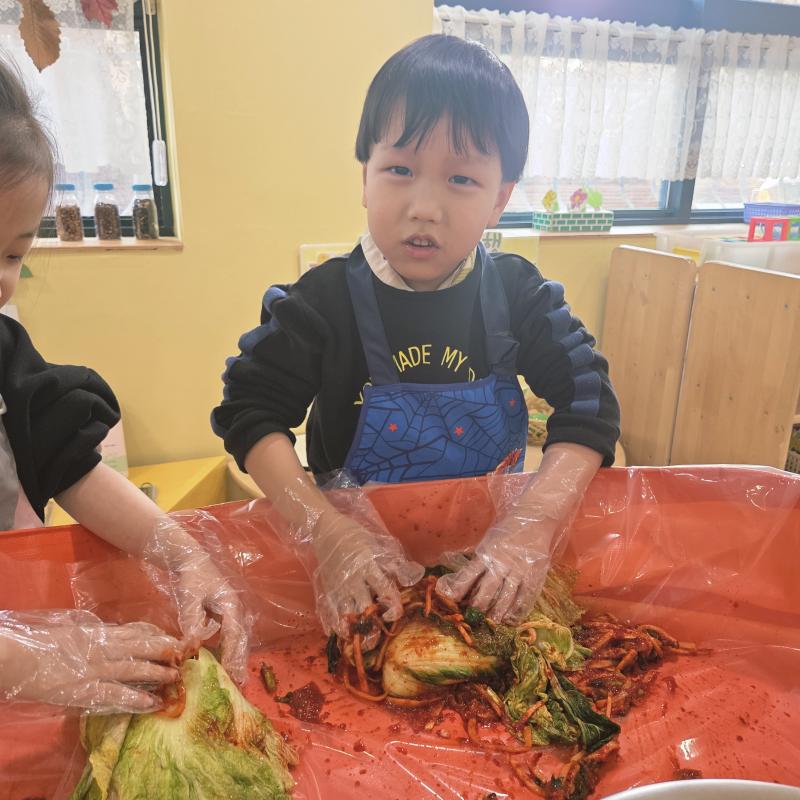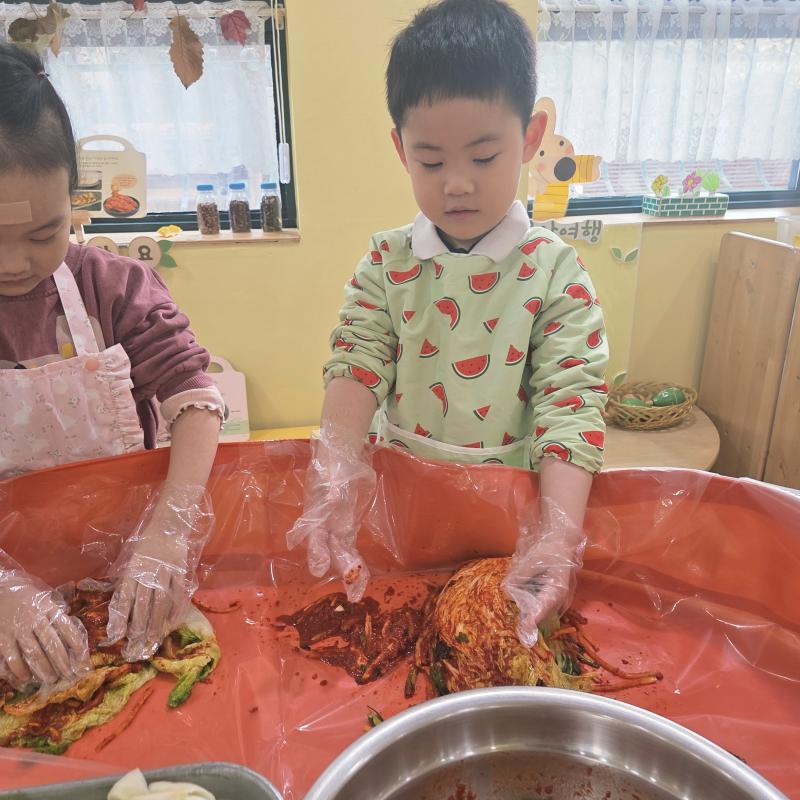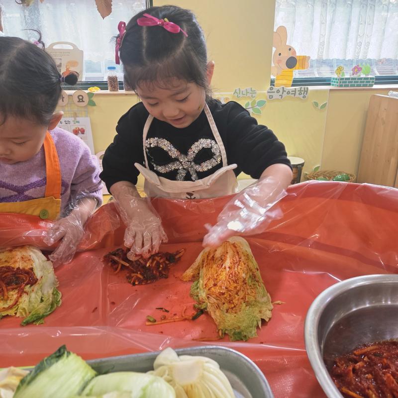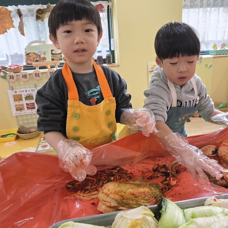 추운 겨울이 오기 전 다함께 도란도란 모여 겨울동안 먹을 수 있는 김장을 하며 따뜻한 마음을 나누는 축제의 날❄️☃️ 고사리 같은 귀여운 손으로 배춧잎을 마치 책장 넘기듯이 배추소를 쏘오옥 넣으며엄마 아빠가 된 든 정성껏 김장 담그는 모습에진지함이 느껴졌답니다. 평소 김치가 매워서 먹기 어려워했던 친구들도오늘은 용기를 내어 우리가 담근 김장 김치를 맛보며“맛있어요, 더 주세요” 하며 활짝 웃는 모습에 사랑스러움이 뿜뿜*^^*🌶️🧅🧄