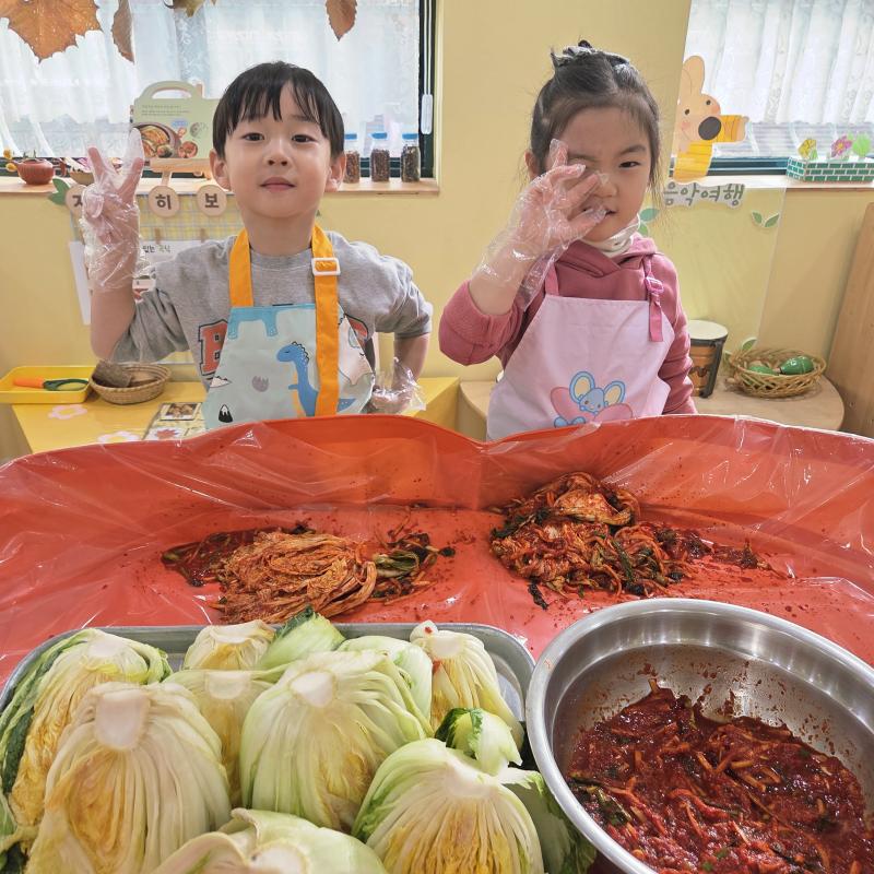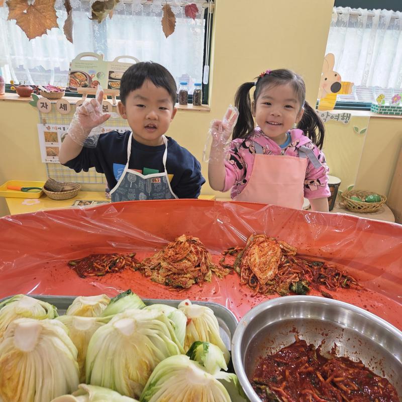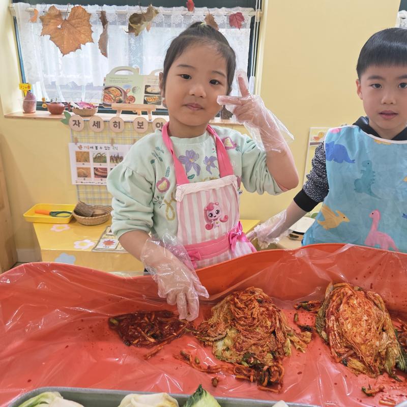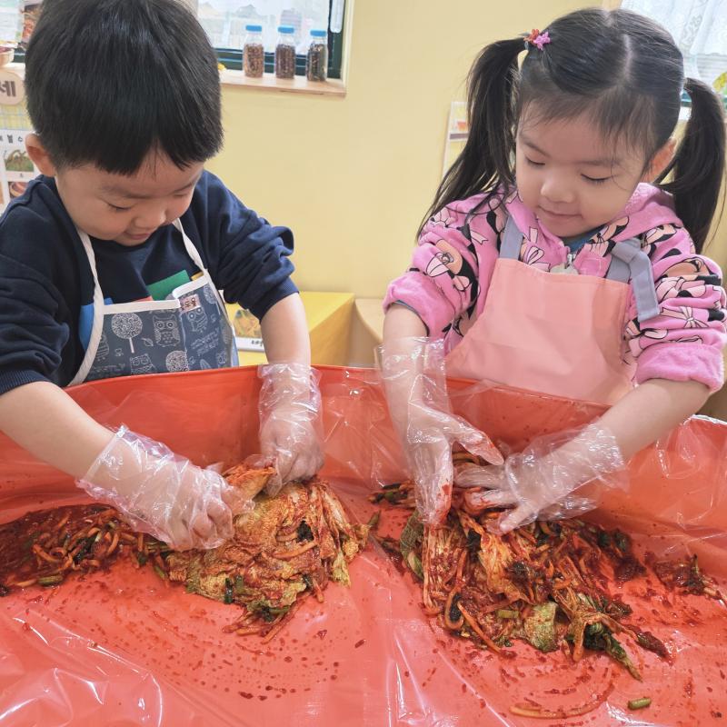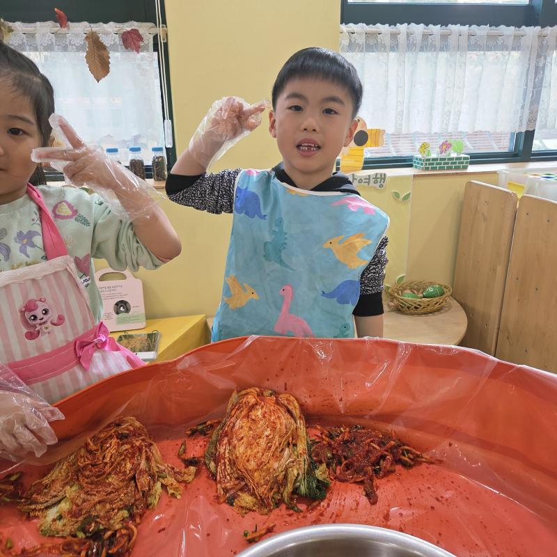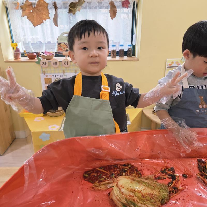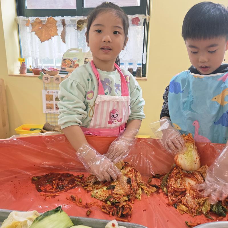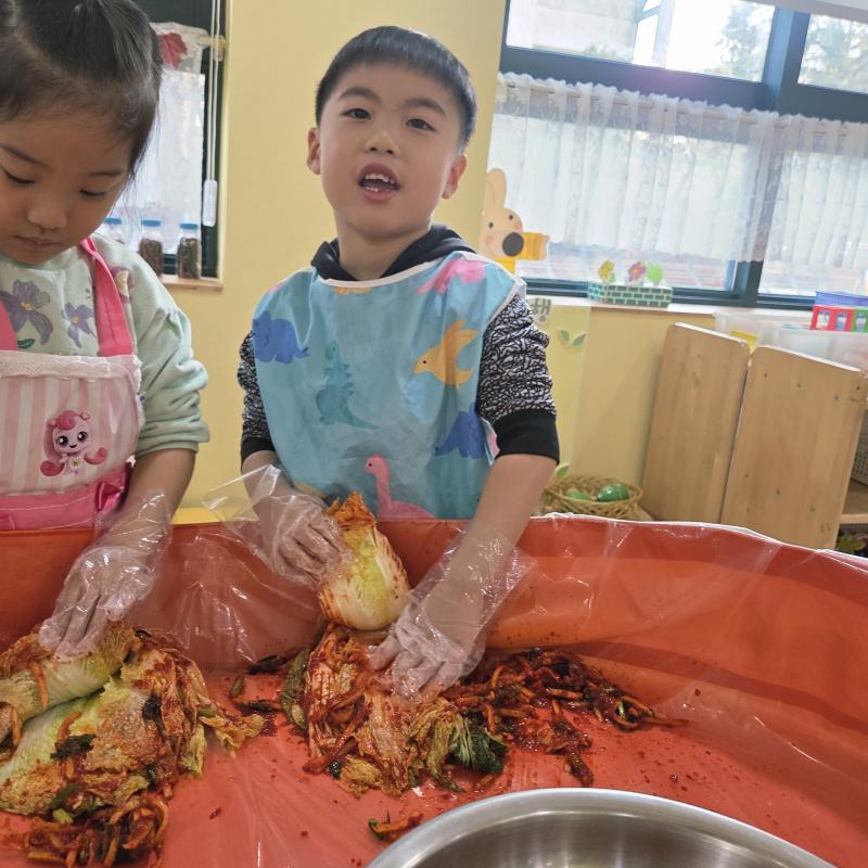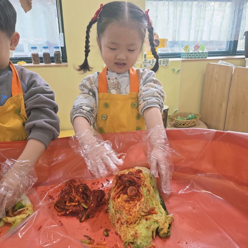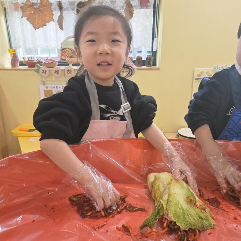 추운 겨울이 오기 전 다함께 도란도란 모여 겨울동안 먹을 수 있는 김장을 하며 따뜻한 마음을 나누는 축제의 날❄️☃️ 고사리 같은 귀여운 손으로 배춧잎을 마치 책장 넘기듯이 배추소를 쏘오옥 넣으며엄마 아빠가 된 든 정성껏 김장 담그는 모습에진지함이 느껴졌답니다. 평소 김치가 매워서 먹기 어려워했던 친구들도오늘은 용기를 내어 우리가 담근 김장 김치를 맛보며“맛있어요, 더 주세요” 하며 활짝 웃는 모습에 사랑스러움이 뿜뿜*^^*🌶️🧅🧄