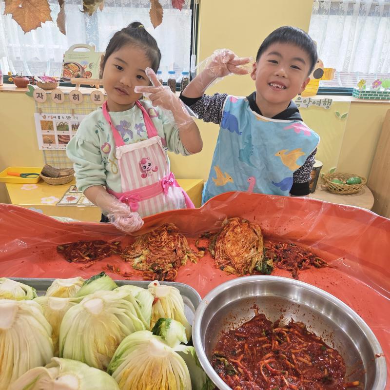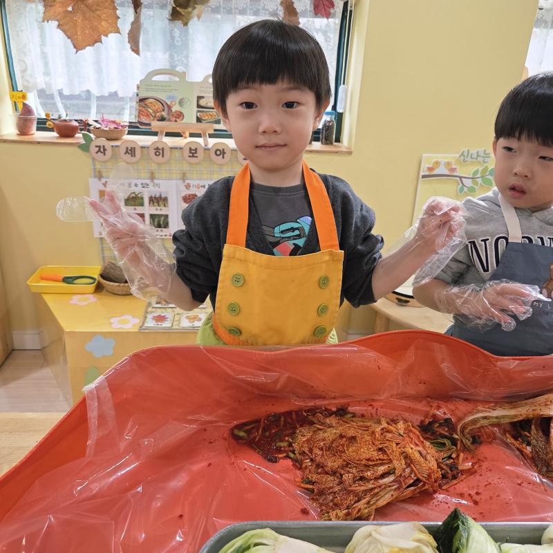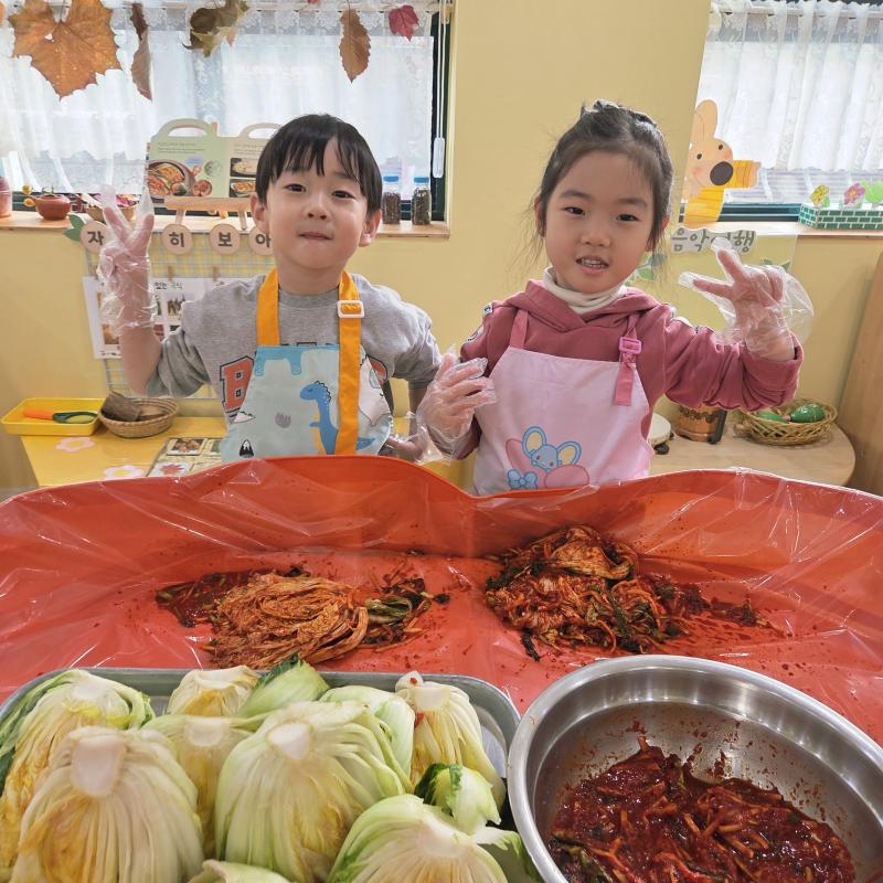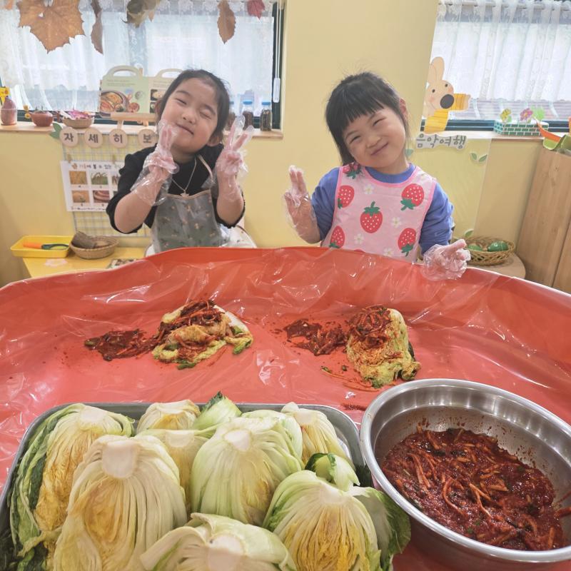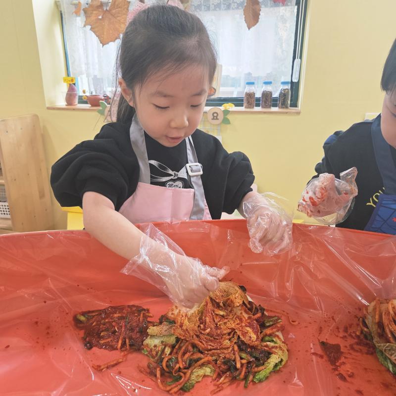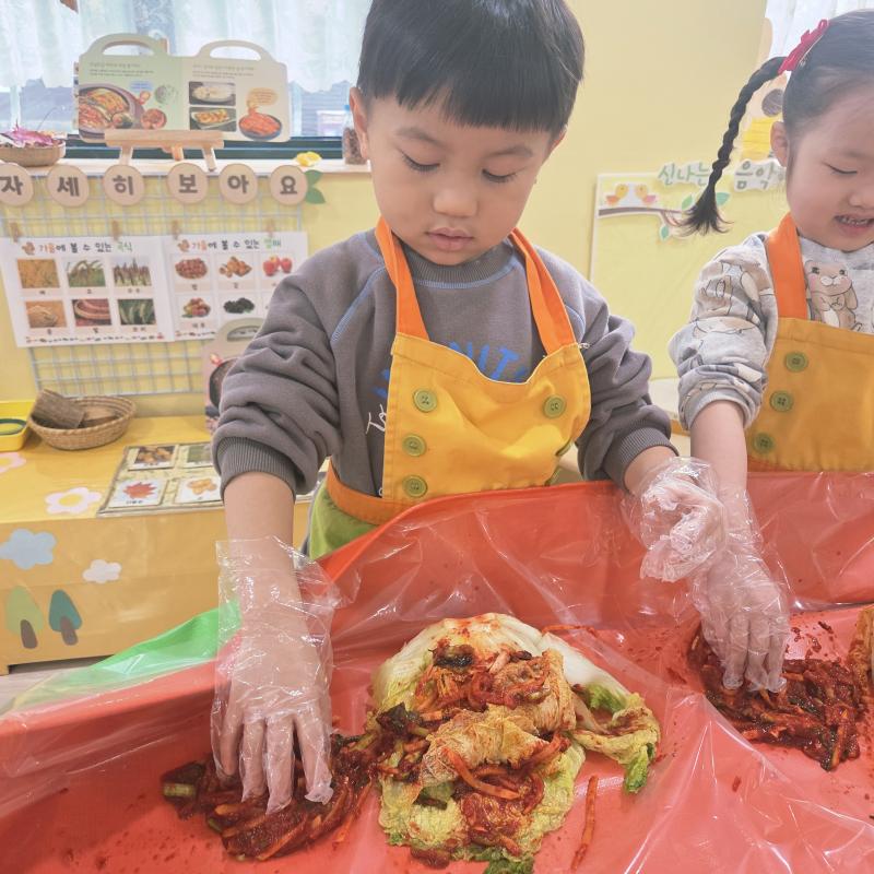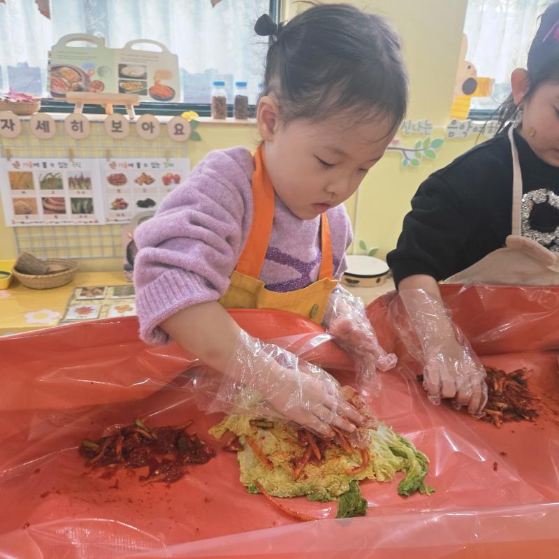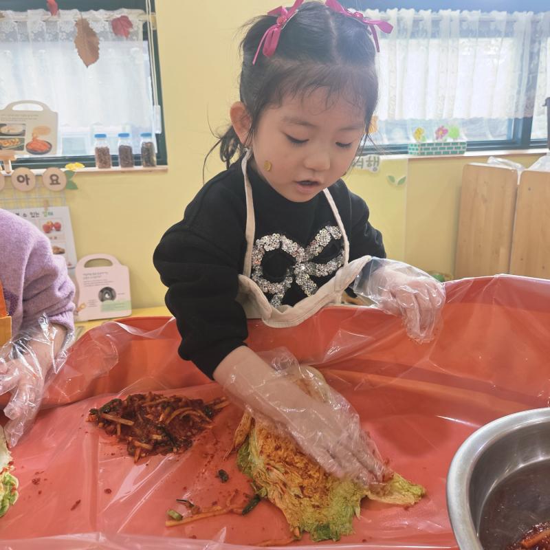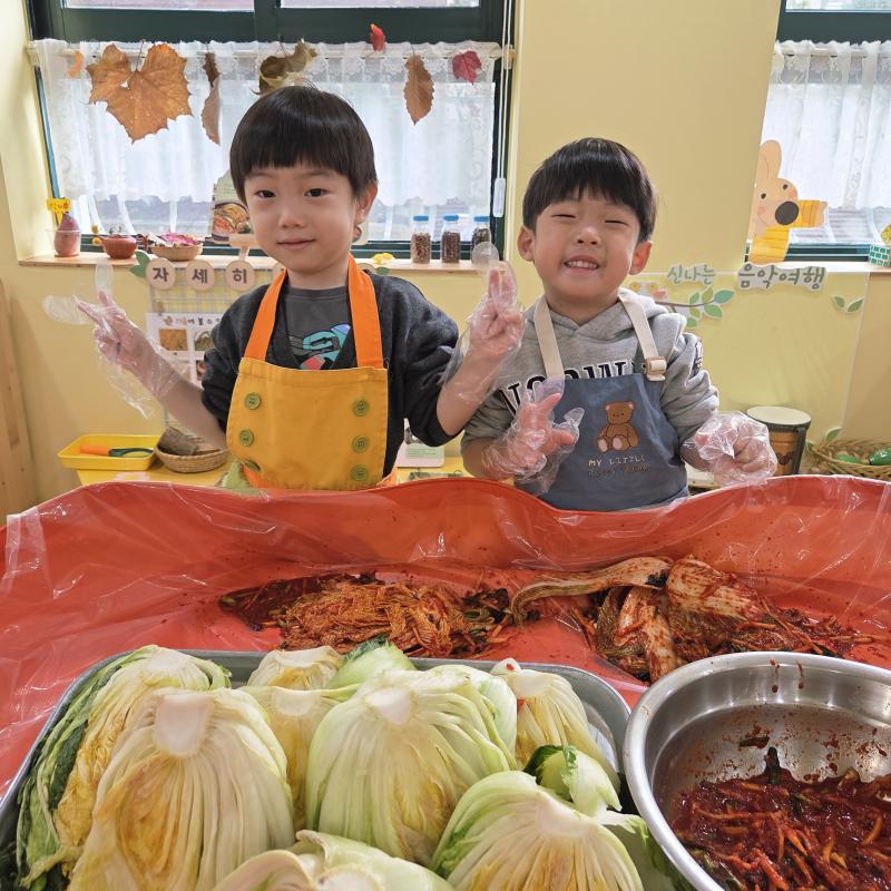 추운 겨울이 오기 전 다함께 도란도란 모여 겨울동안 먹을 수 있는 김장을 하며 따뜻한 마음을 나누는 축제의 날❄️☃️ 고사리 같은 귀여운 손으로 배춧잎을 마치 책장 넘기듯이 배추소를 쏘오옥 넣으며엄마 아빠가 된 든 정성껏 김장 담그는 모습에진지함이 느껴졌답니다. 평소 김치가 매워서 먹기 어려워했던 친구들도오늘은 용기를 내어 우리가 담근 김장 김치를 맛보며“맛있어요, 더 주세요” 하며 활짝 웃는 모습에 사랑스러움이 뿜뿜*^^*🌶️🧅🧄