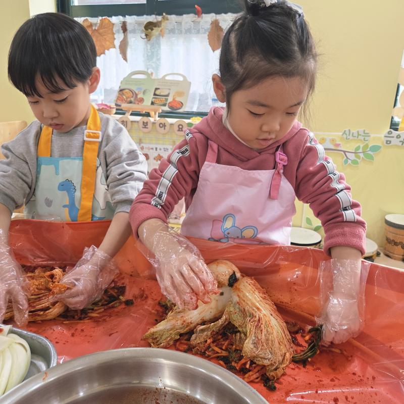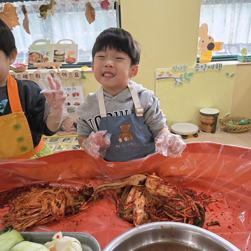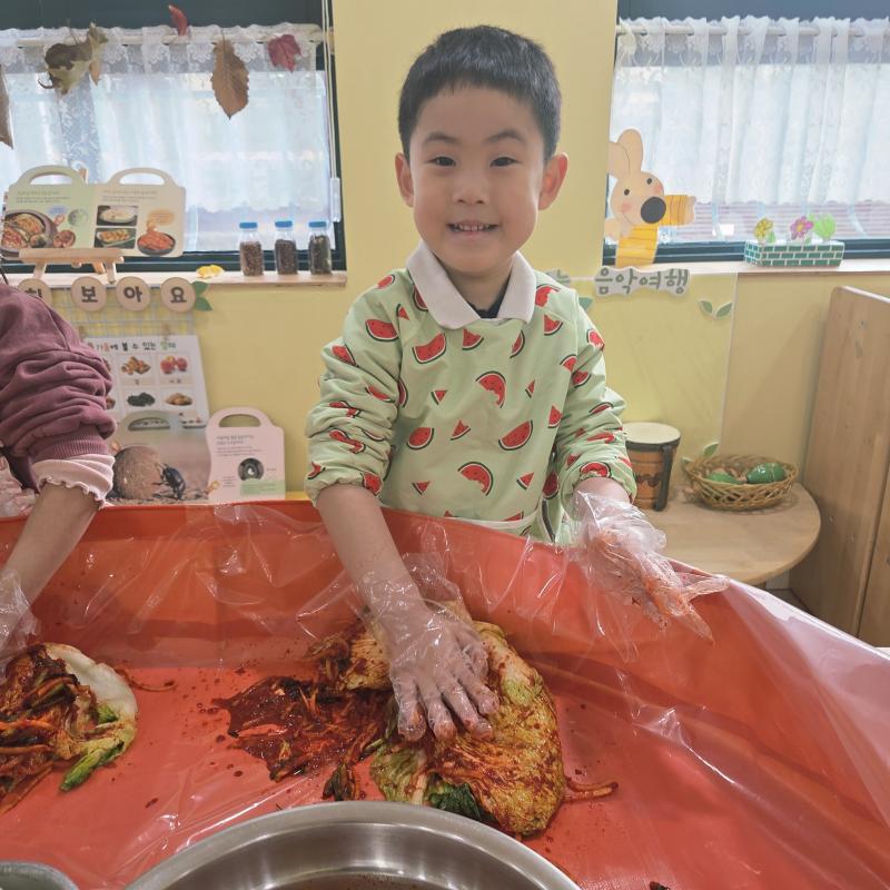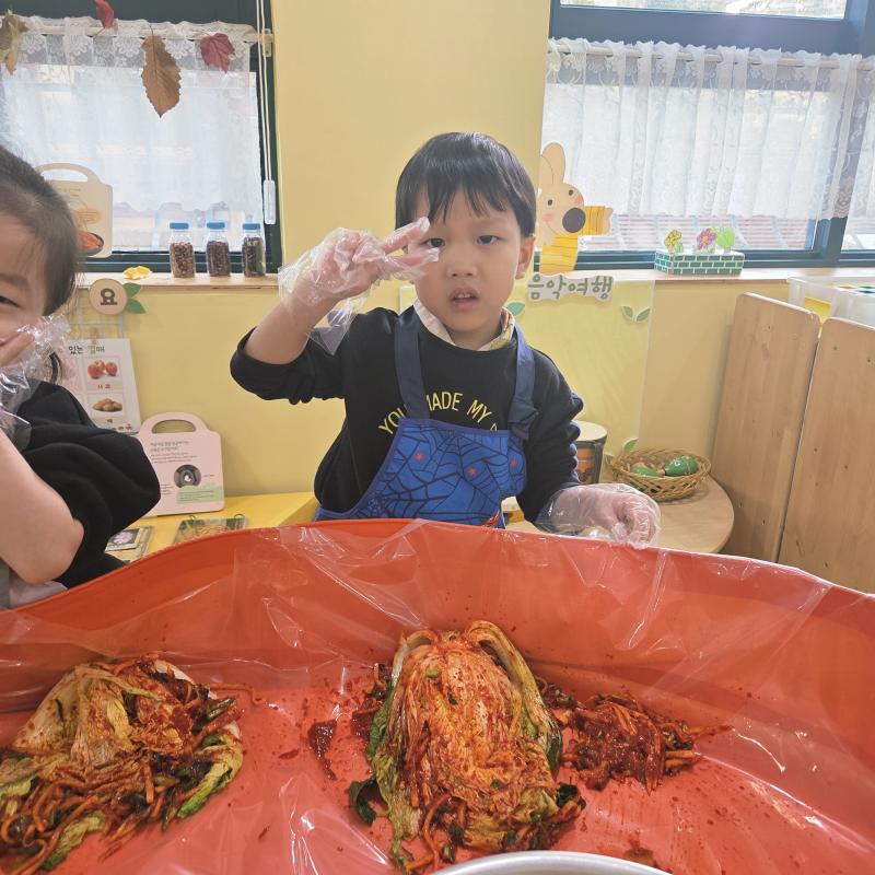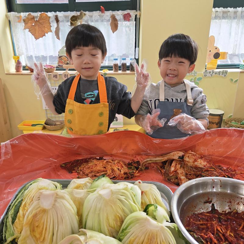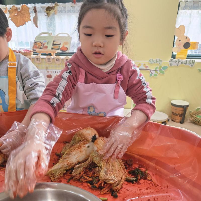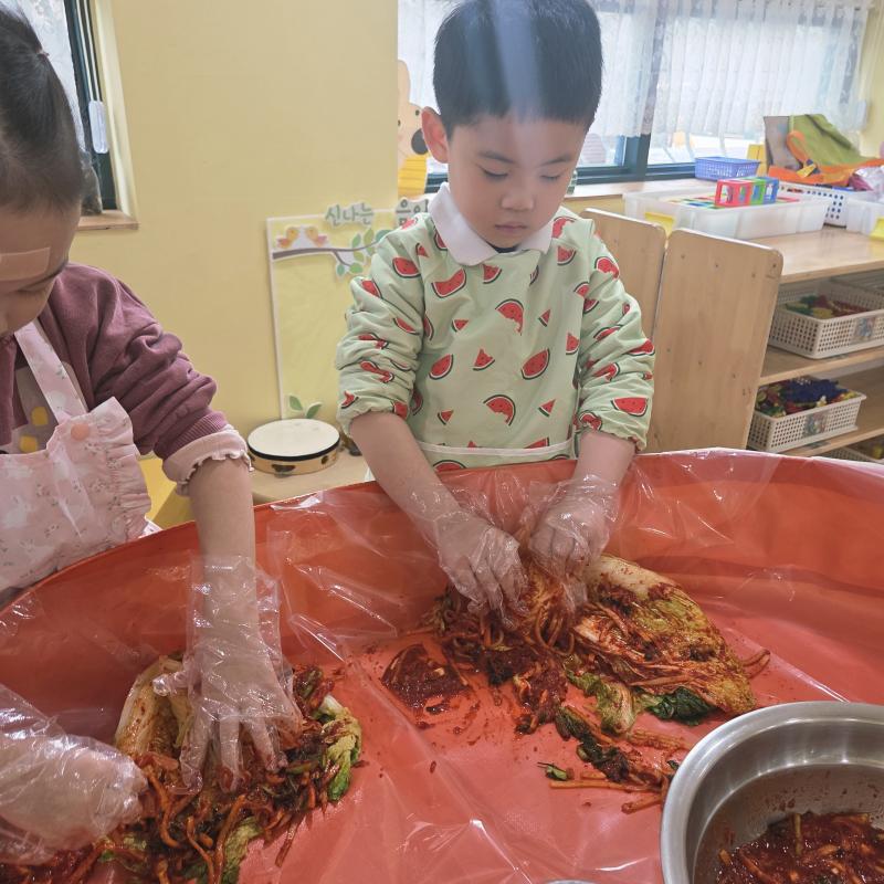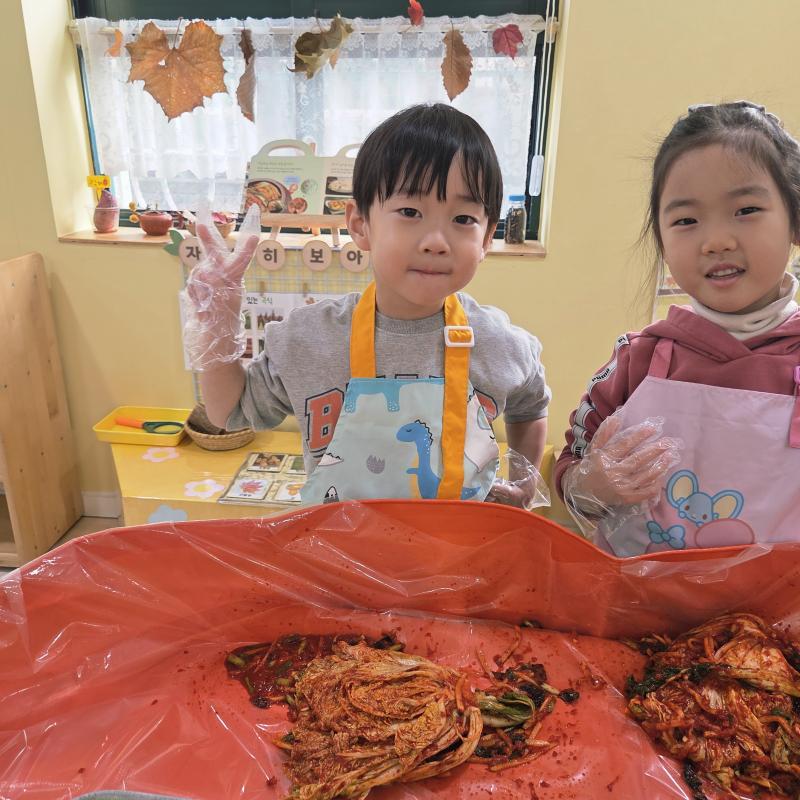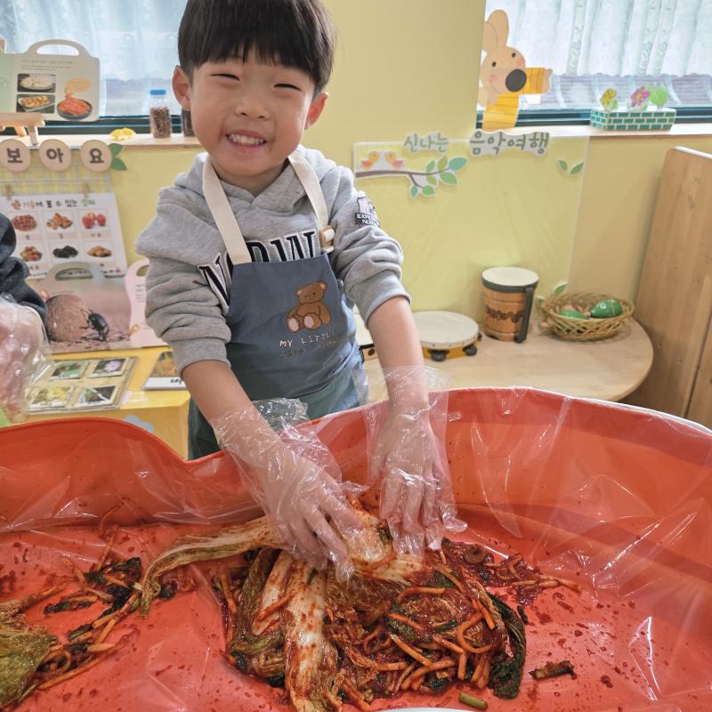 추운 겨울이 오기 전 다함께 도란도란 모여 겨울동안 먹을 수 있는 김장을 하며 따뜻한 마음을 나누는 축제의 날❄️☃️ 고사리 같은 귀여운 손으로 배춧잎을 마치 책장 넘기듯이 배추소를 쏘오옥 넣으며엄마 아빠가 된 든 정성껏 김장 담그는 모습에진지함이 느껴졌답니다. 평소 김치가 매워서 먹기 어려워했던 친구들도오늘은 용기를 내어 우리가 담근 김장 김치를 맛보며“맛있어요, 더 주세요” 하며 활짝 웃는 모습에 사랑스러움이 뿜뿜*^^*🌶️🧅🧄