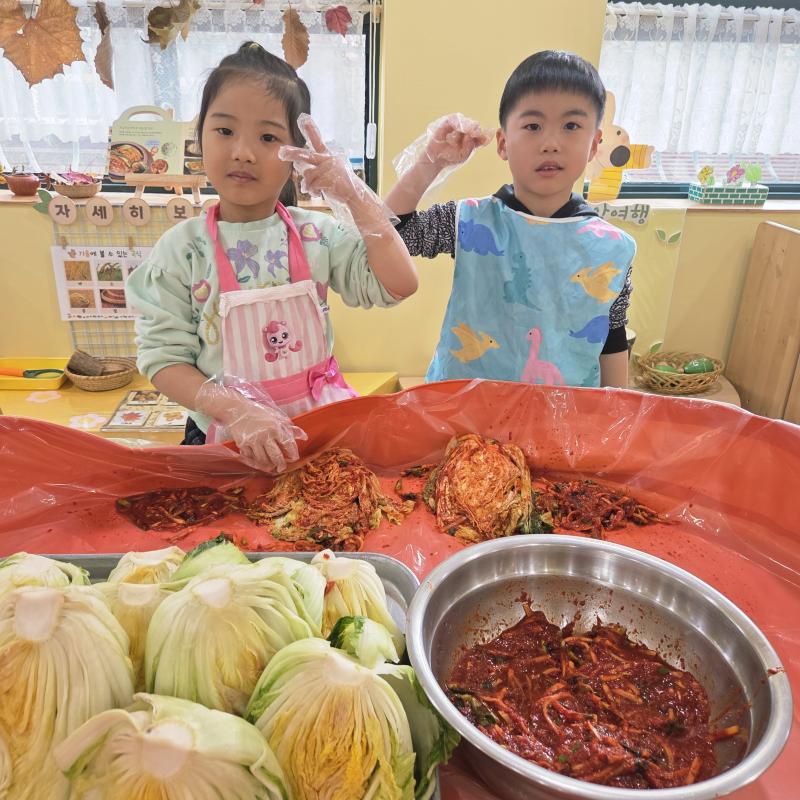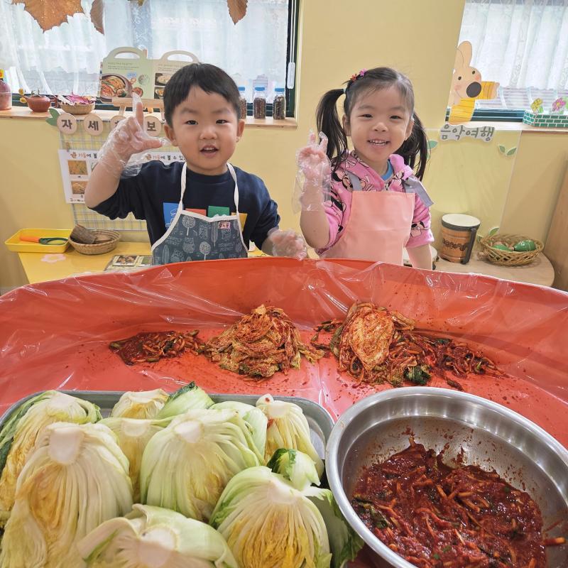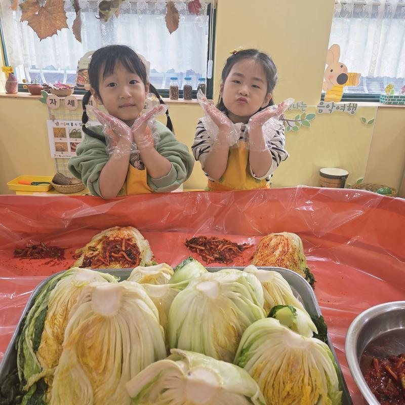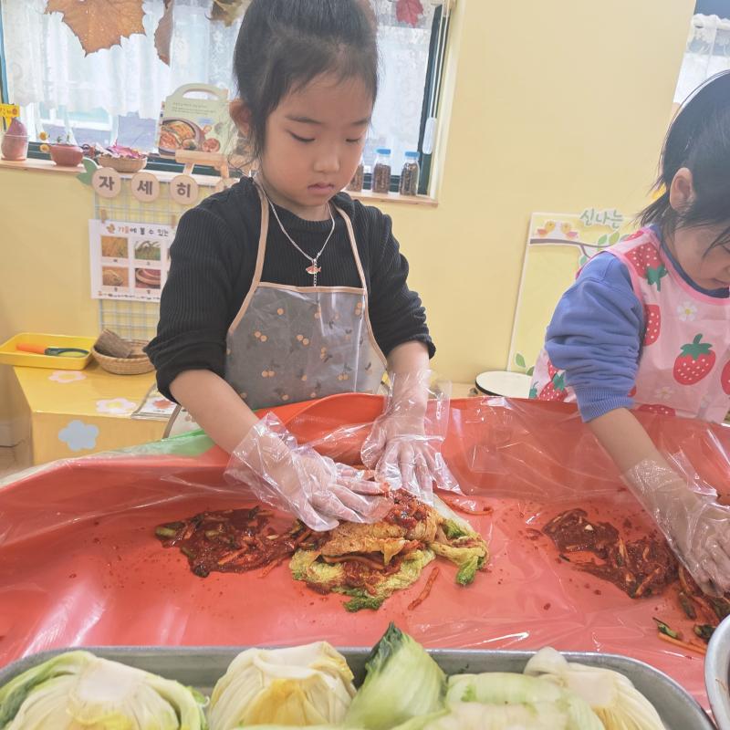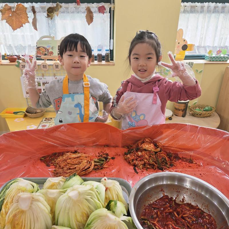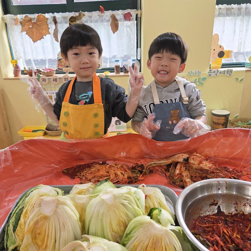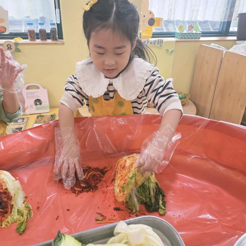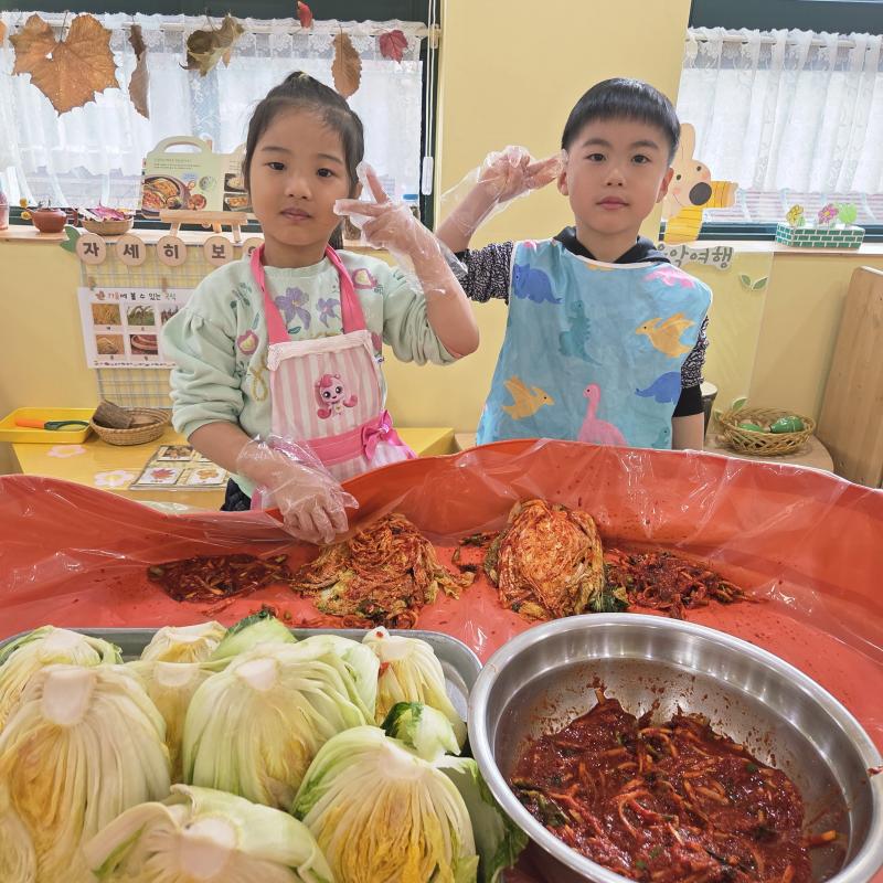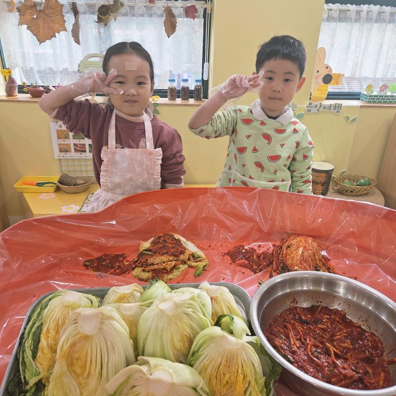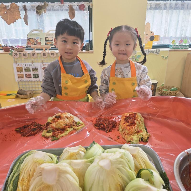 추운 겨울이 오기 전 다함께 도란도란 모여 겨울동안 먹을 수 있는 김장을 하며 따뜻한 마음을 나누는 축제의 날❄️☃️ 고사리 같은 귀여운 손으로 배춧잎을 마치 책장 넘기듯이 배추소를 쏘오옥 넣으며엄마 아빠가 된 든 정성껏 김장 담그는 모습에진지함이 느껴졌답니다. 평소 김치가 매워서 먹기 어려워했던 친구들도오늘은 용기를 내어 우리가 담근 김장 김치를 맛보며“맛있어요, 더 주세요” 하며 활짝 웃는 모습에 사랑스러움이 뿜뿜*^^*🌶️🧅🧄