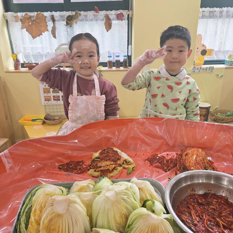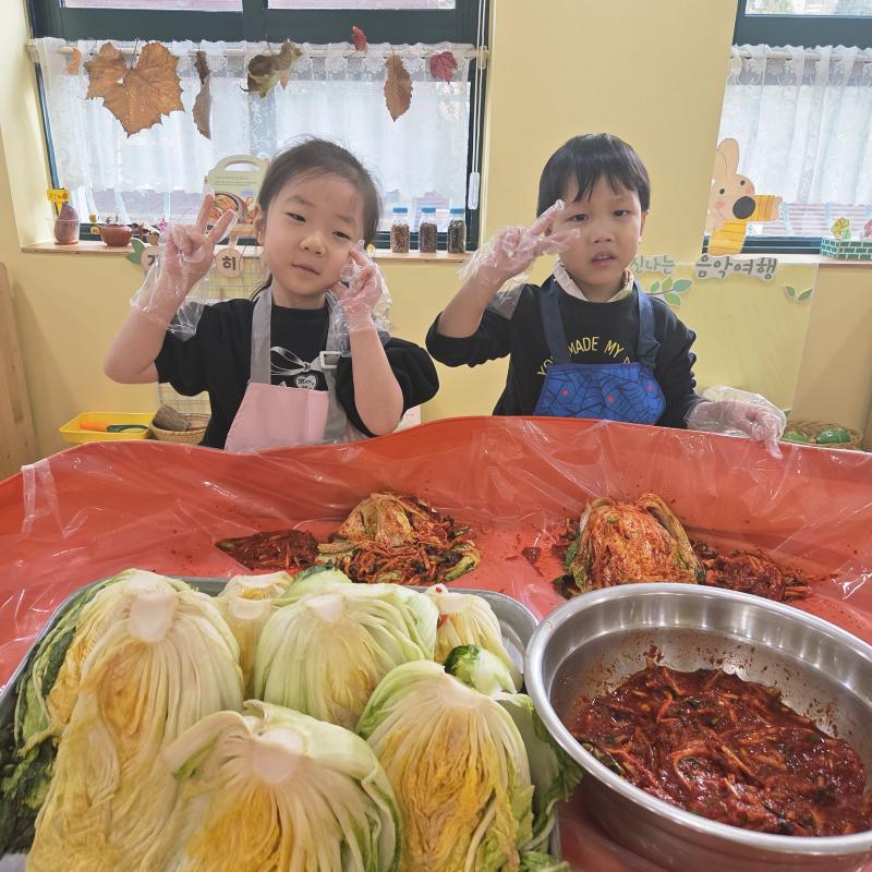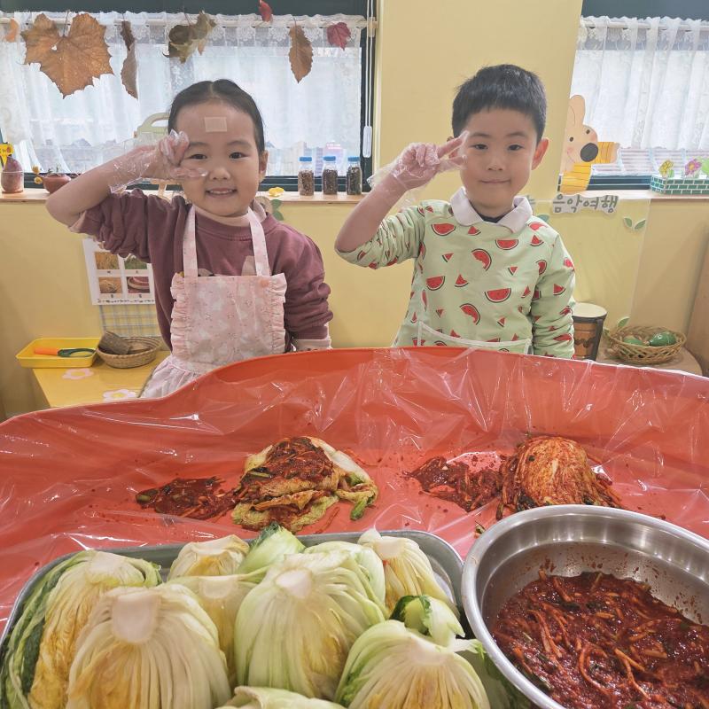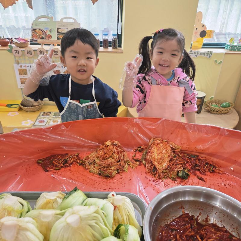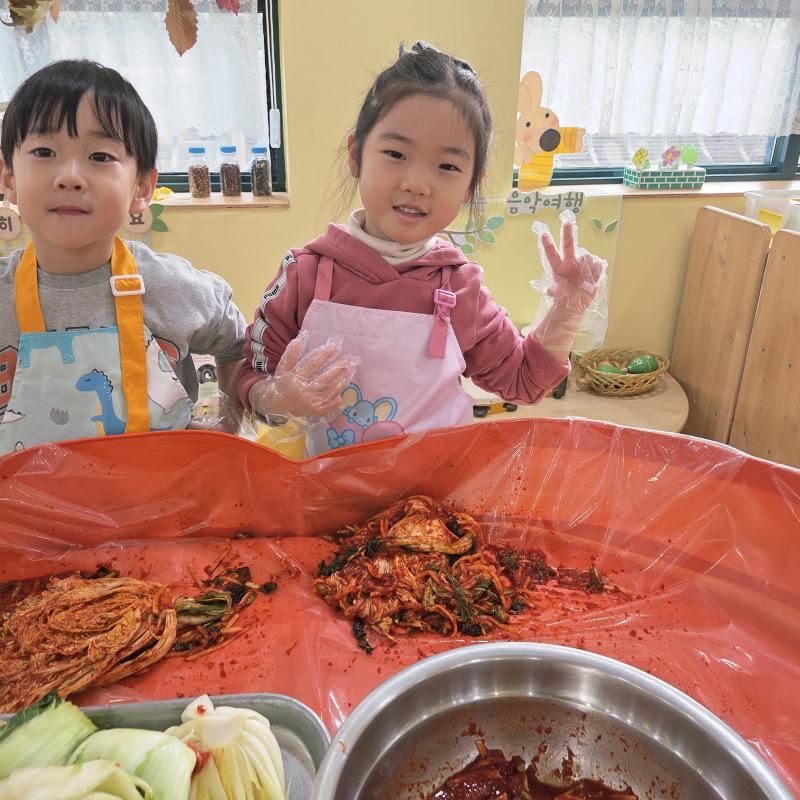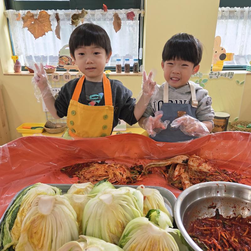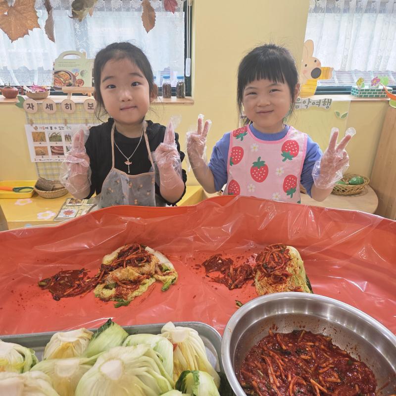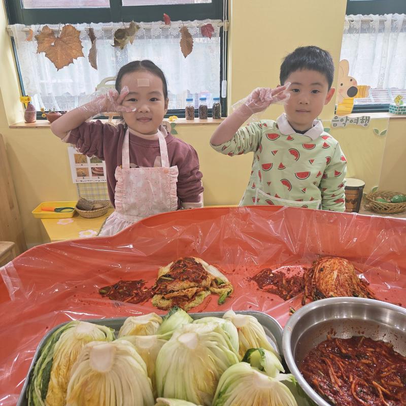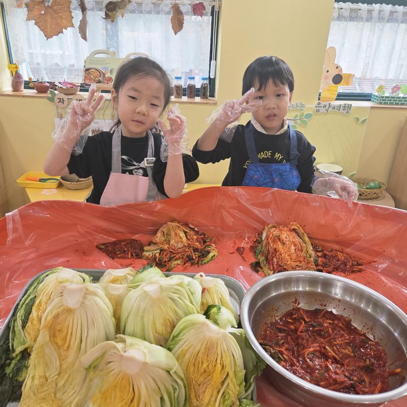 추운 겨울이 오기 전 다함께 도란도란 모여 겨울동안 먹을 수 있는 김장을 하며 따뜻한 마음을 나누는 축제의 날❄️☃️ 고사리 같은 귀여운 손으로 배춧잎을 마치 책장 넘기듯이 배추소를 쏘오옥 넣으며엄마 아빠가 된 든 정성껏 김장 담그는 모습에진지함이 느껴졌답니다. 평소 김치가 매워서 먹기 어려워했던 친구들도오늘은 용기를 내어 우리가 담근 김장 김치를 맛보며“맛있어요, 더 주세요” 하며 활짝 웃는 모습에 사랑스러움이 뿜뿜*^^*🌶️🧅🧄