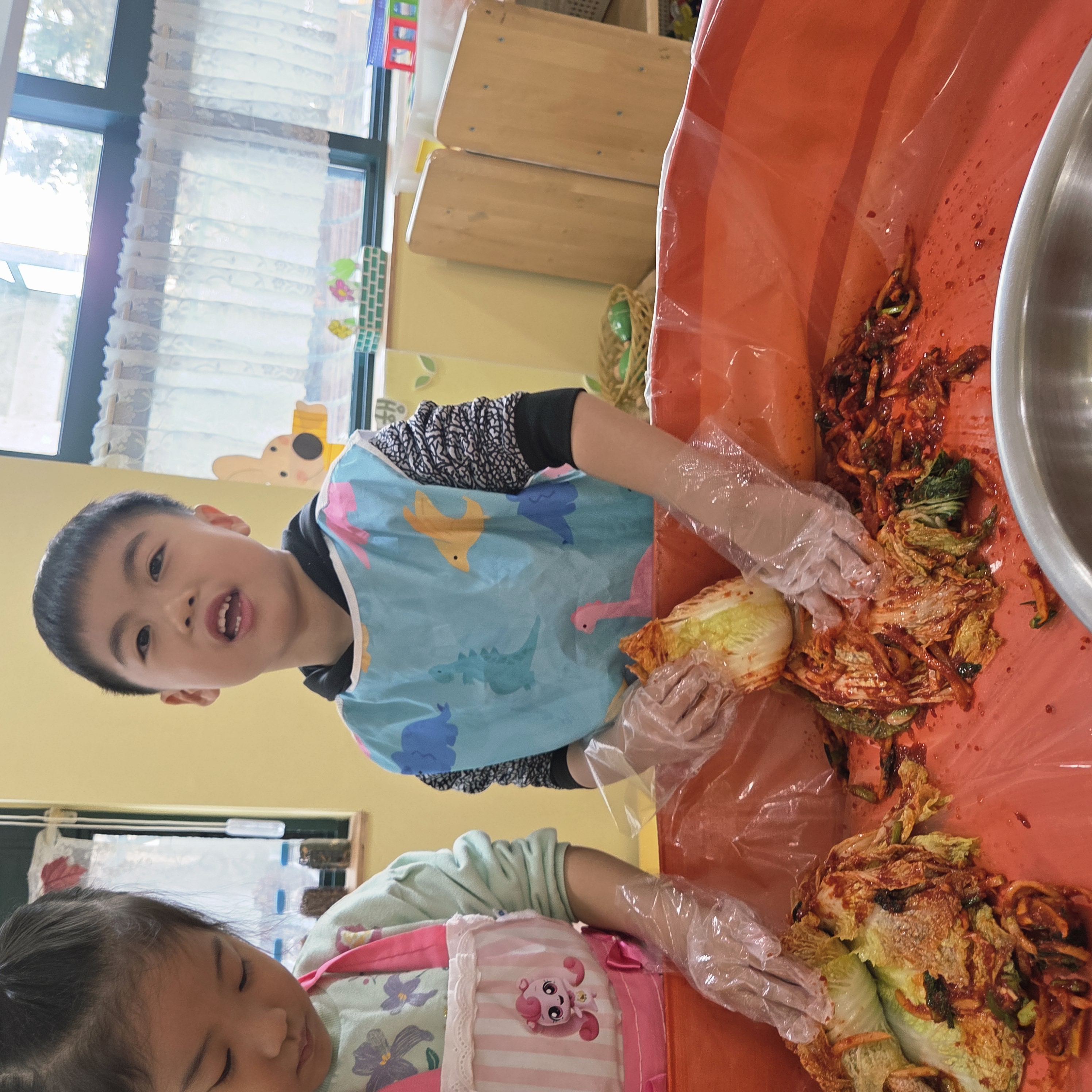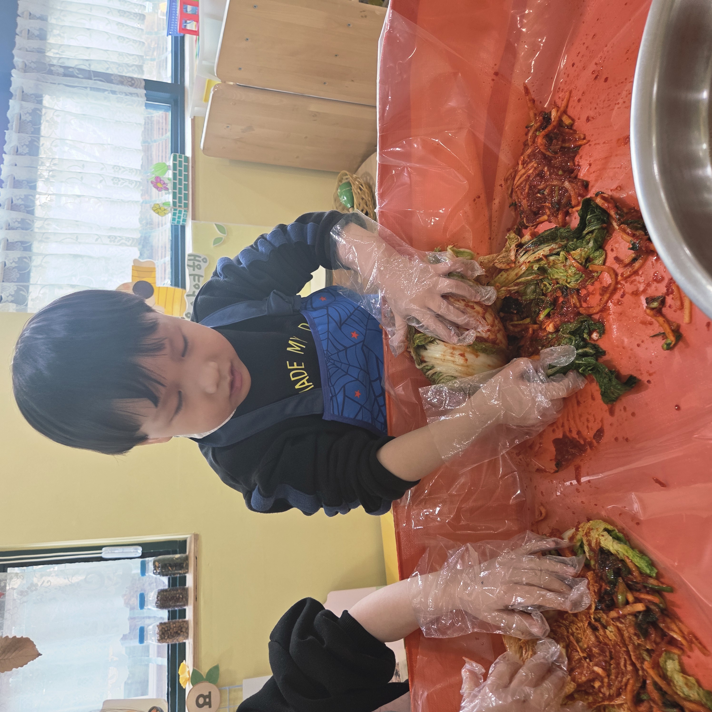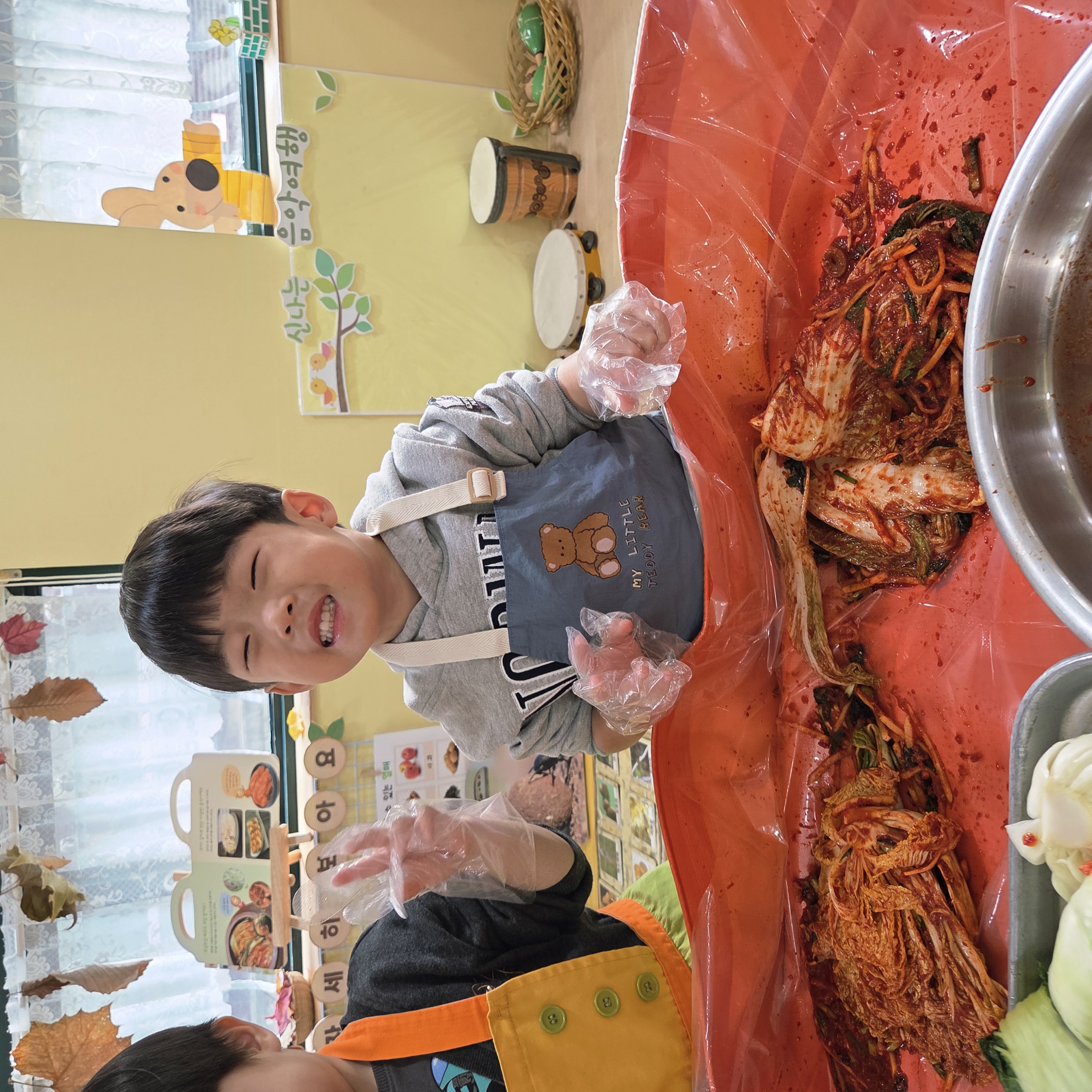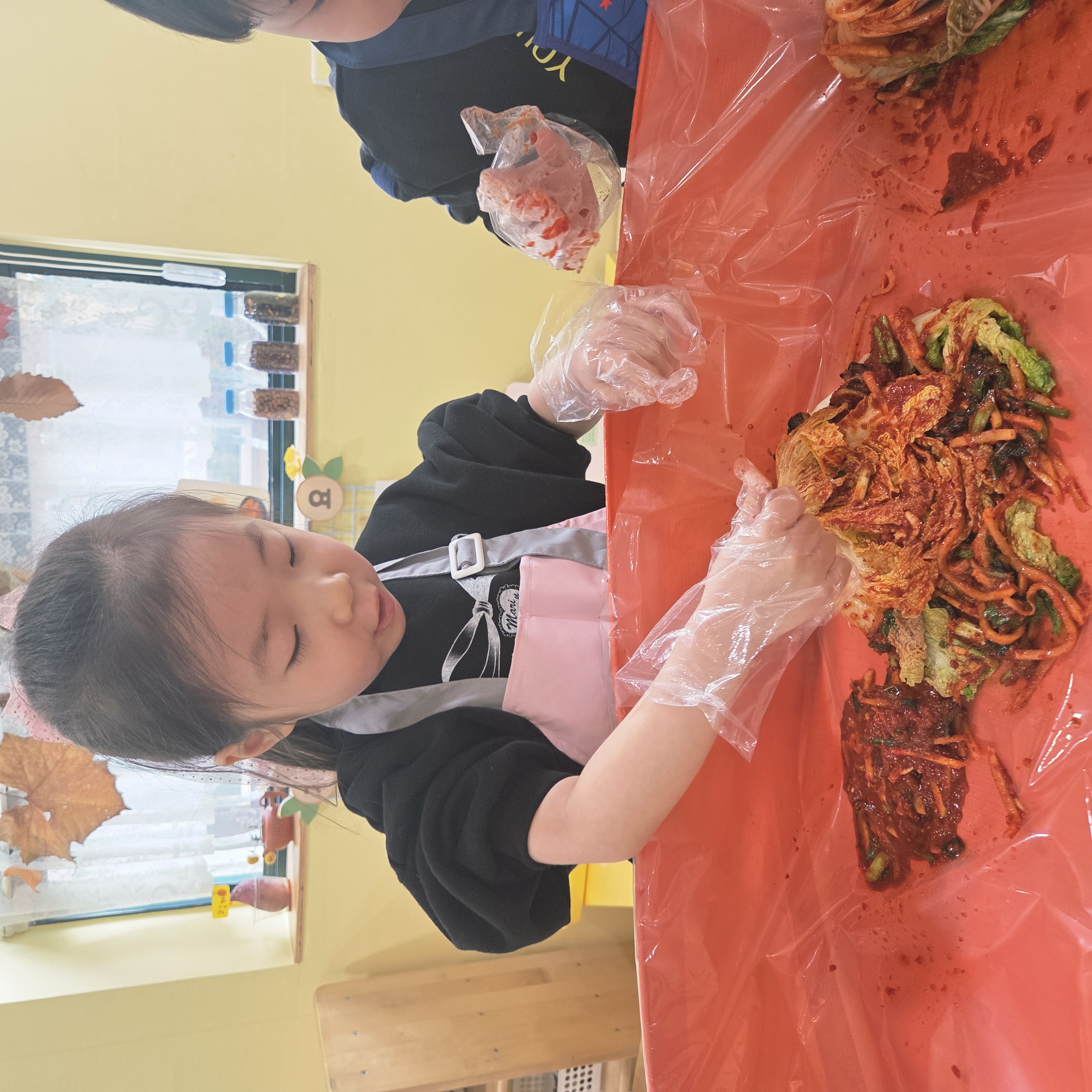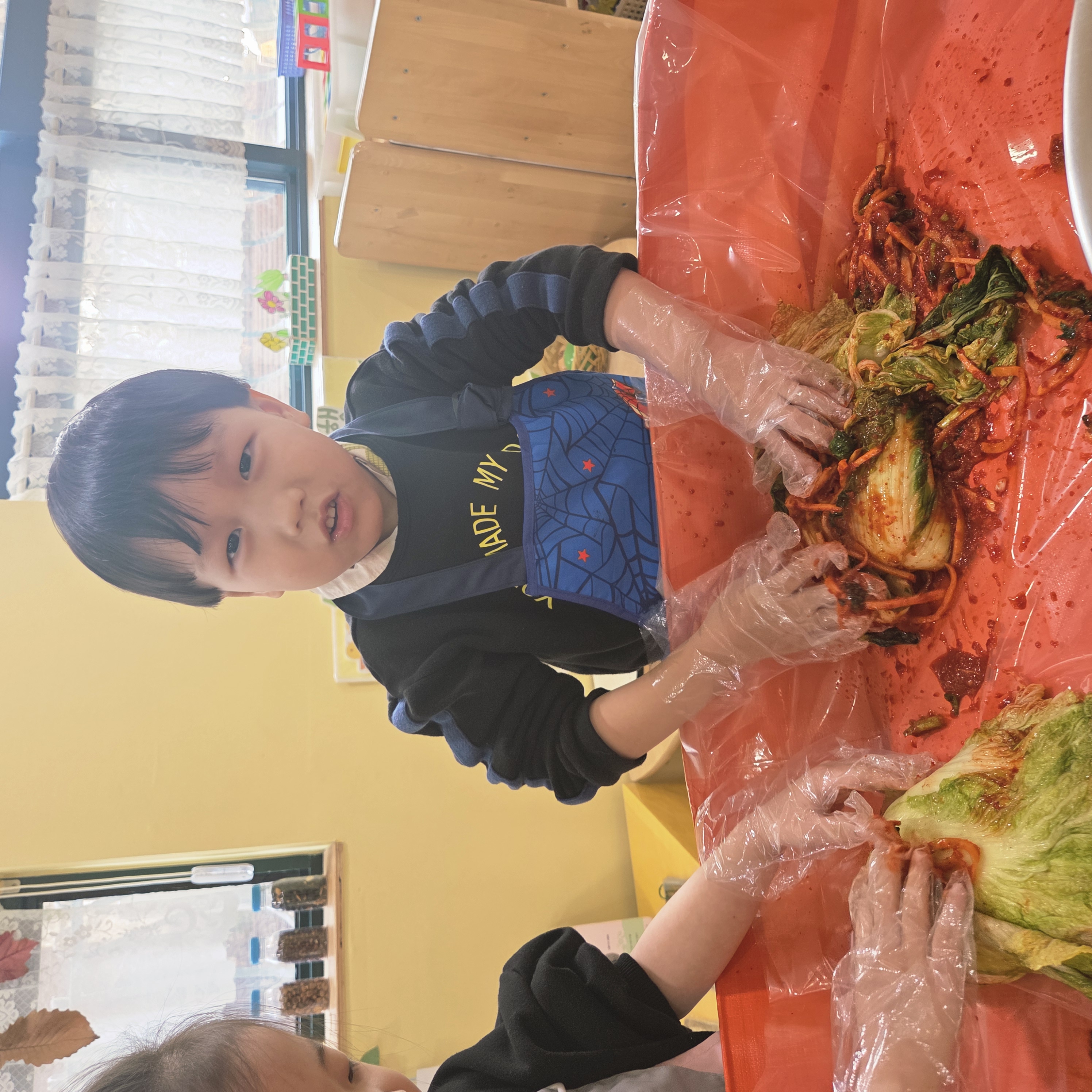 추운 겨울이 오기 전 다함께 도란도란 모여 겨울동안 먹을 수 있는 김장을 하며 따뜻한 마음을 나누는 축제의 날❄️☃️ 고사리 같은 귀여운 손으로 배춧잎을 마치 책장 넘기듯이 배추소를 쏘오옥 넣으며엄마 아빠가 된 든 정성껏 김장 담그는 모습에진지함이 느껴졌답니다. 평소 김치가 매워서 먹기 어려워했던 친구들도오늘은 용기를 내어 우리가 담근 김장 김치를 맛보며“맛있어요, 더 주세요” 하며 활짝 웃는 모습에 사랑스러움이 뿜뿜*^^*🌶️🧅🧄