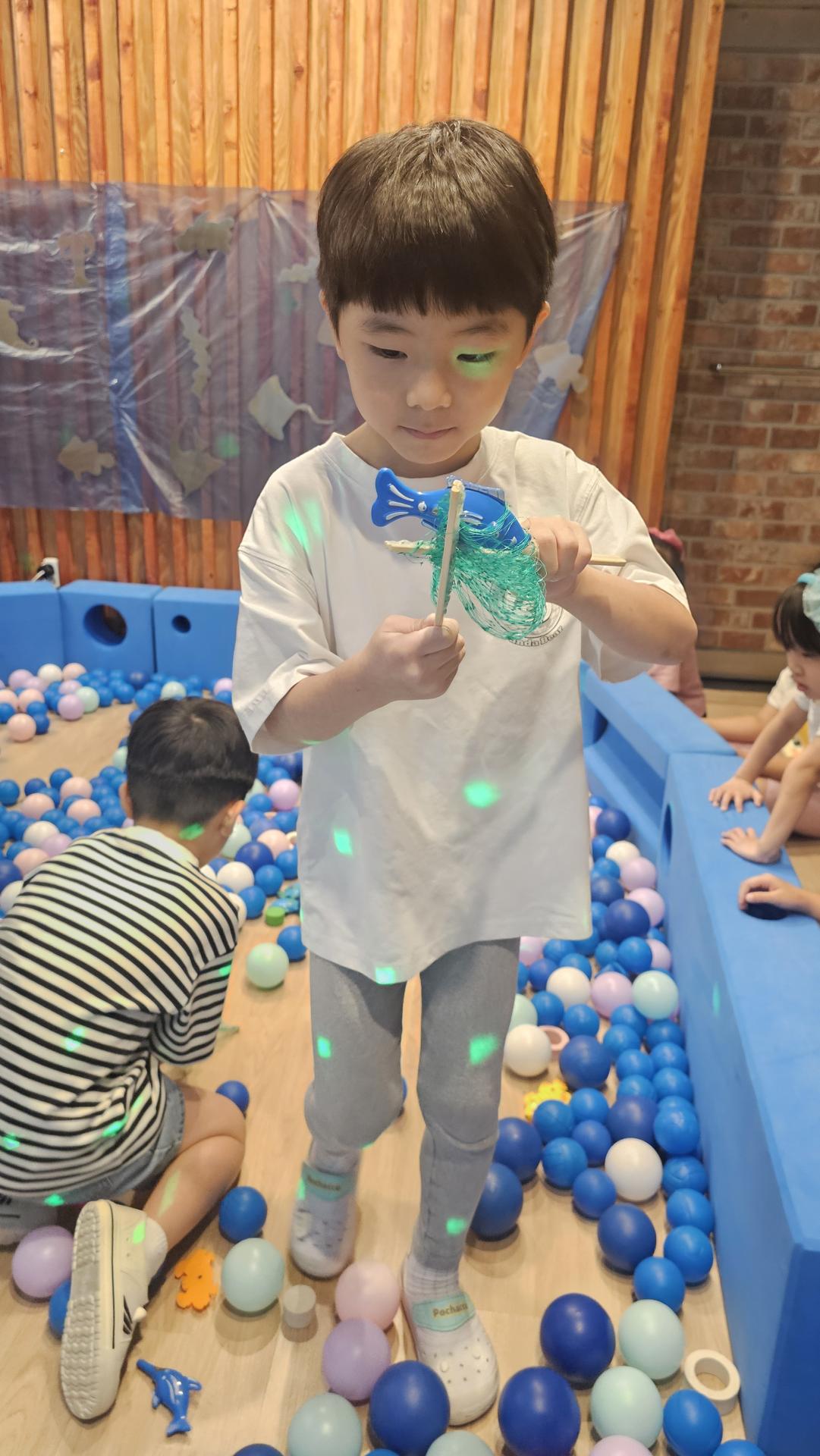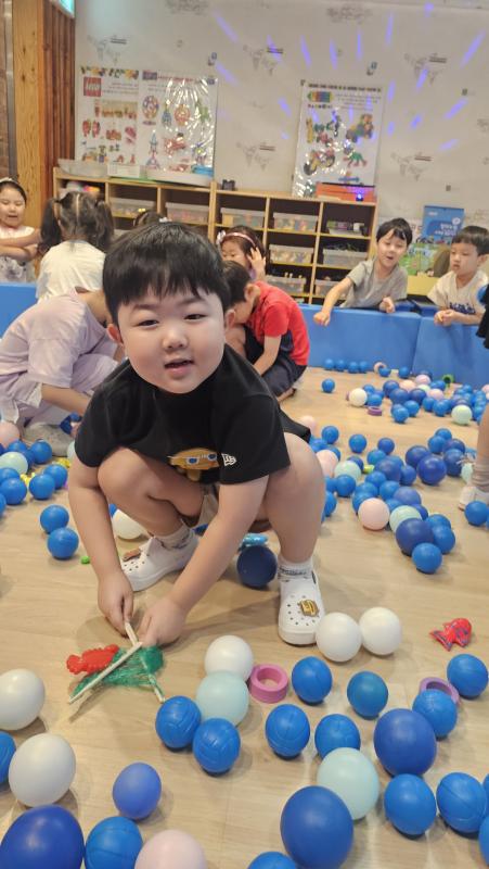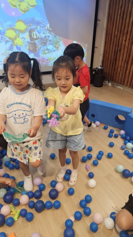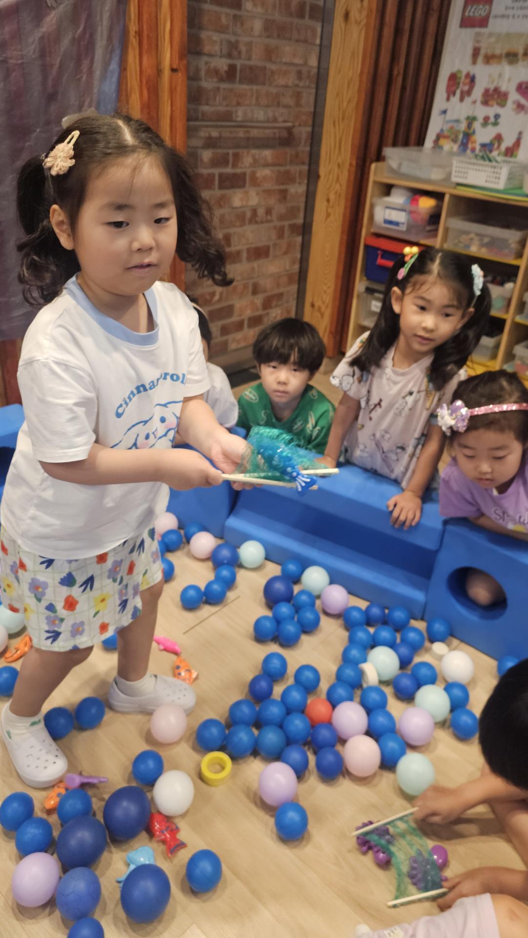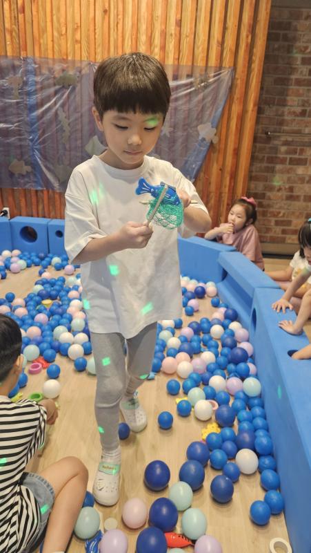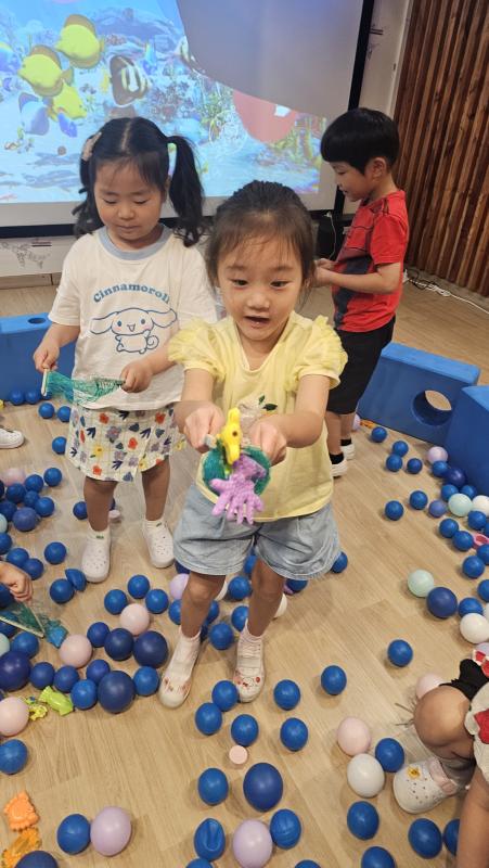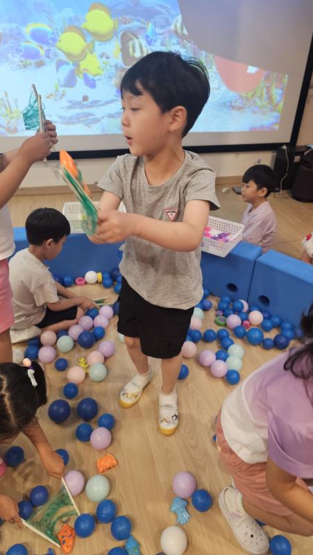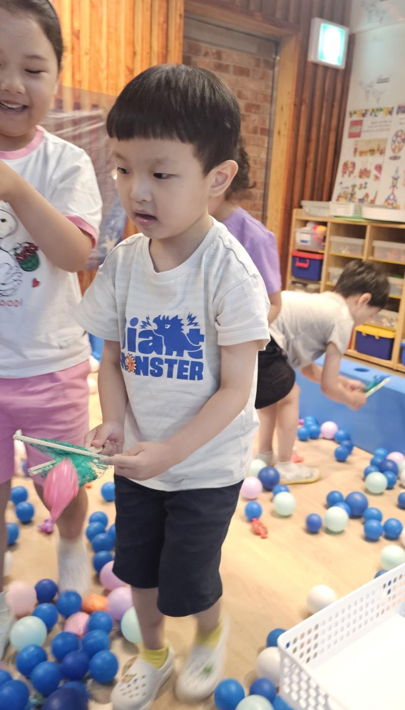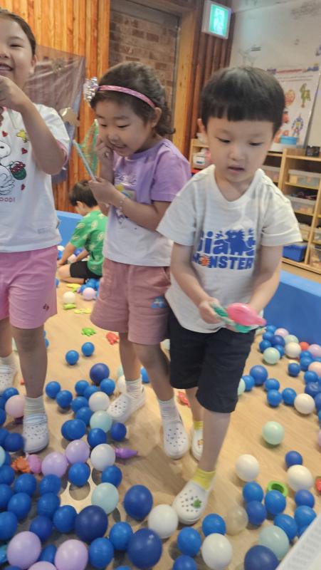 오늘은 교실이 멋진 아쿠아리움으로 변신했어요 🐠낚시 그물로 물고기를 잡고, 볼풀공을 시원한 물로 상상하며 물장구도 치며 신나게 놀았답니다. 🌊친구와 누가 더빨리 잡나 시합도 하고 시원한 하루를 보냈어요