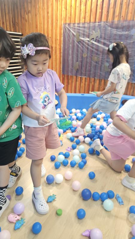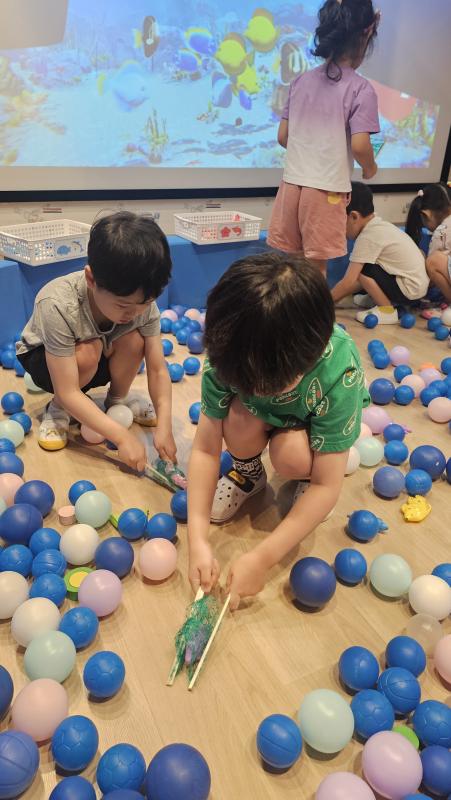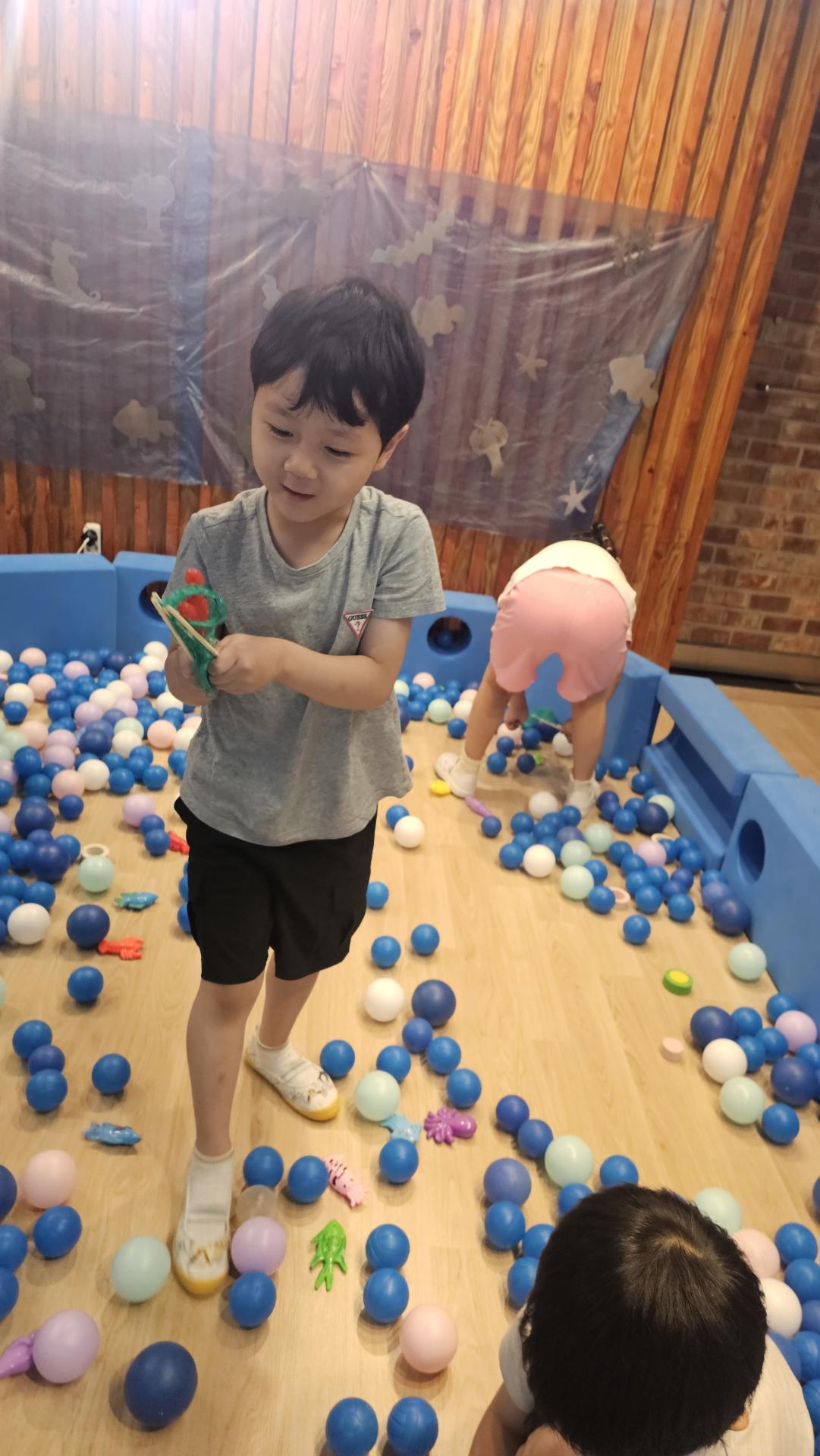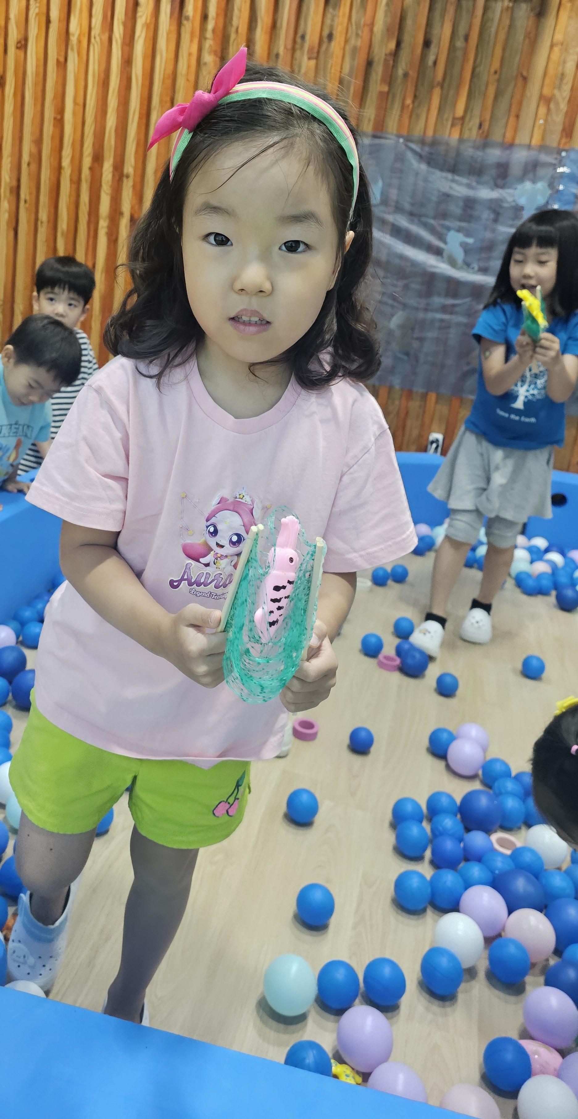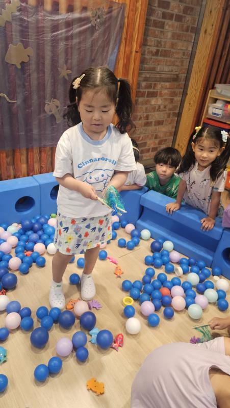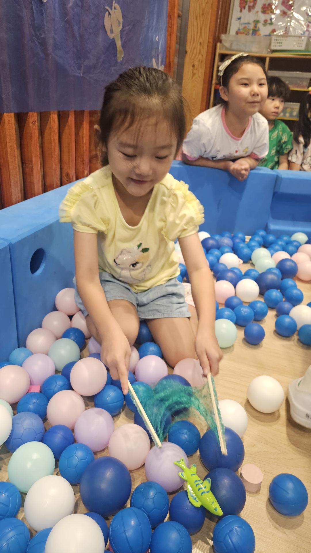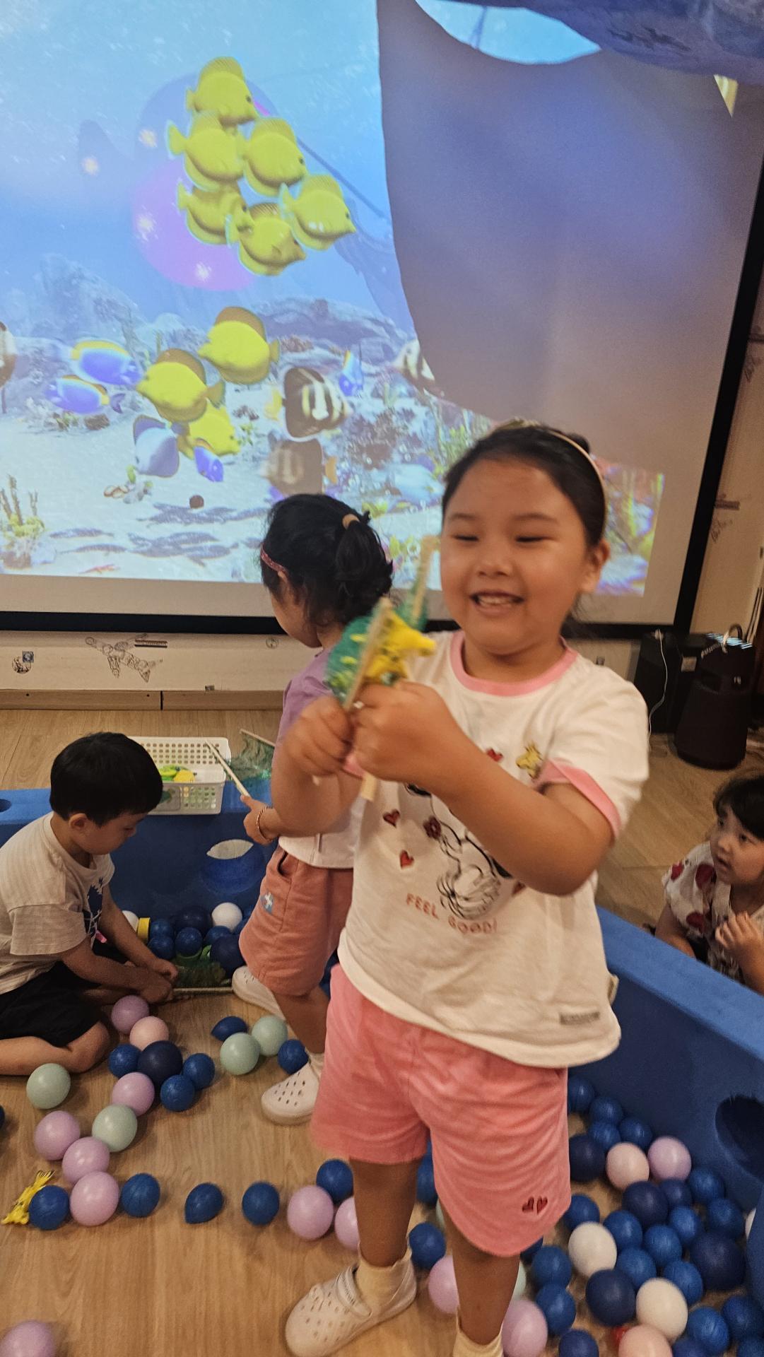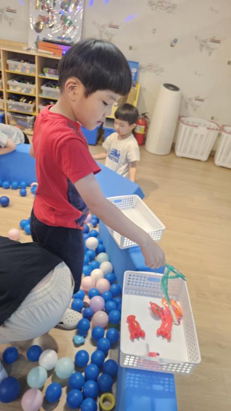 오늘은 교실이 멋진 아쿠아리움으로 변신했어요 🐠낚시 그물로 물고기를 잡고, 볼풀공을 시원한 물로 상상하며 물장구도 치며 신나게 놀았답니다. 🌊친구와 누가 더빨리 잡나 시합도 하고 시원한 하루를 보냈어요