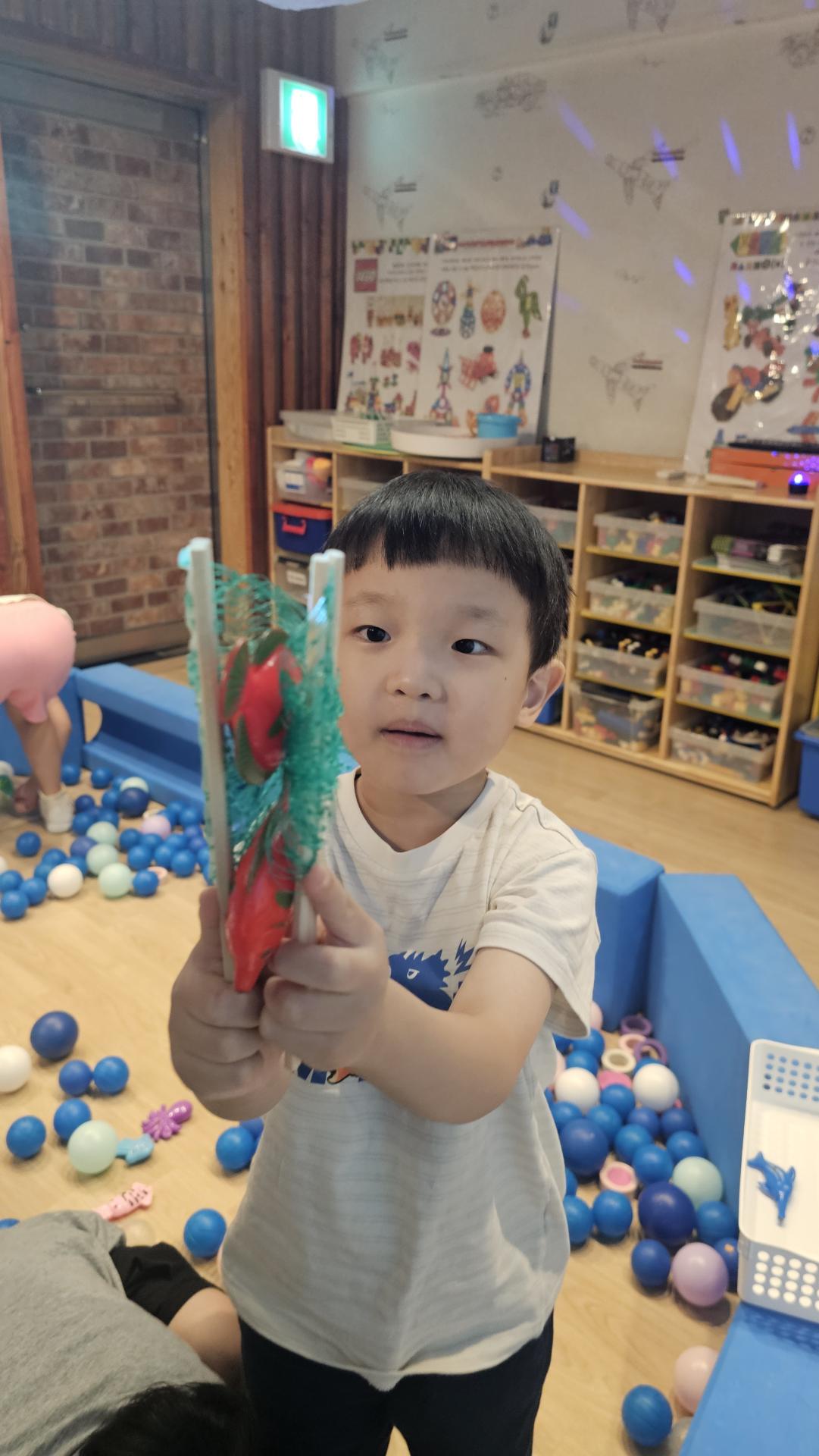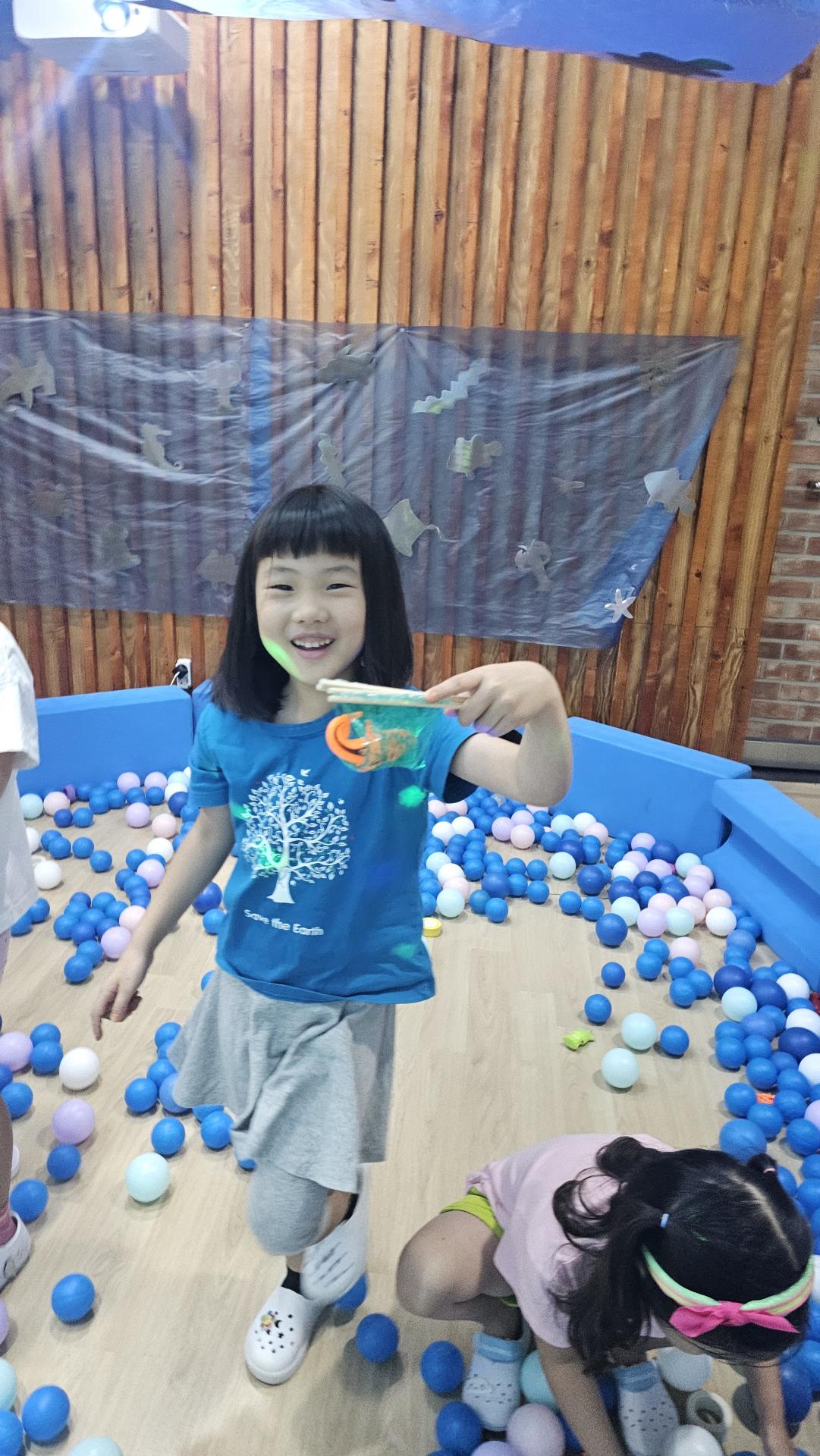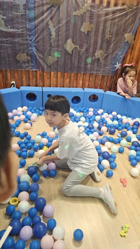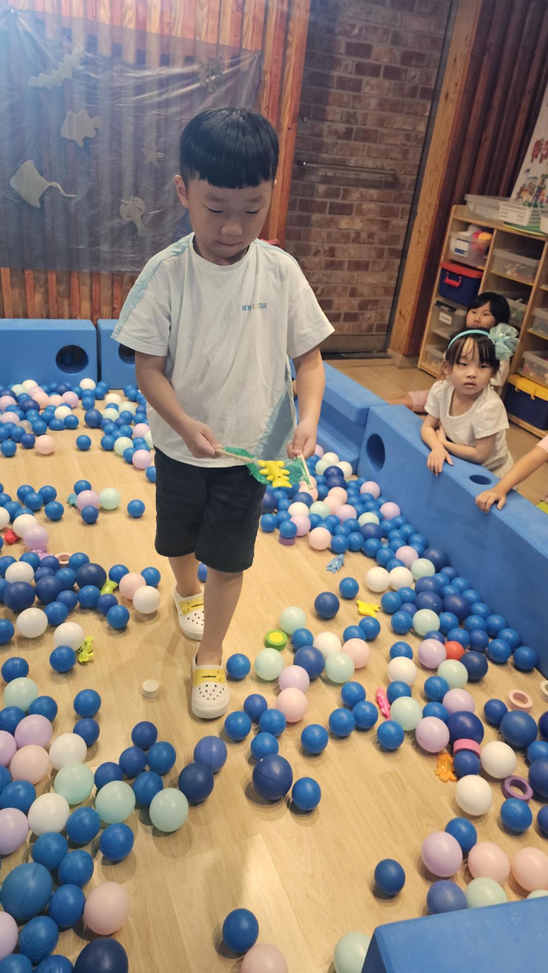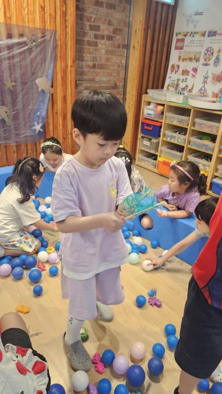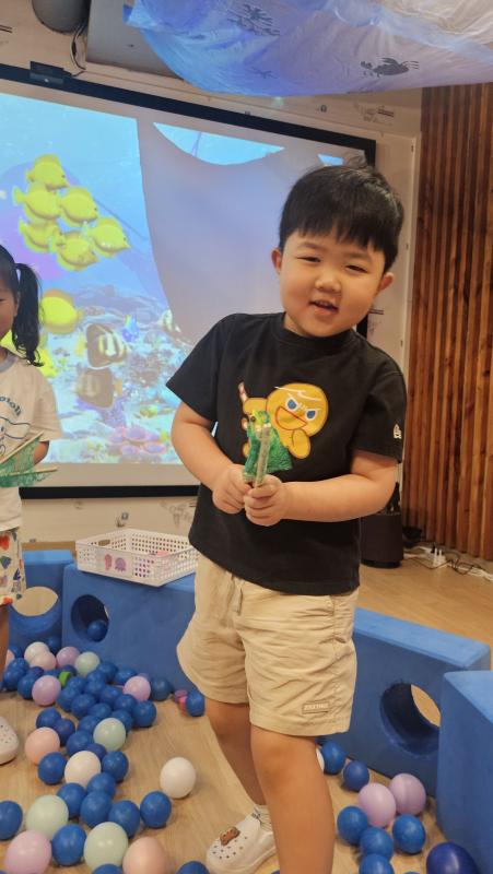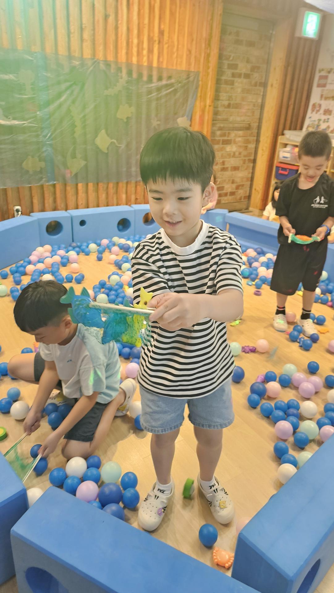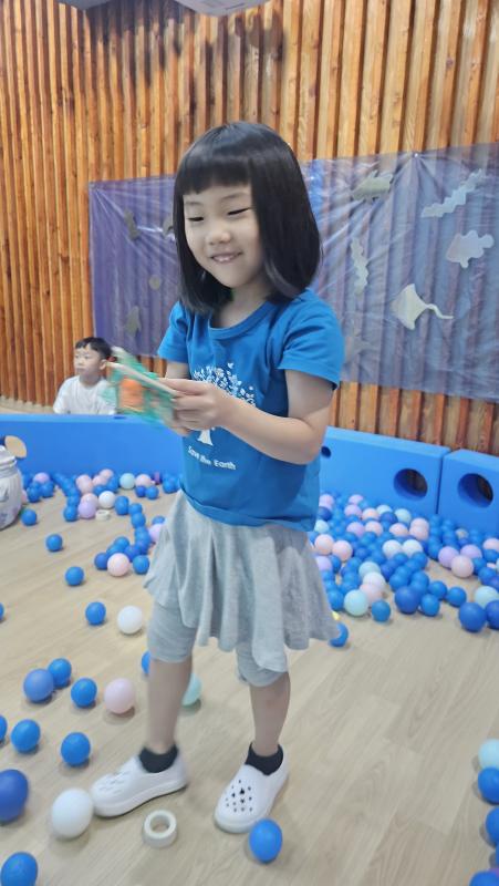 오늘은 교실이 멋진 아쿠아리움으로 변신했어요 🐠낚시 그물로 물고기를 잡고, 볼풀공을 시원한 물로 상상하며 물장구도 치며 신나게 놀았답니다. 🌊친구와 누가 더빨리 잡나 시합도 하고 시원한 하루를 보냈어요