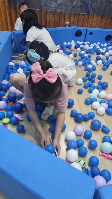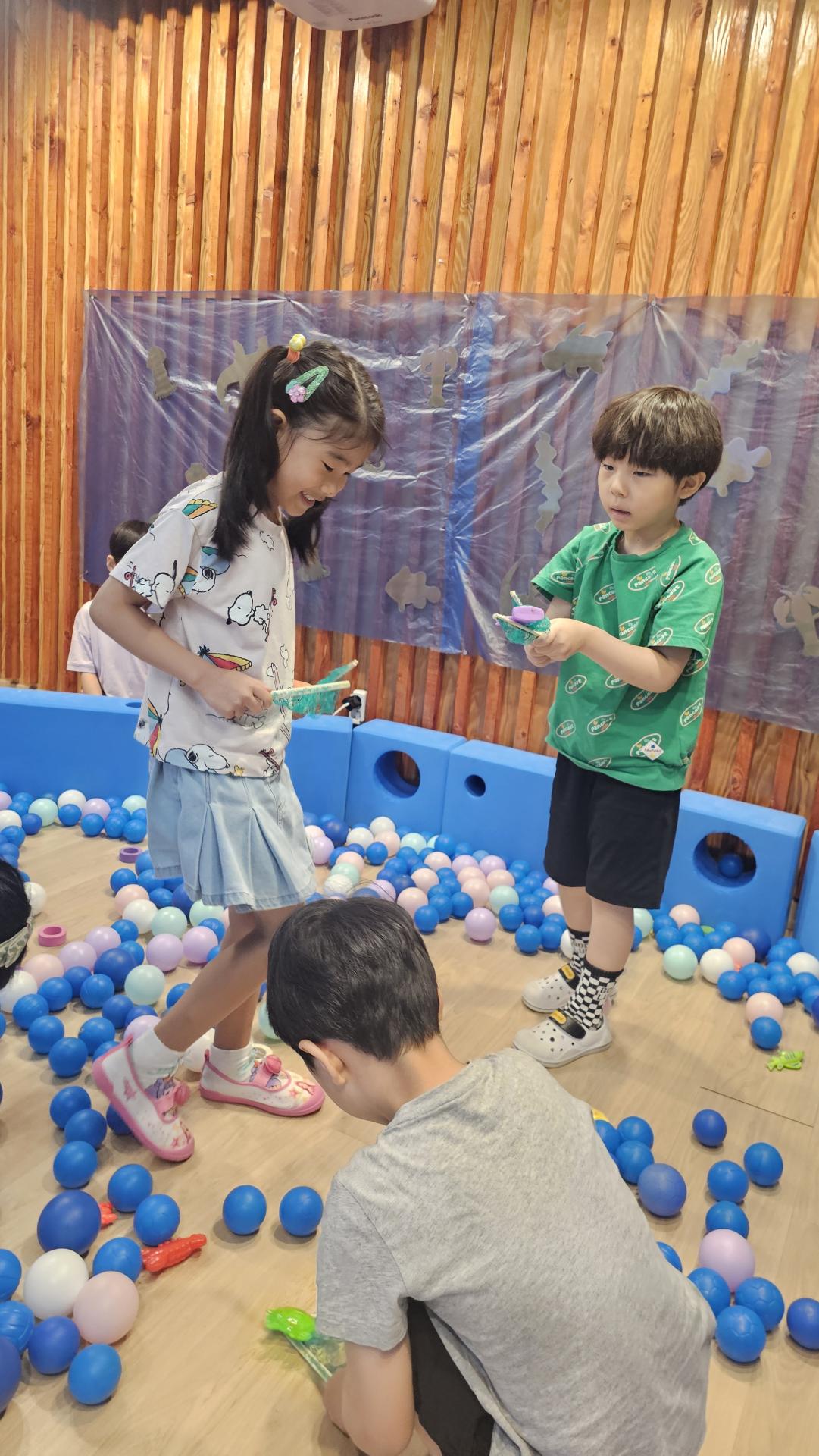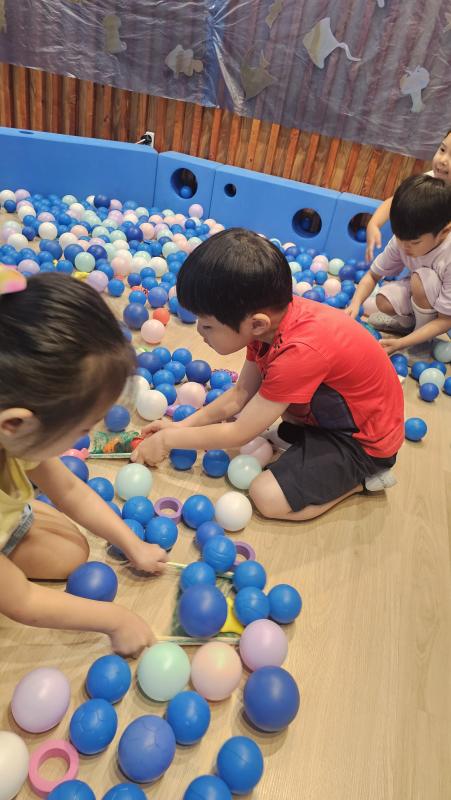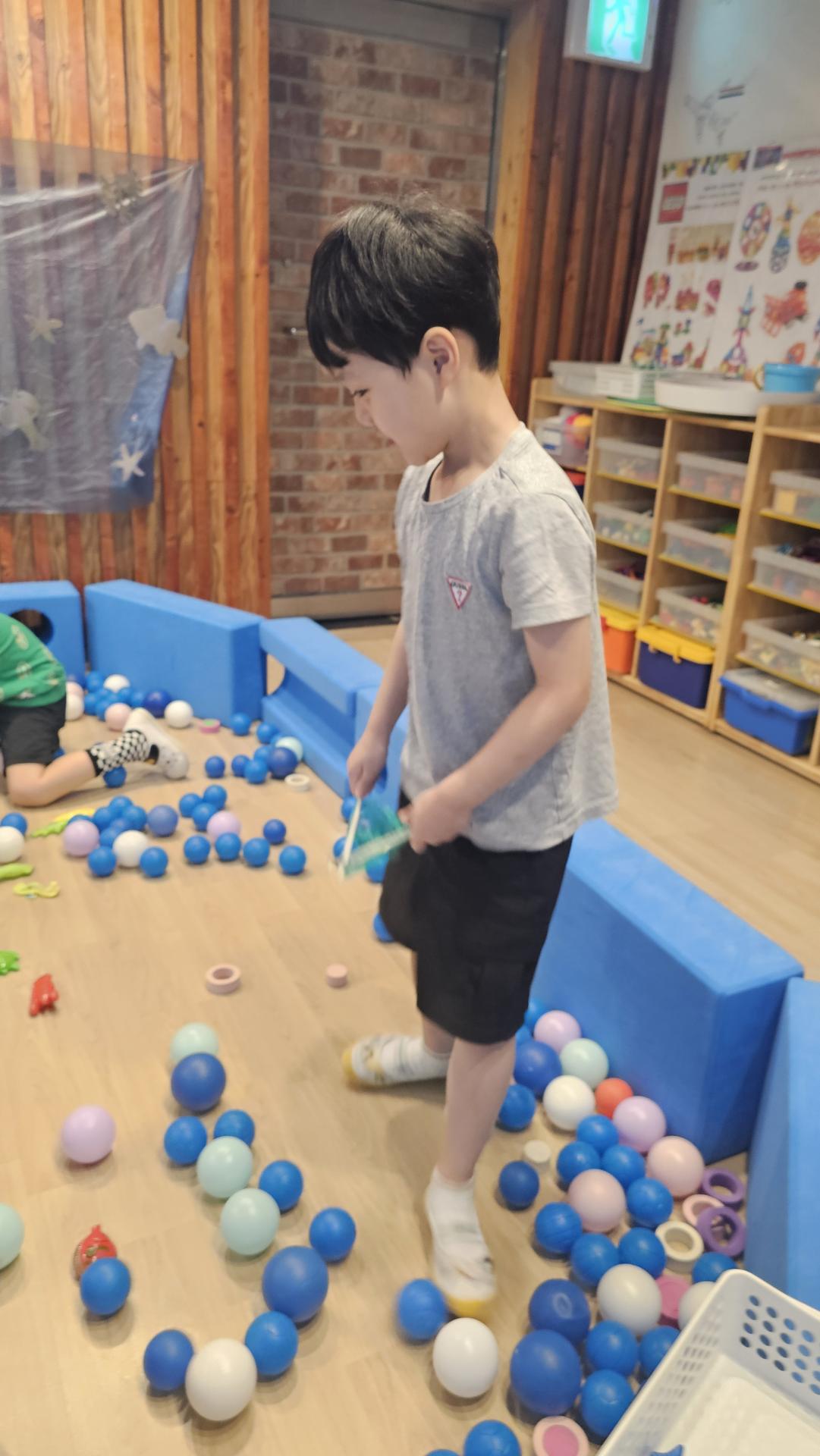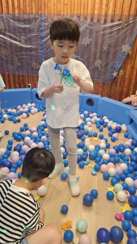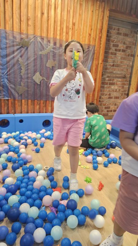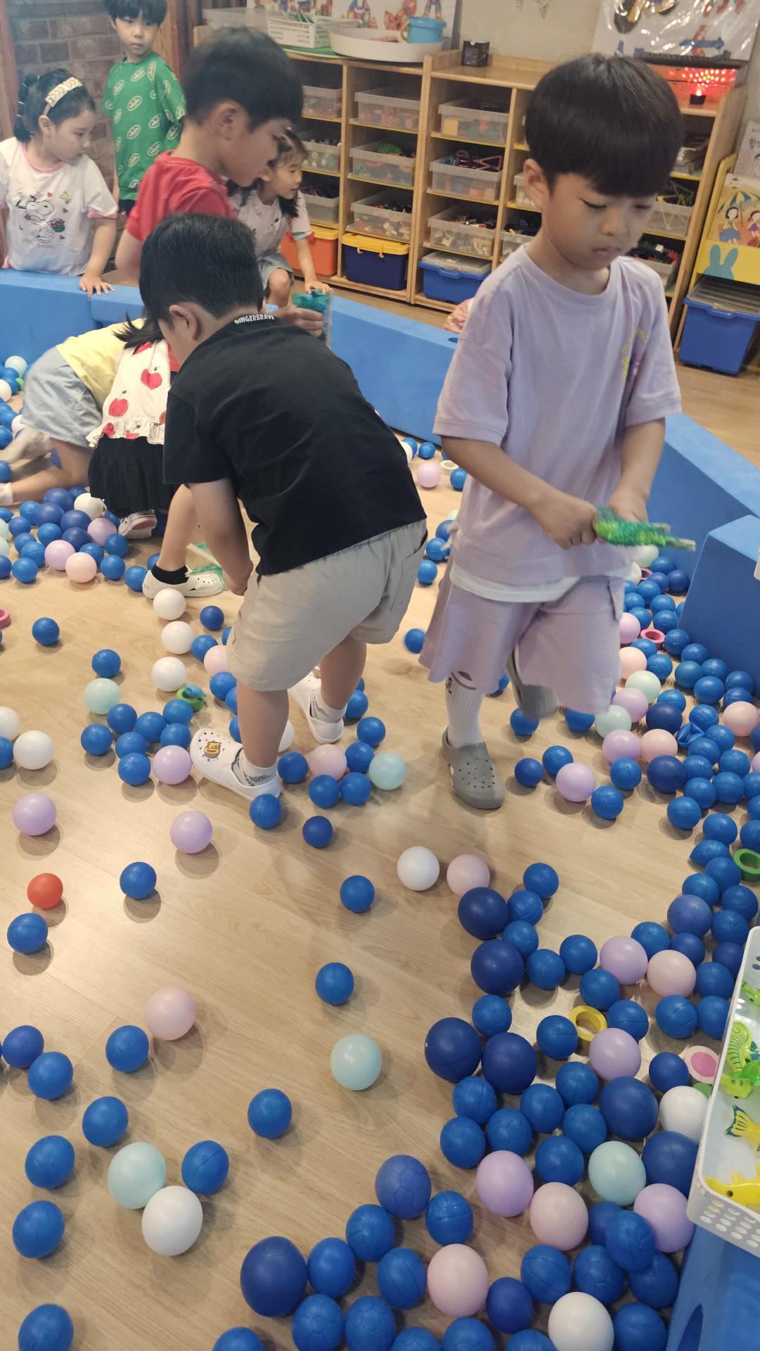오늘은 교실이 멋진 아쿠아리움으로 변신했어요 🐠낚시 그물로 물고기를 잡고, 볼풀공을 시원한 물로 상상하며 물장구도 치며 신나게 놀았답니다. 🌊친구와 누가 더빨리 잡나 시합도 하고 시원한 하루를 보냈어요