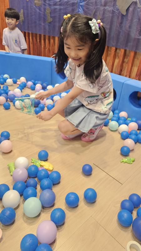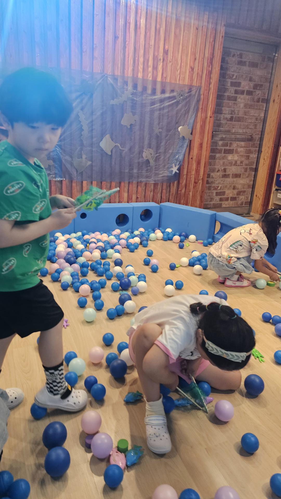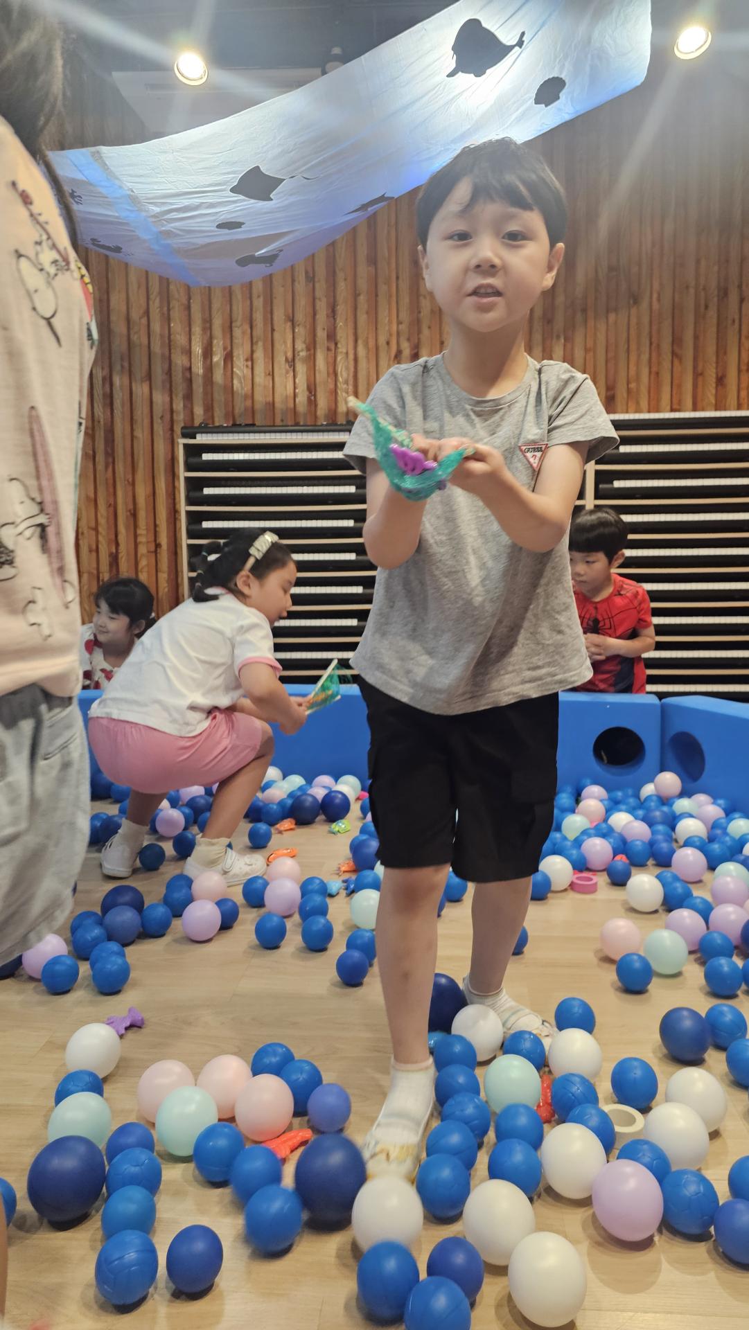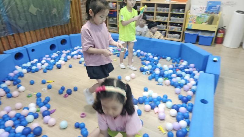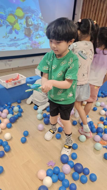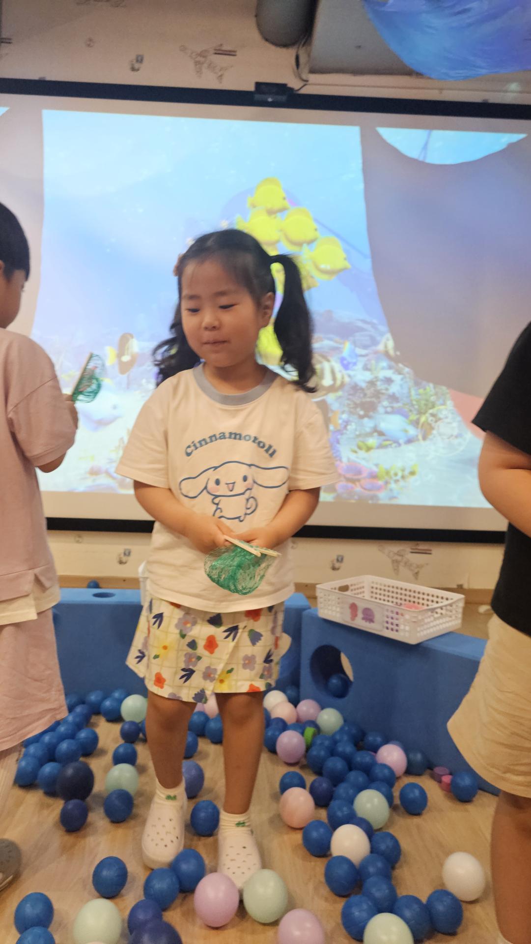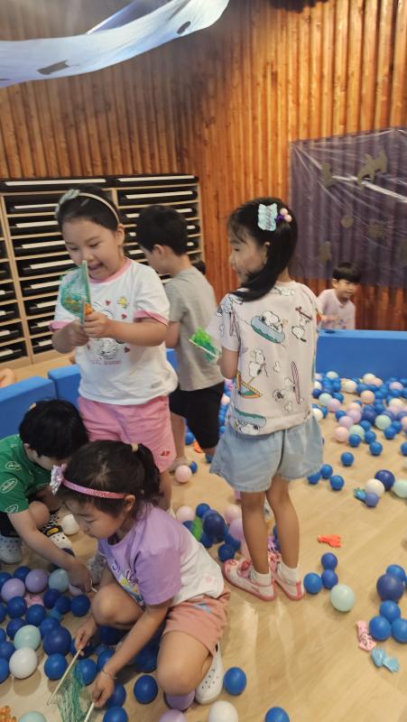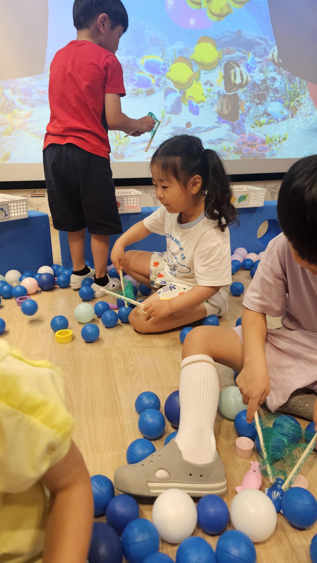 오늘은 교실이 멋진 아쿠아리움으로 변신했어요 🐠낚시 그물로 물고기를 잡고, 볼풀공을 시원한 물로 상상하며 물장구도 치며 신나게 놀았답니다. 🌊친구와 누가 더빨리 잡나 시합도 하고 시원한 하루를 보냈어요