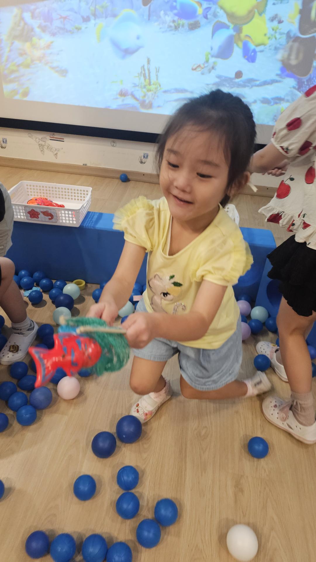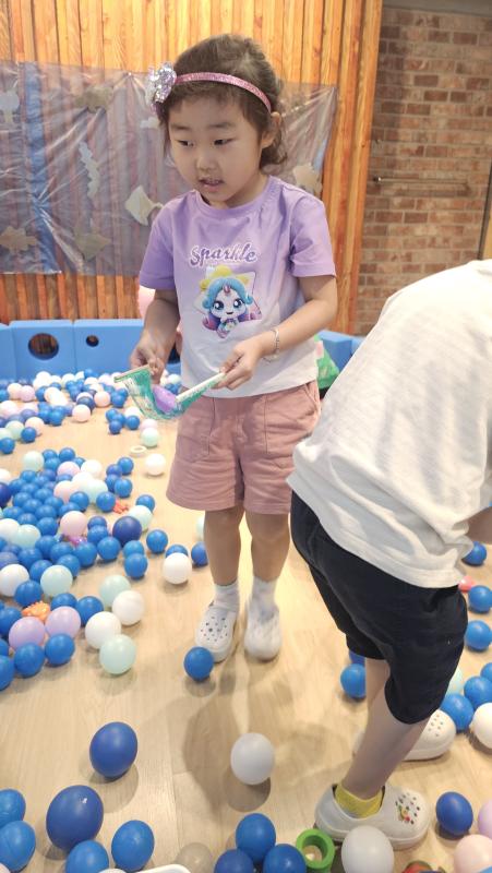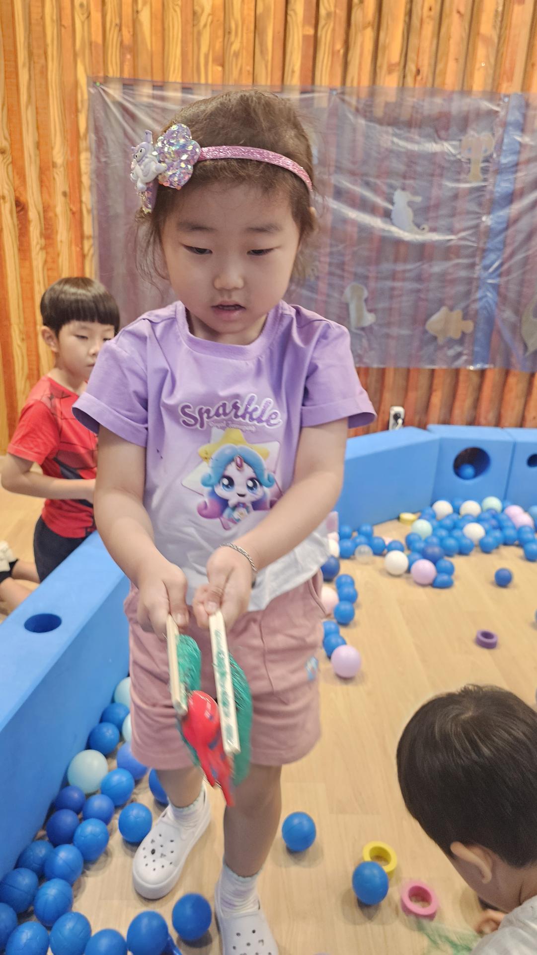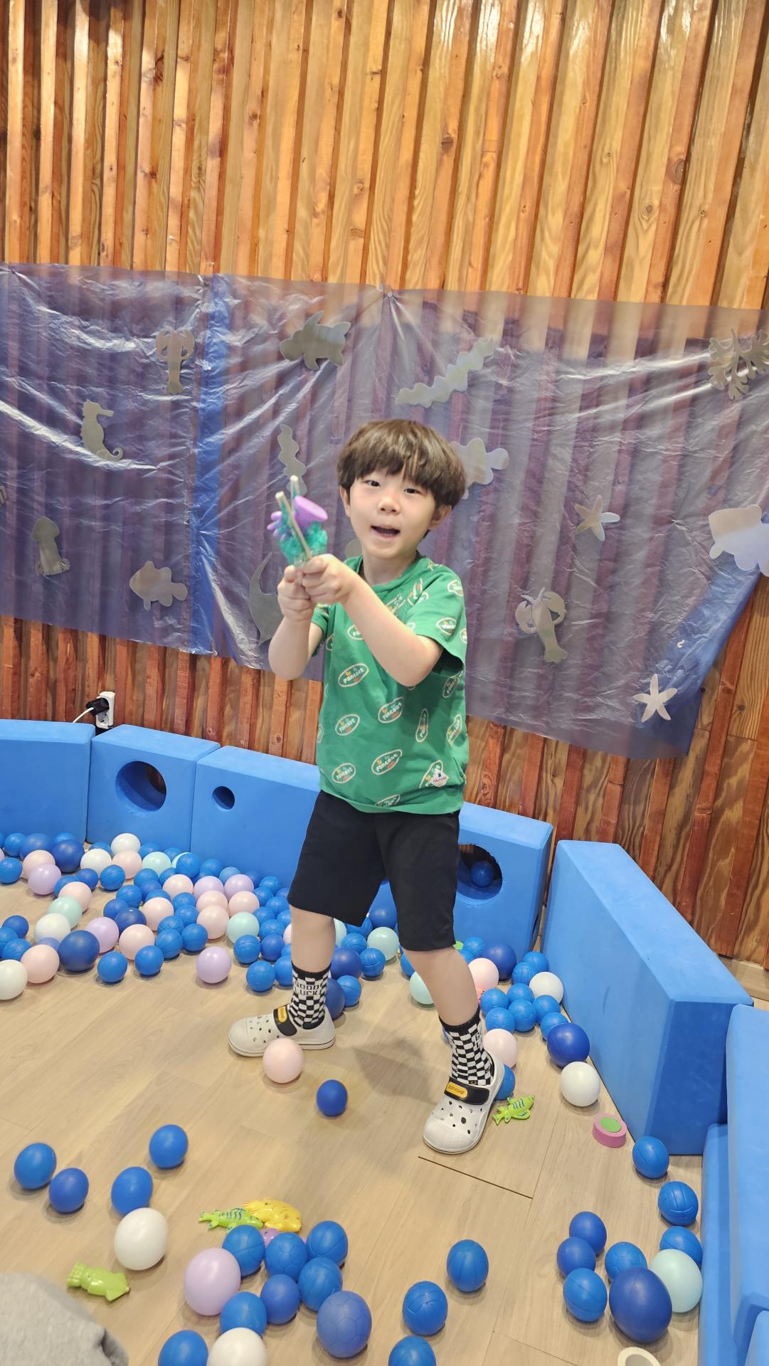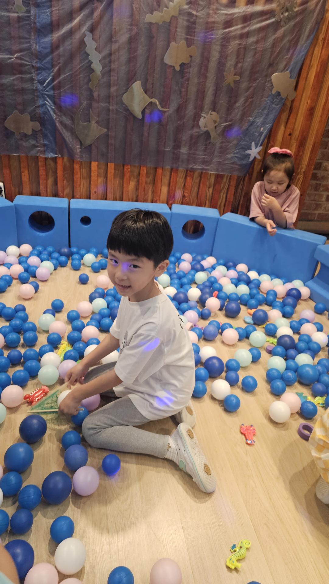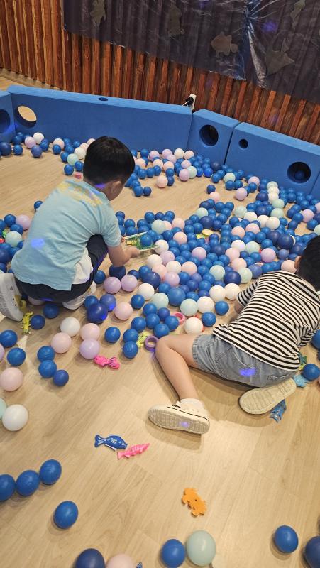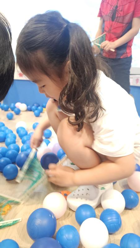 오늘은 교실이 멋진 아쿠아리움으로 변신했어요 🐠낚시 그물로 물고기를 잡고, 볼풀공을 시원한 물로 상상하며 물장구도 치며 신나게 놀았답니다. 🌊친구와 누가 더빨리 잡나 시합도 하고 시원한 하루를 보냈어요