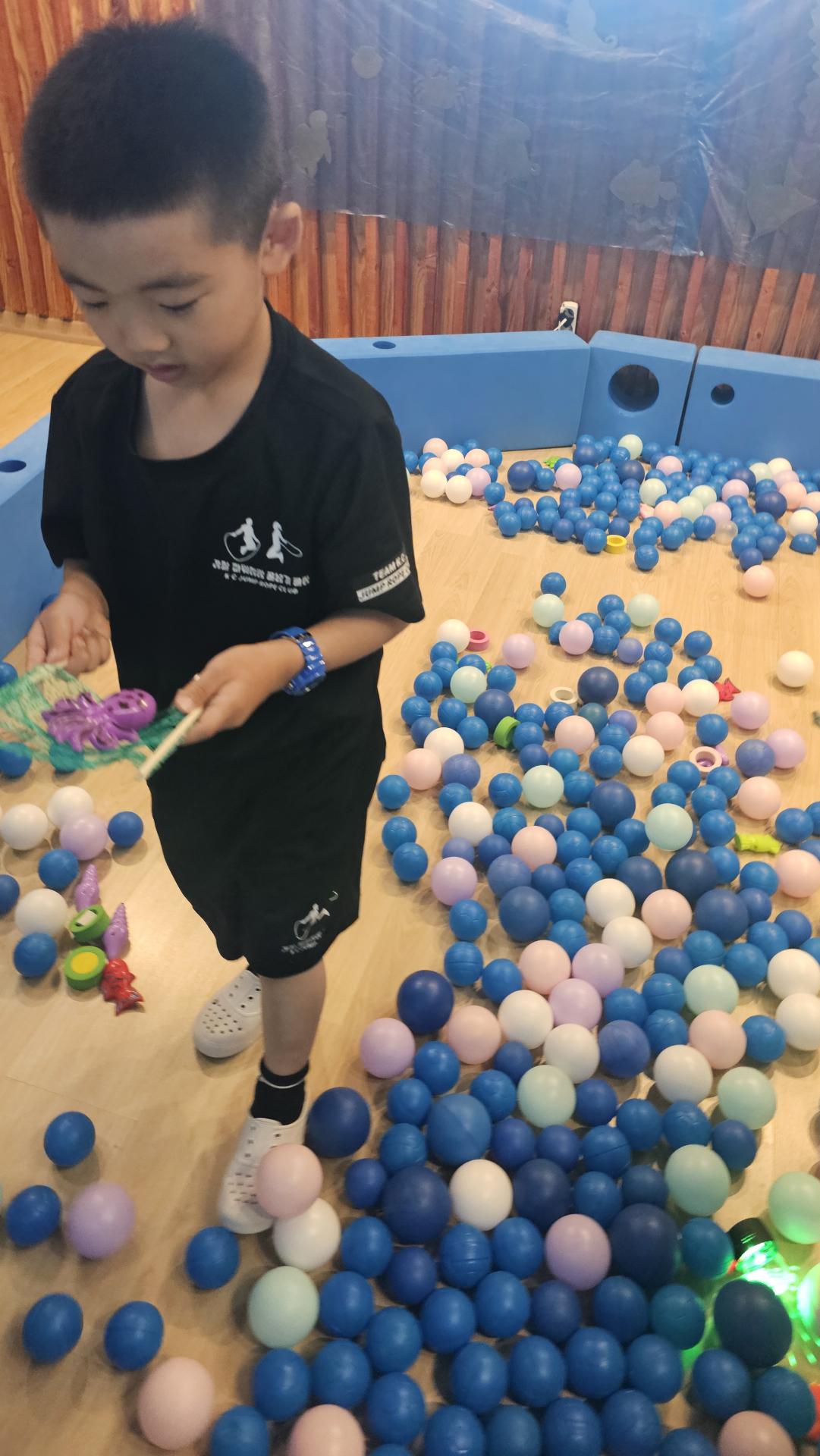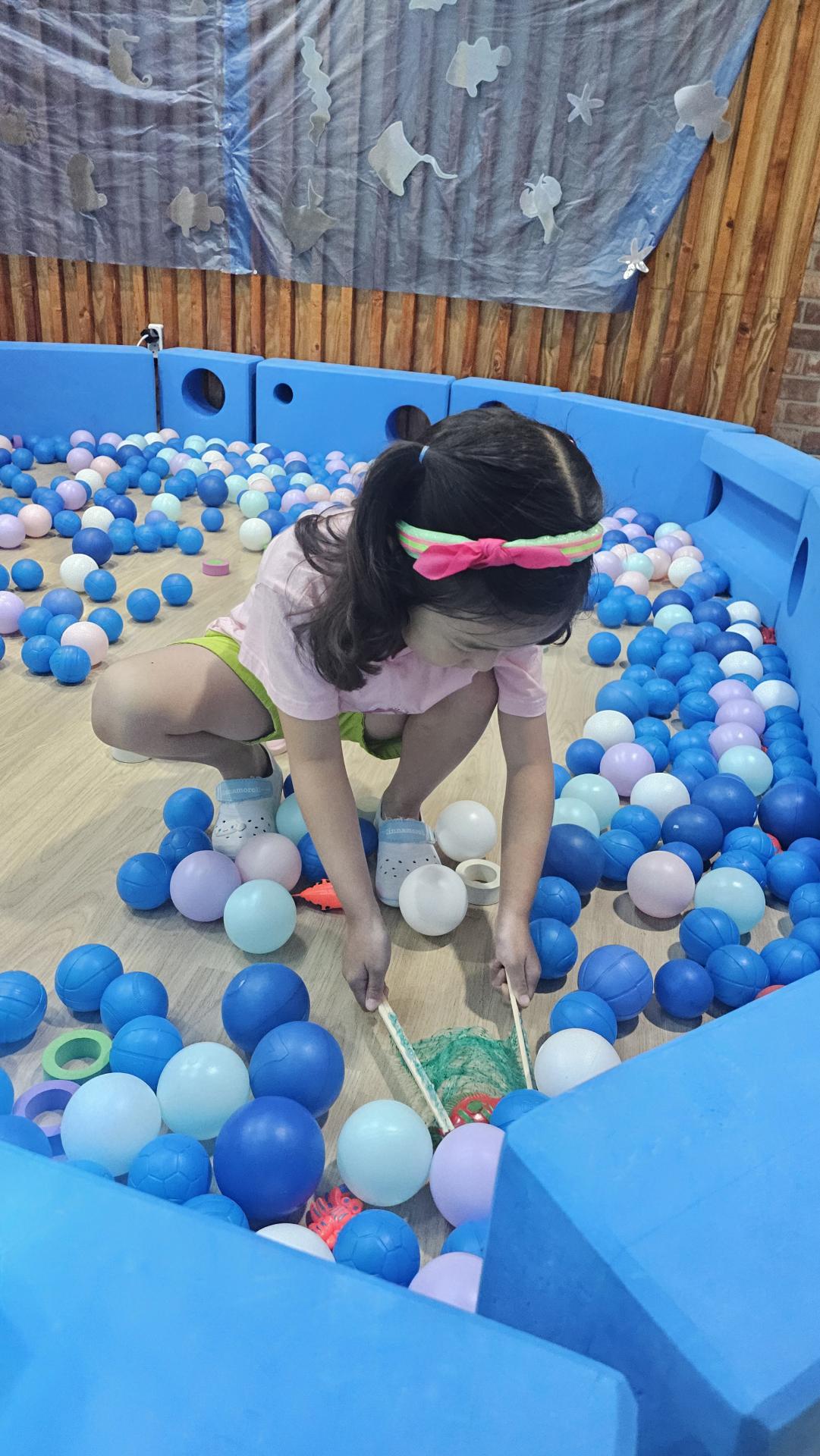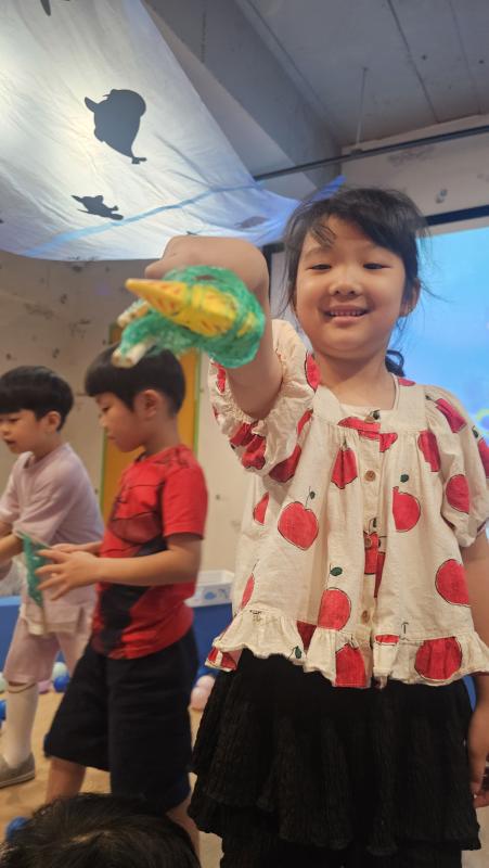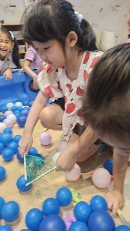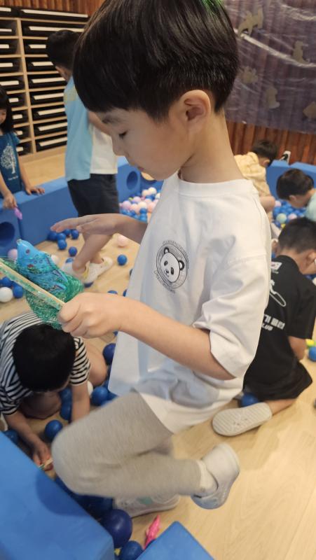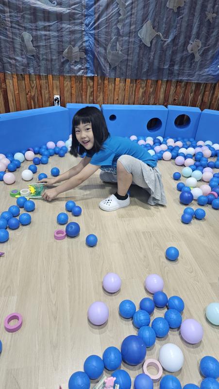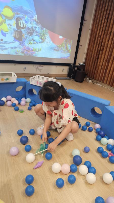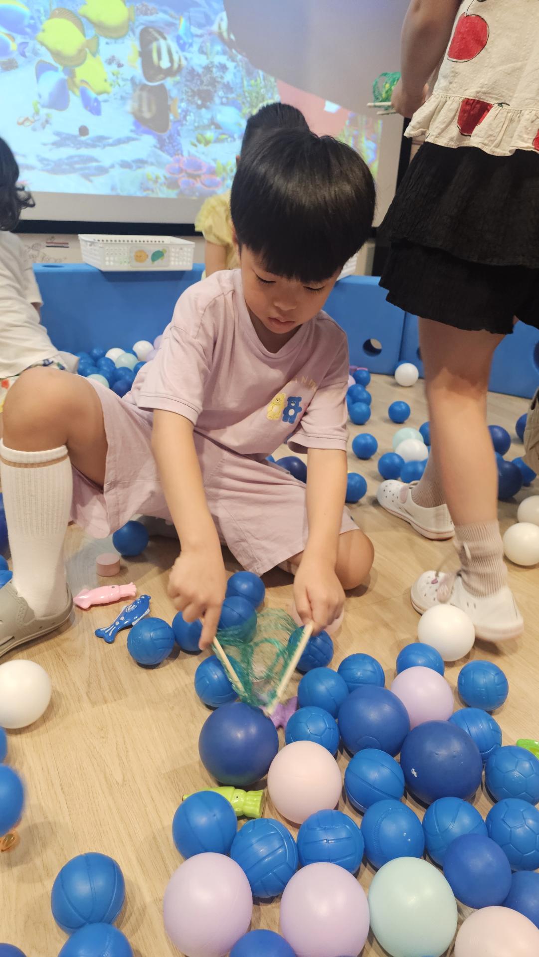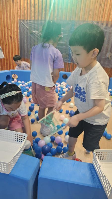 오늘은 교실이 멋진 아쿠아리움으로 변신했어요 🐠낚시 그물로 물고기를 잡고, 볼풀공을 시원한 물로 상상하며 물장구도 치며 신나게 놀았답니다. 🌊친구와 누가 더빨리 잡나 시합도 하고 시원한 하루를 보냈어요