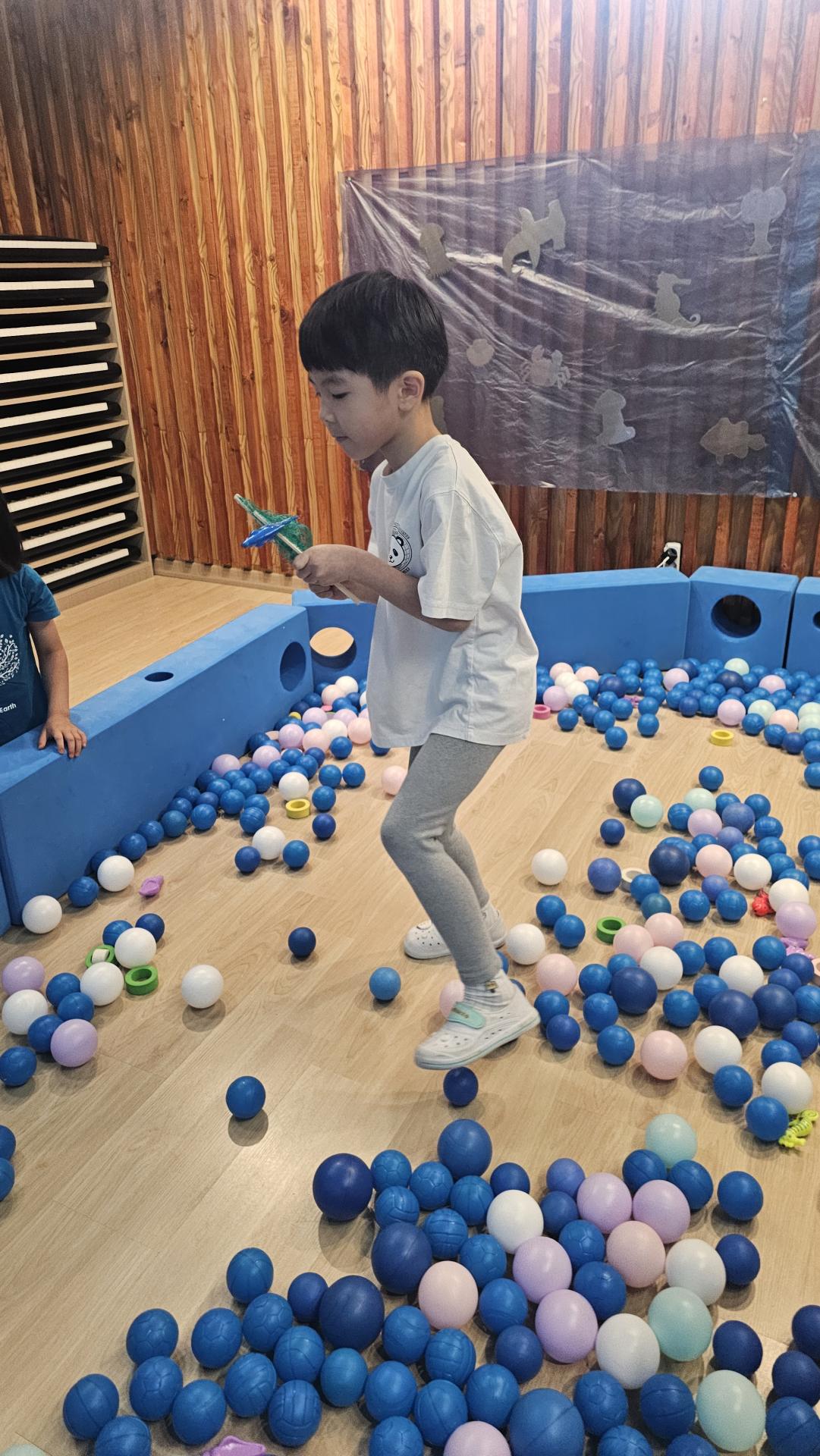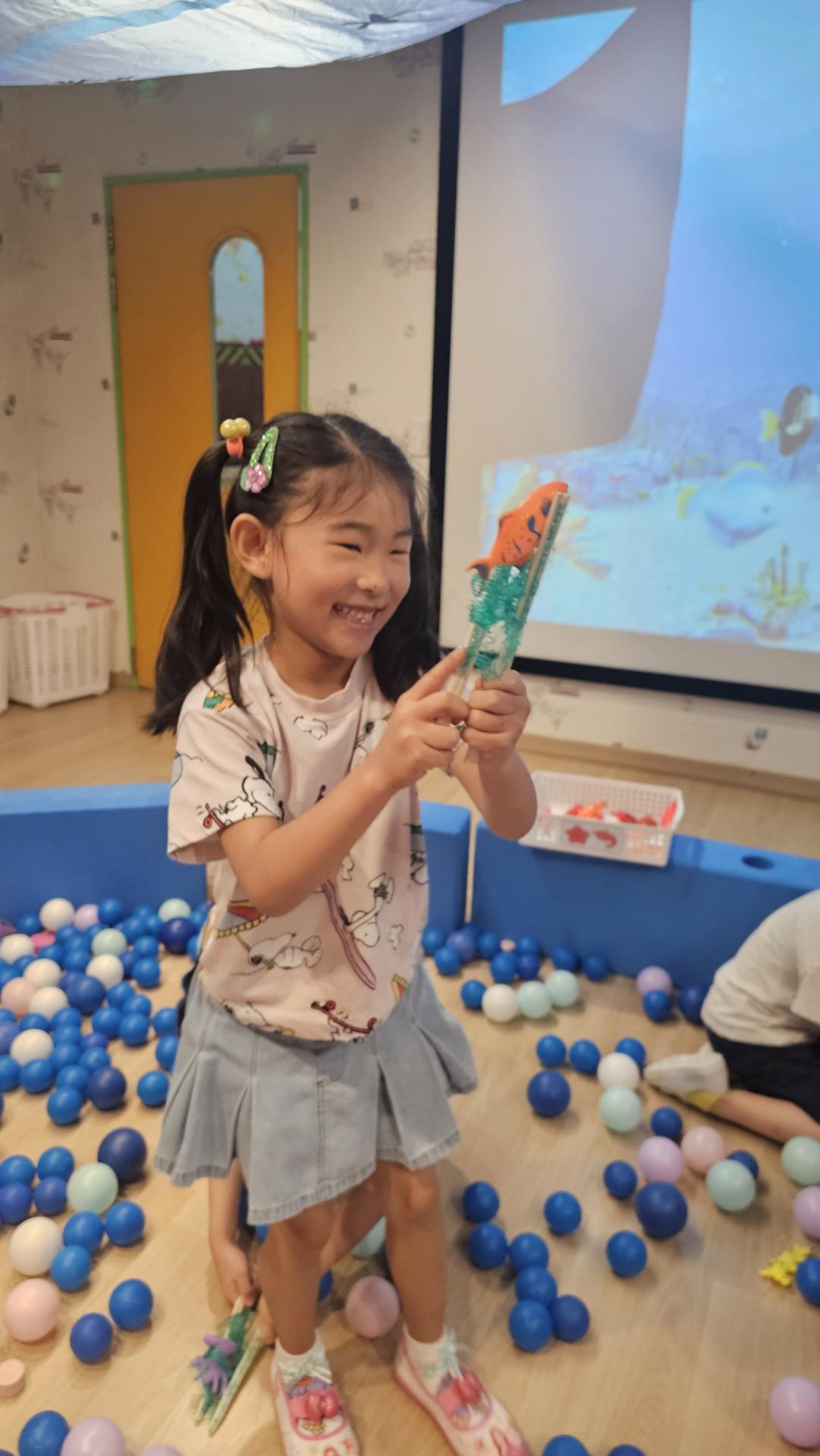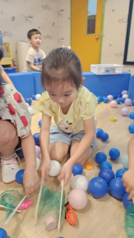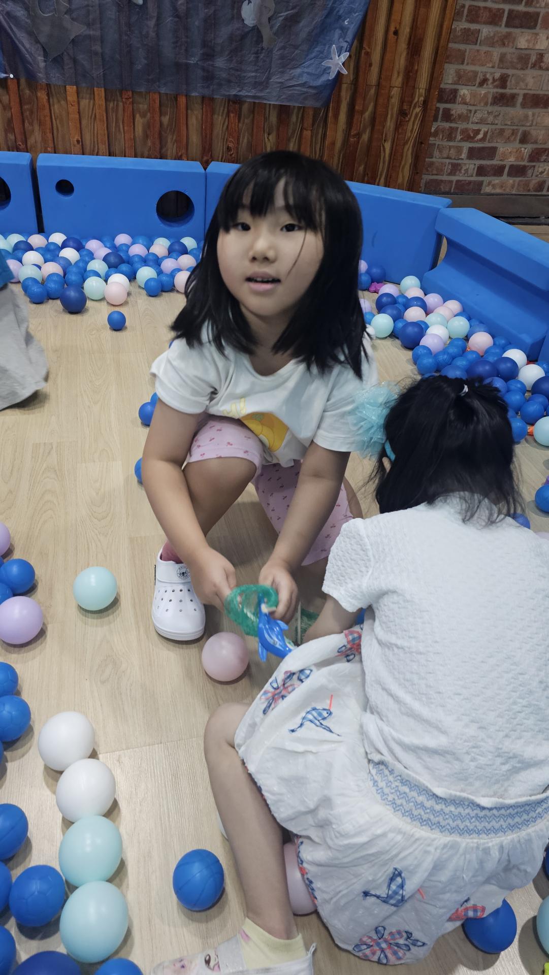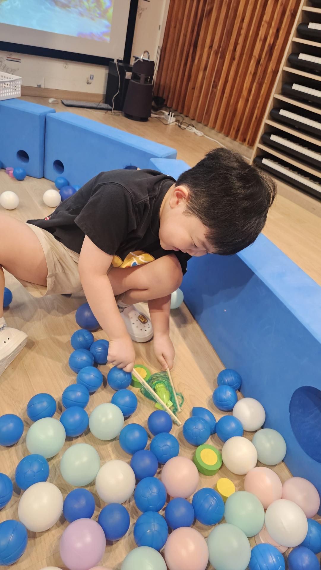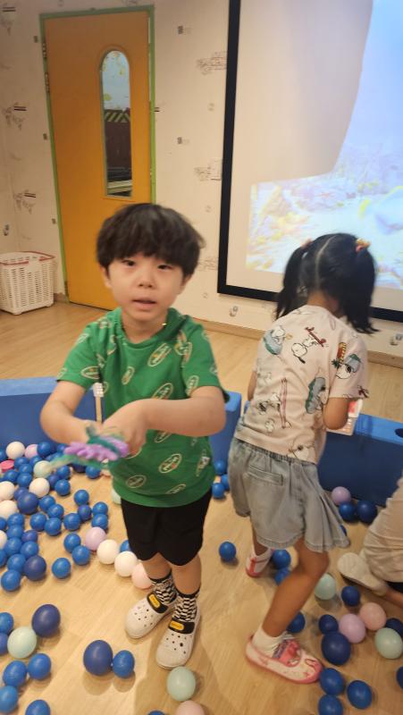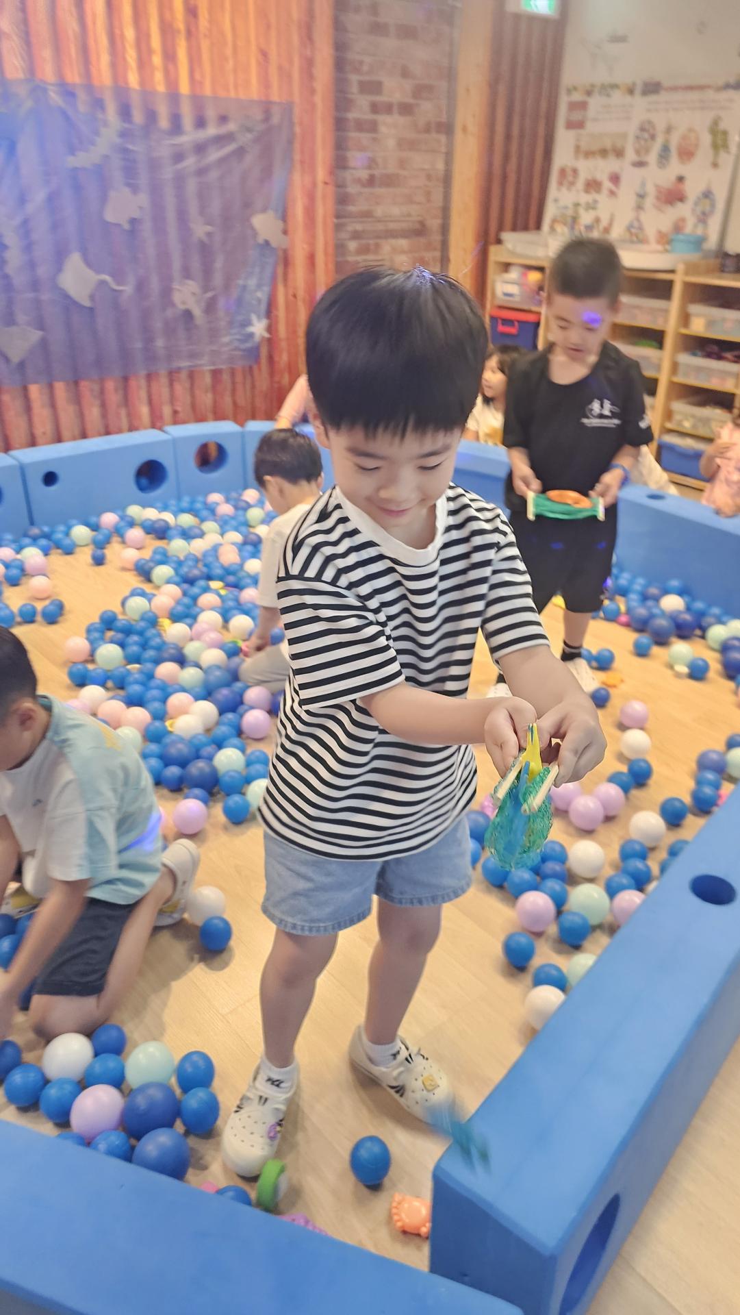 오늘은 교실이 멋진 아쿠아리움으로 변신했어요 🐠낚시 그물로 물고기를 잡고, 볼풀공을 시원한 물로 상상하며 물장구도 치며 신나게 놀았답니다. 🌊친구와 누가 더빨리 잡나 시합도 하고 시원한 하루를 보냈어요