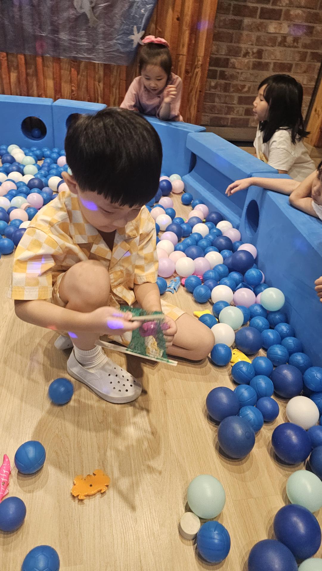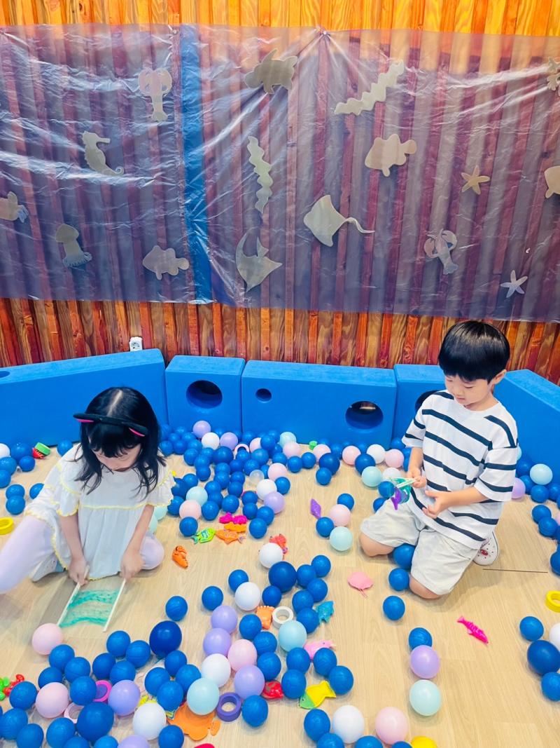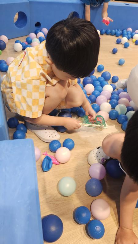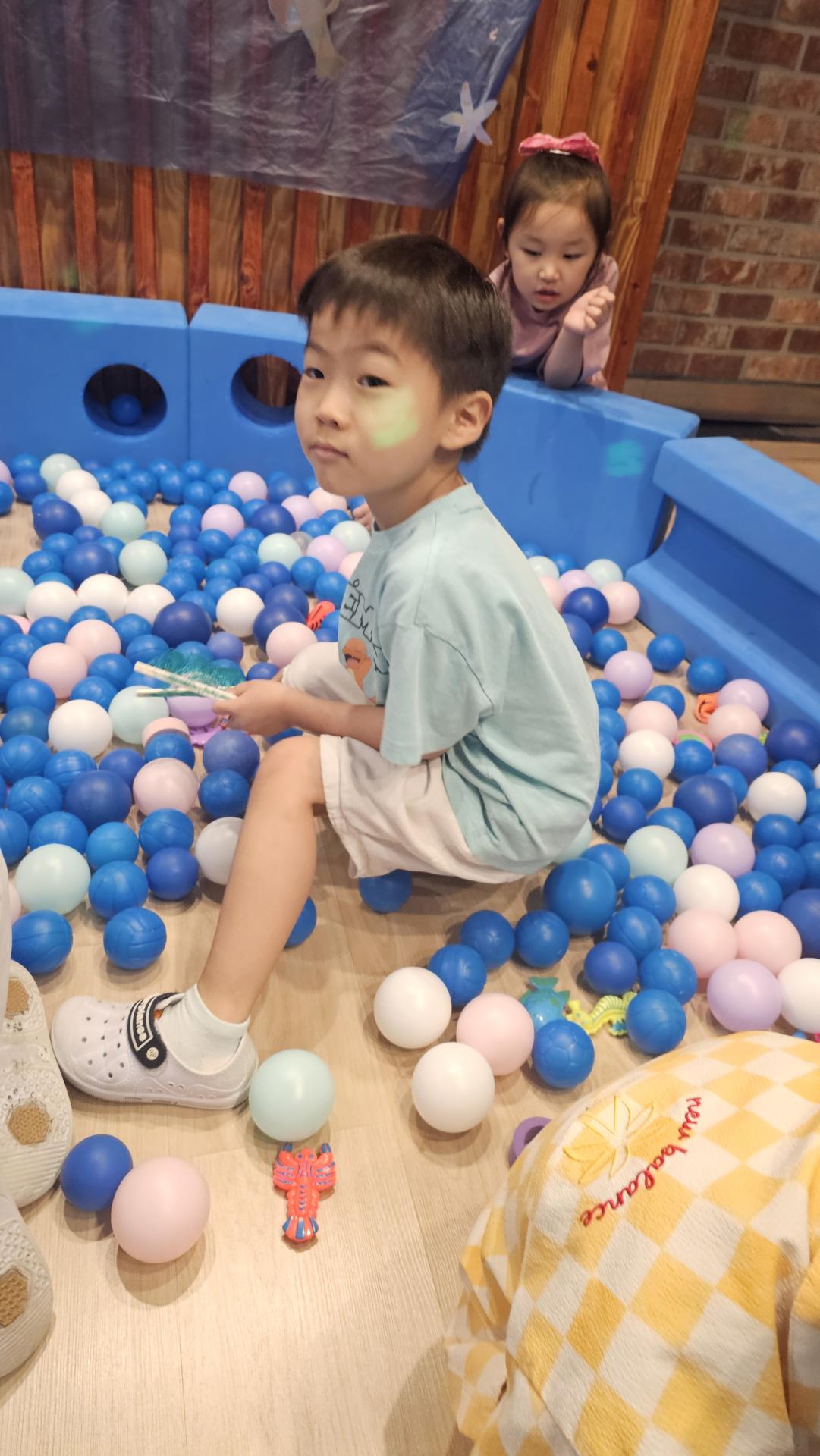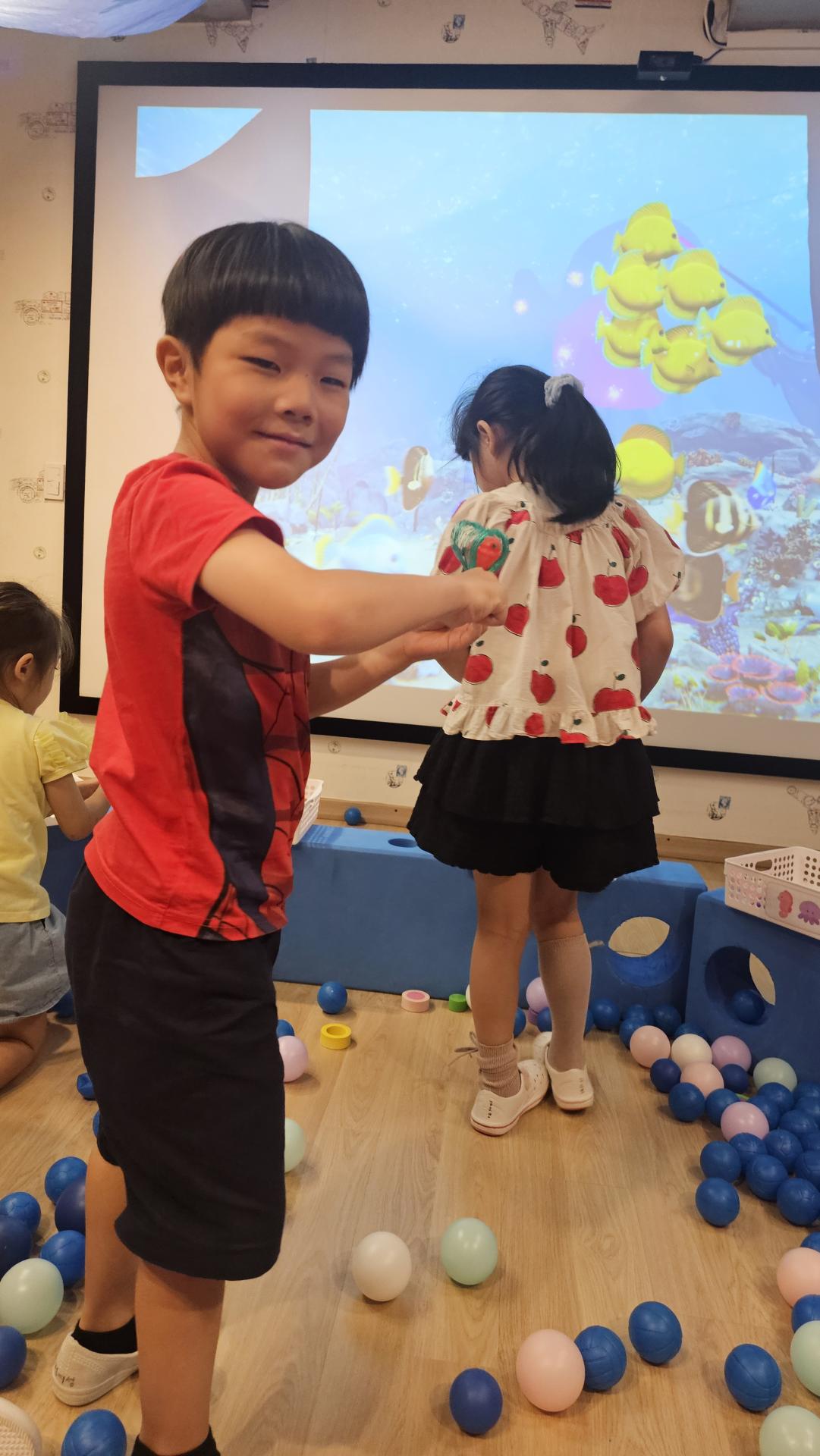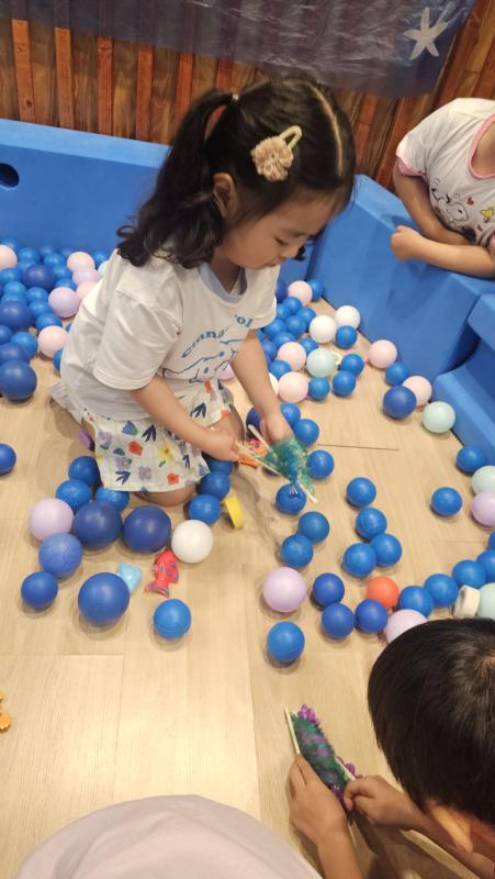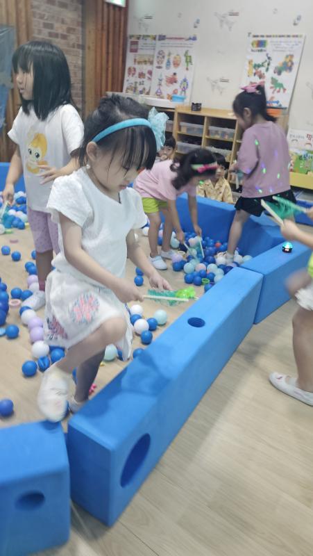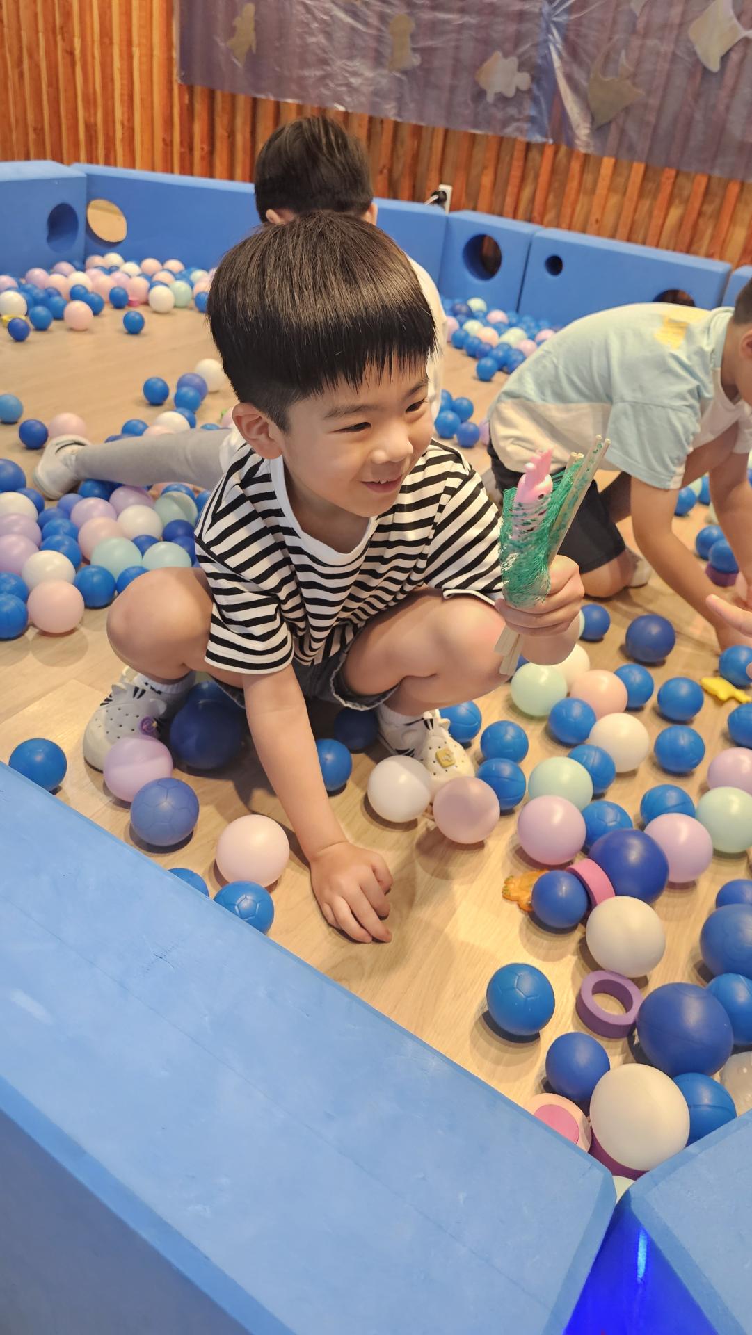 오늘은 교실이 멋진 아쿠아리움으로 변신했어요 🐠낚시 그물로 물고기를 잡고, 볼풀공을 시원한 물로 상상하며 물장구도 치며 신나게 놀았답니다. 🌊친구와 누가 더빨리 잡나 시합도 하고 시원한 하루를 보냈어요