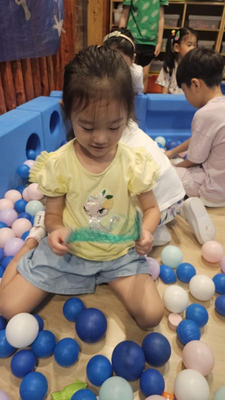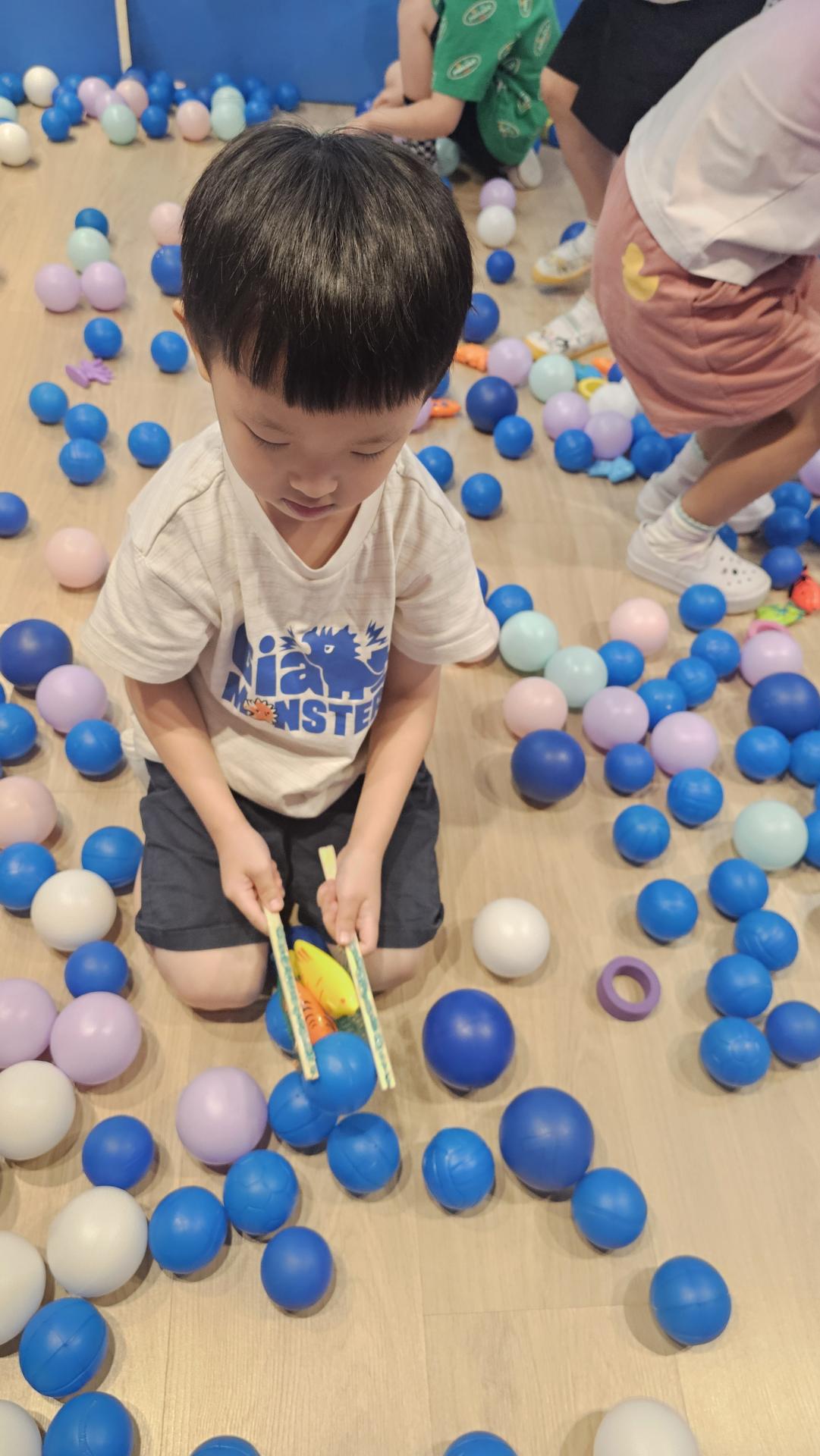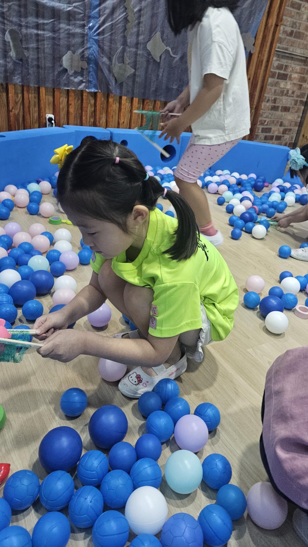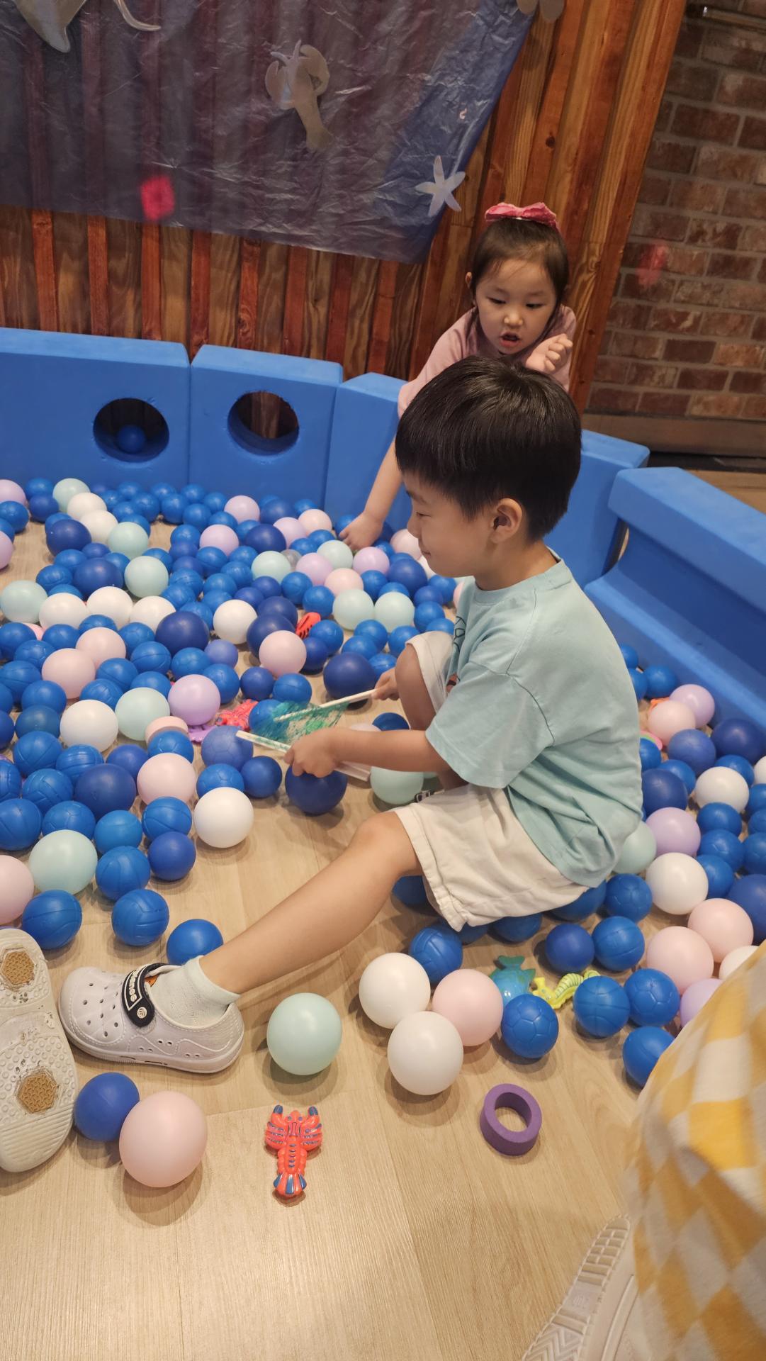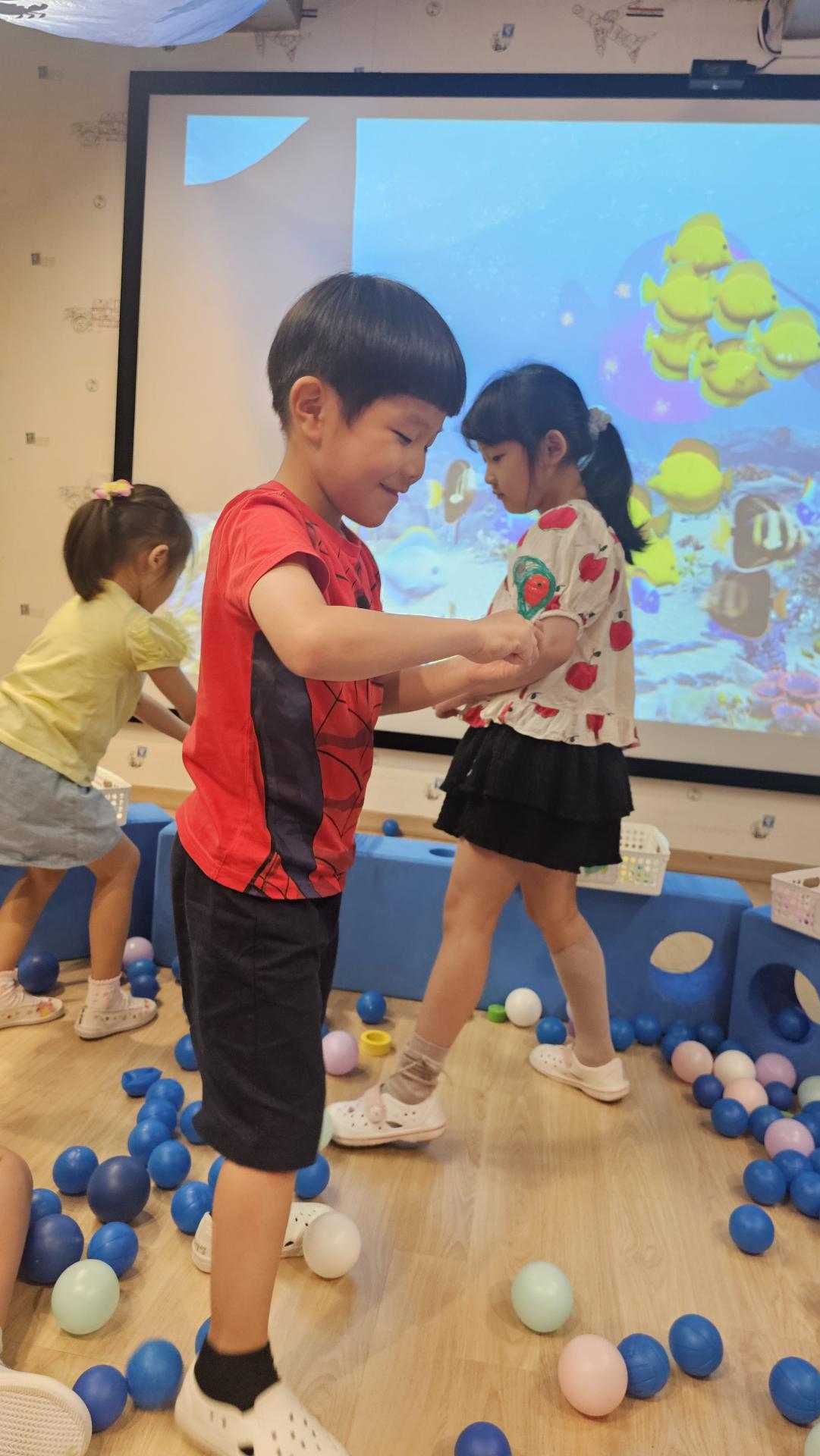 오늘은 교실이 멋진 아쿠아리움으로 변신했어요 🐠낚시 그물로 물고기를 잡고, 볼풀공을 시원한 물로 상상하며 물장구도 치며 신나게 놀았답니다. 🌊친구와 누가 더빨리 잡나 시합도 하고 시원한 하루를 보냈어요