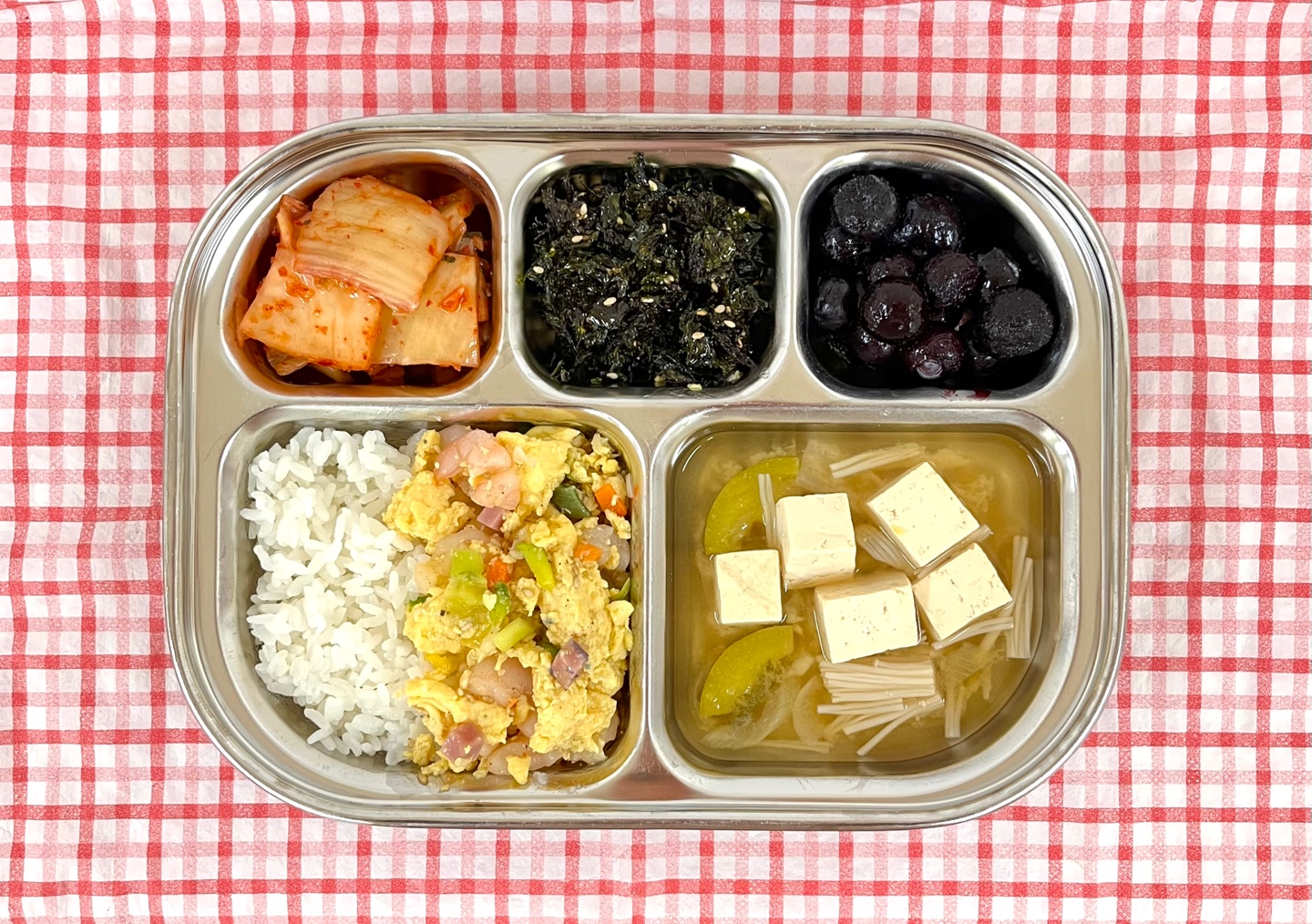 새우계란덮밥 팽이미소국 김자반 포기김치 블루베리 오후간식콘푸레이크 우유 | 3 점심