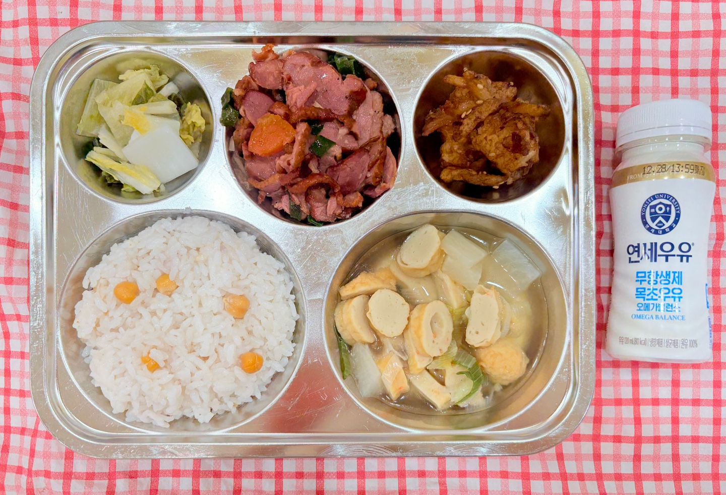 보리밥 북어무채국 LA갈비찜 무생채 백김치 우유 803021500236 002186810426 오후간식게살죽 요구르트 | 10 점심