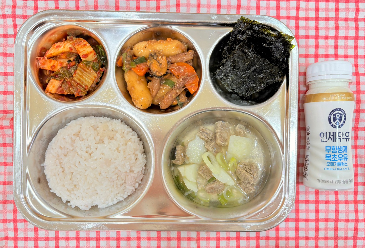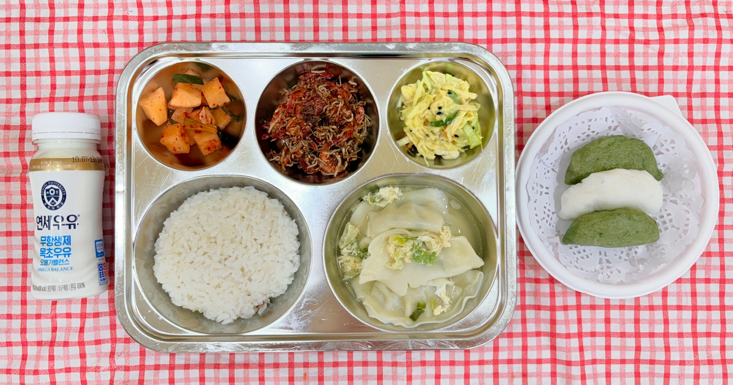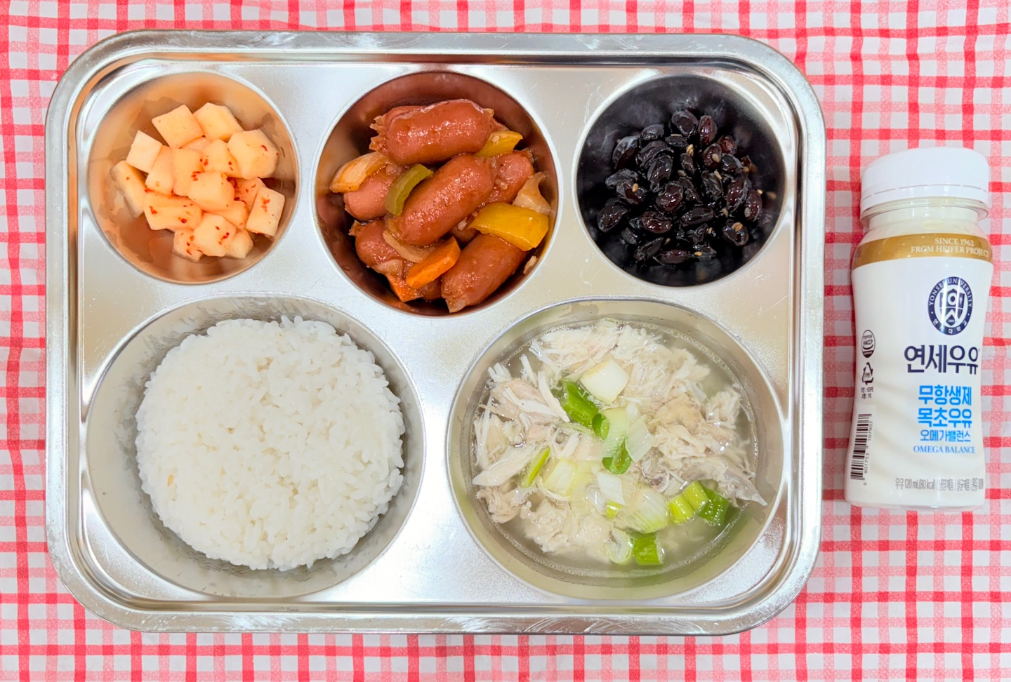 백미밥 닭곰탕 비엔나피망볶음 콩자반 깍두기 우유 오후간식소고기야채주먹밥 단무지 | 23 점심