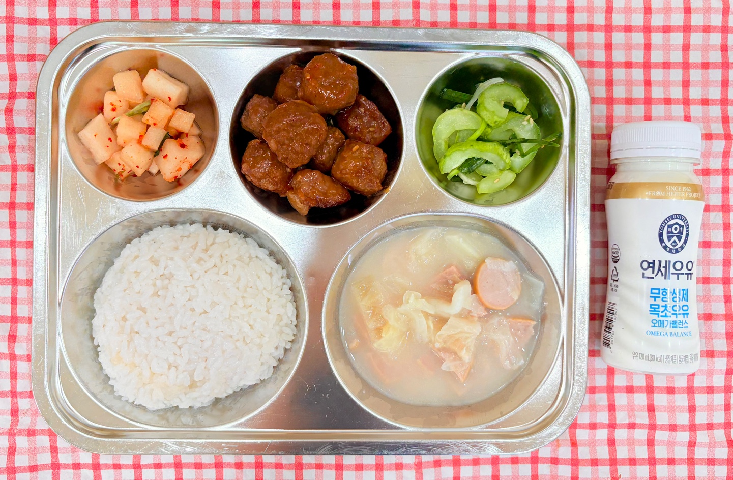 백미밥 사골부대찌개 미트볼케찹조림 부추오이무침 깍두기 우유 오후간식약밥 단무지 | 16 점심