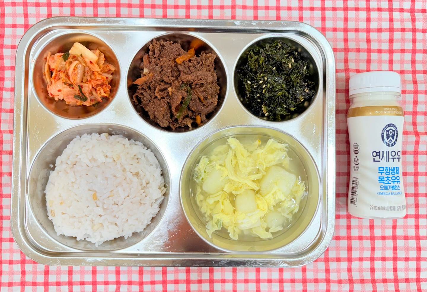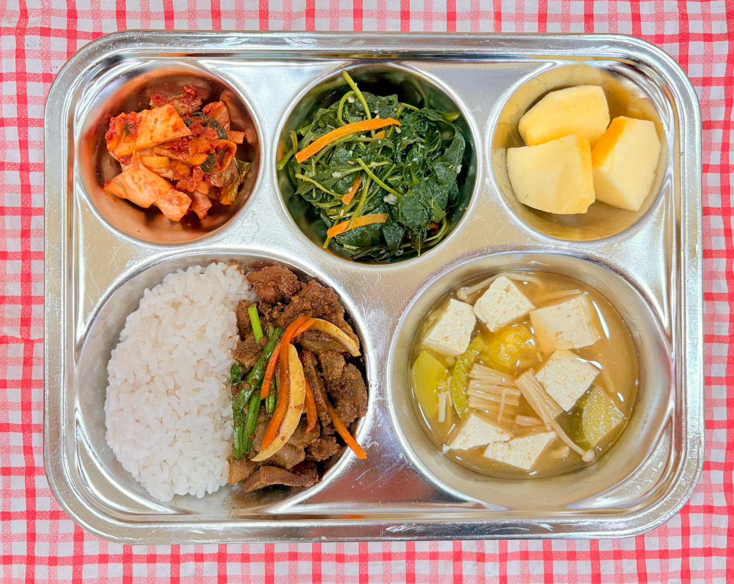 보리밥 감자계란국 소불고기 김자반 포기김치 우유 002184800234 오후간식게살죽 요구르트 | 22 점심