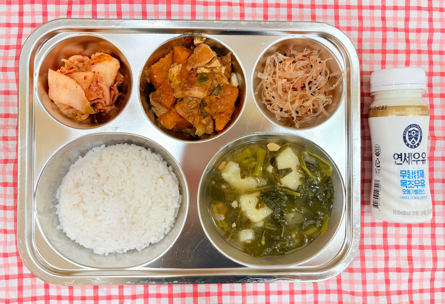 백미밥 아욱된장국 닭고기단호박조림 오징어실채볶음 포기김치 우유 오후간식어묵꼬지 짜요짜요 | 21 점심