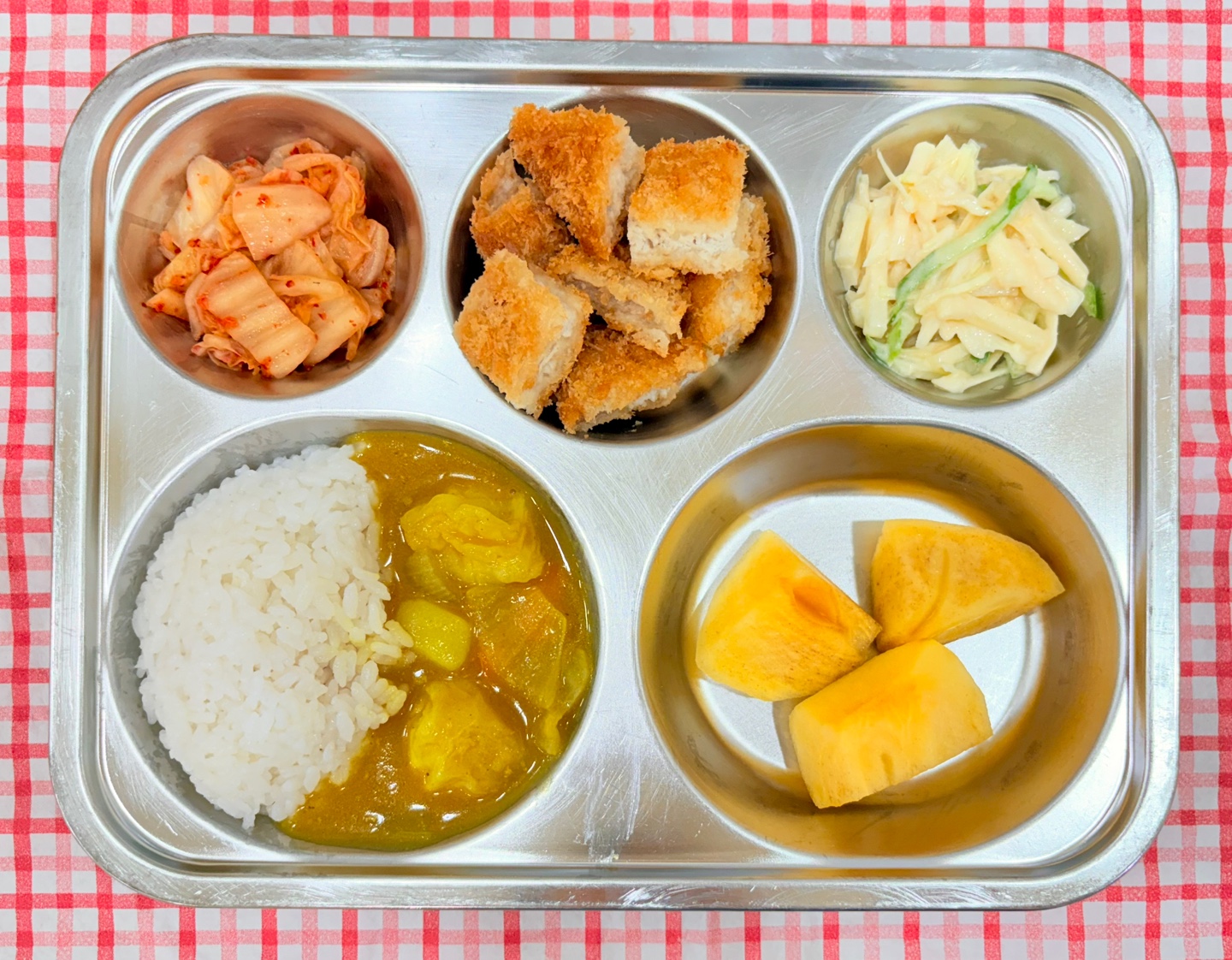 카레라이스 돈까스 양배추샐러드 포기김치 단감 130011500478 오후간식밤만쥬 우유 | 24 점심