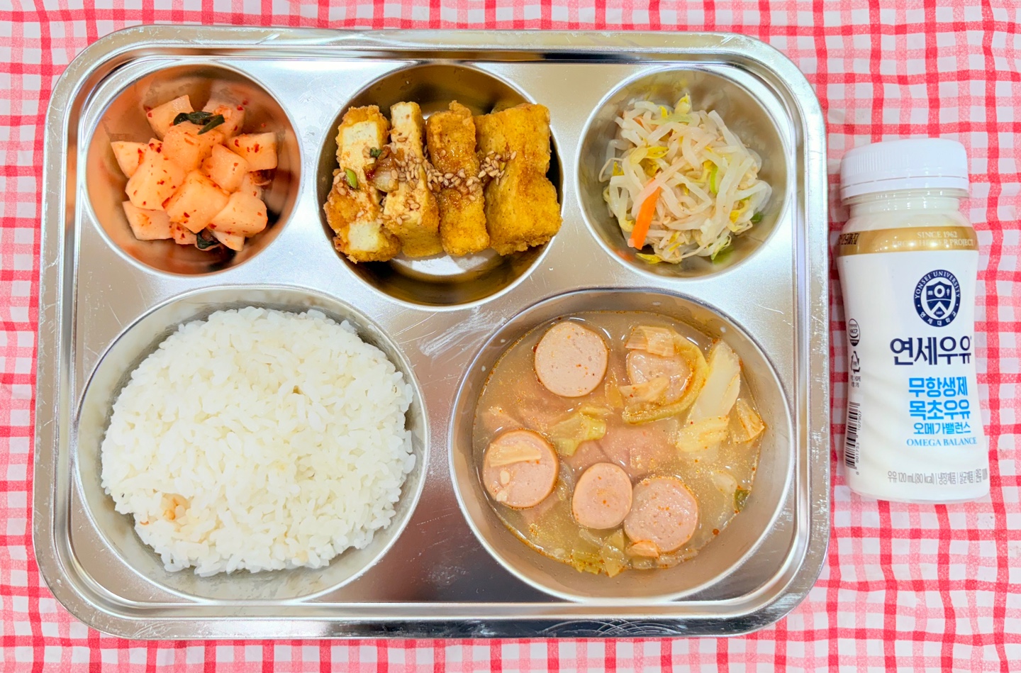 백미밥 사골부대찌개 두부카레구이 숙주나물 깍두기 우유 오후간식소고기야채주먹밥 단무지 002186810426 | 25 | 26 점심